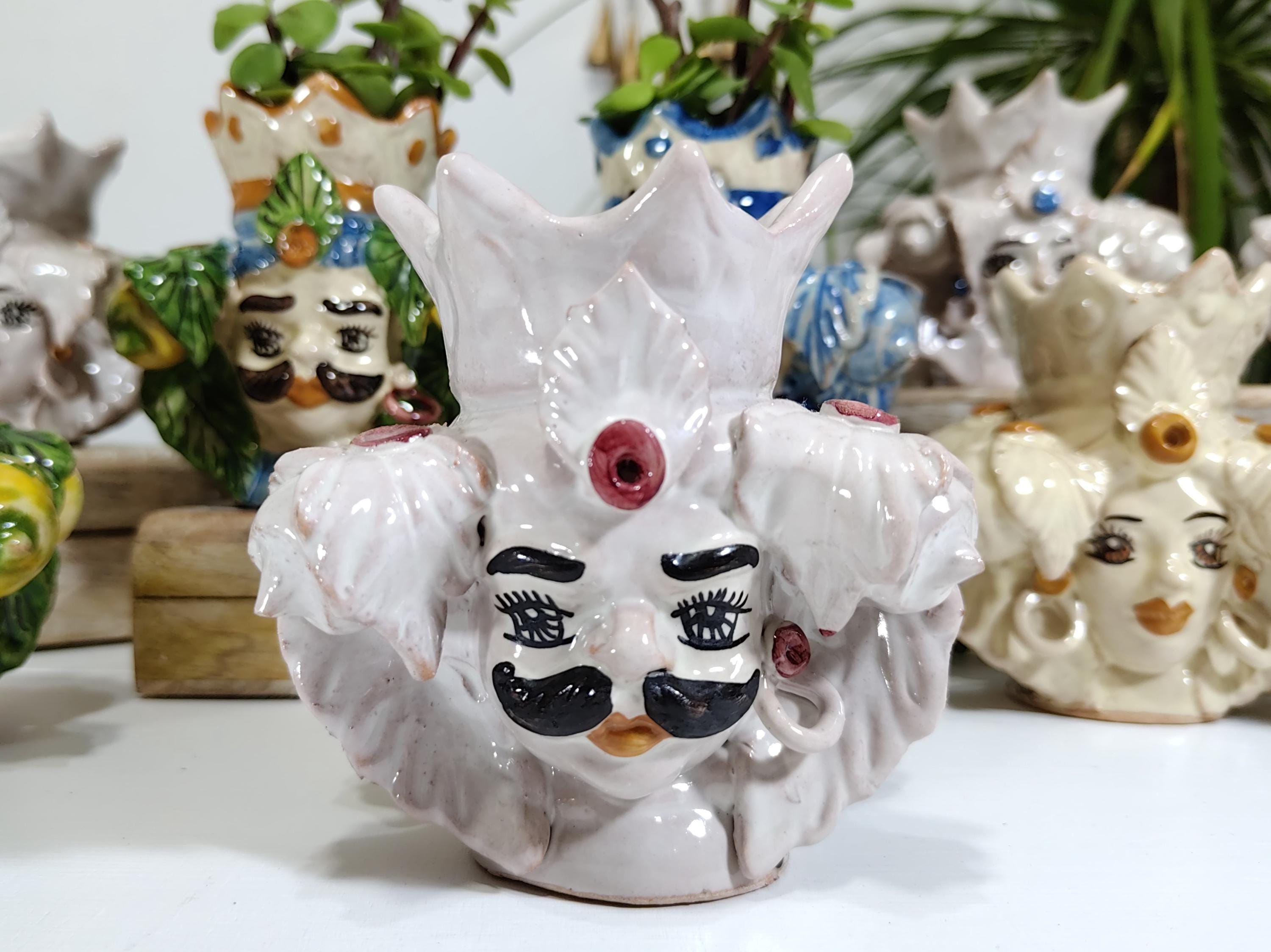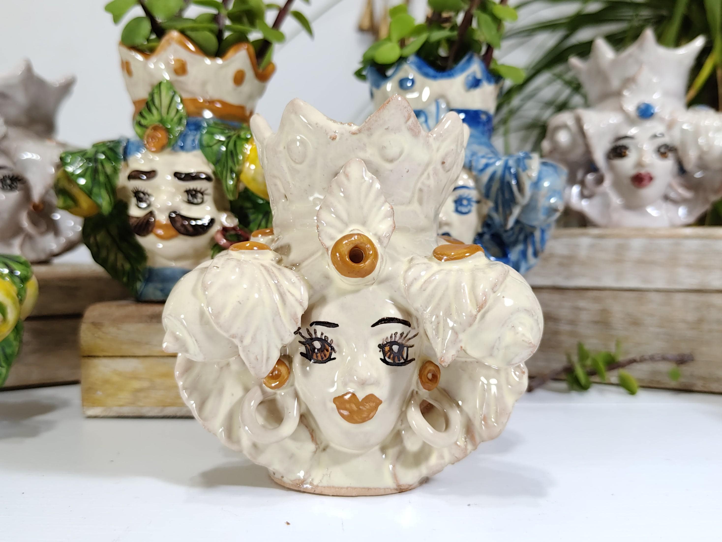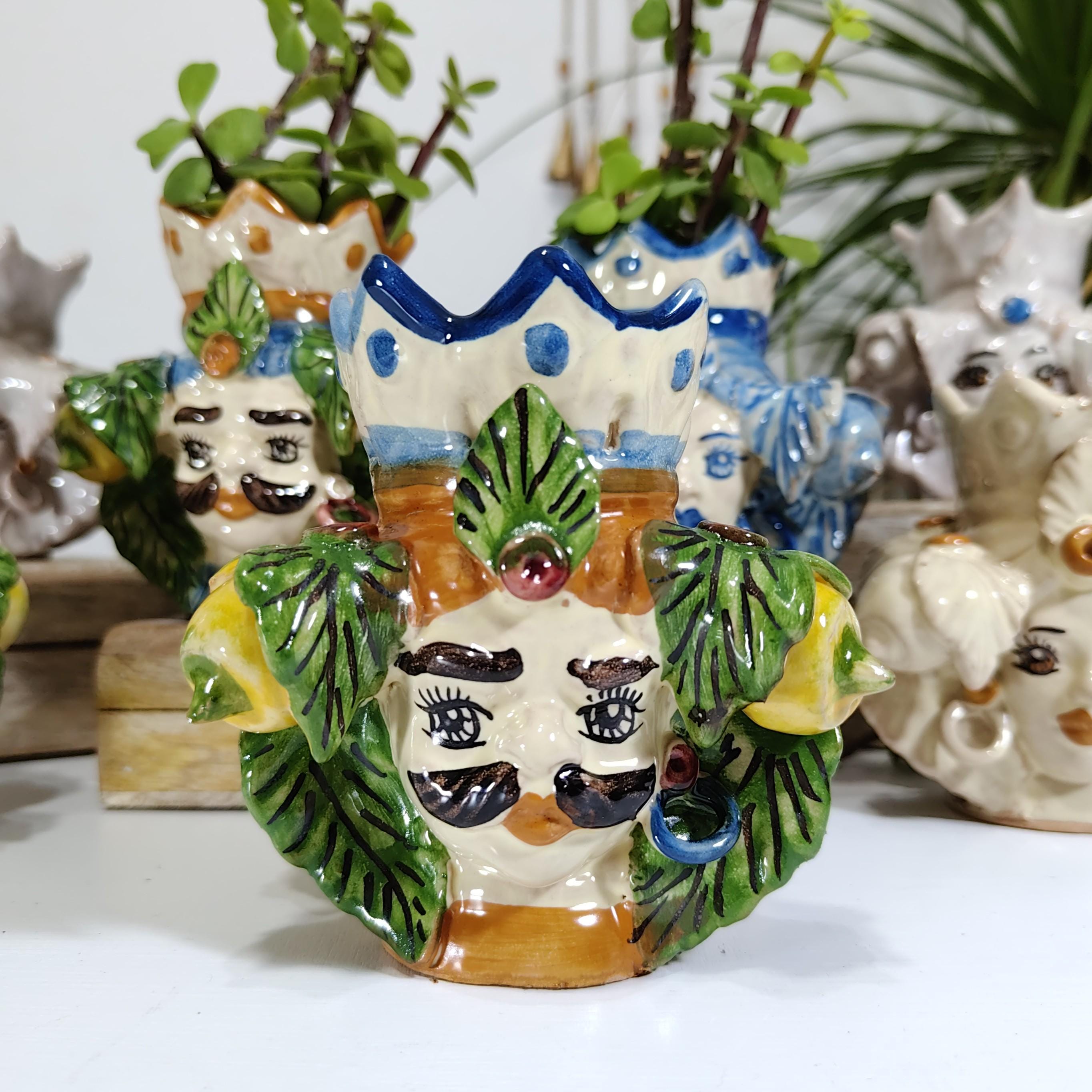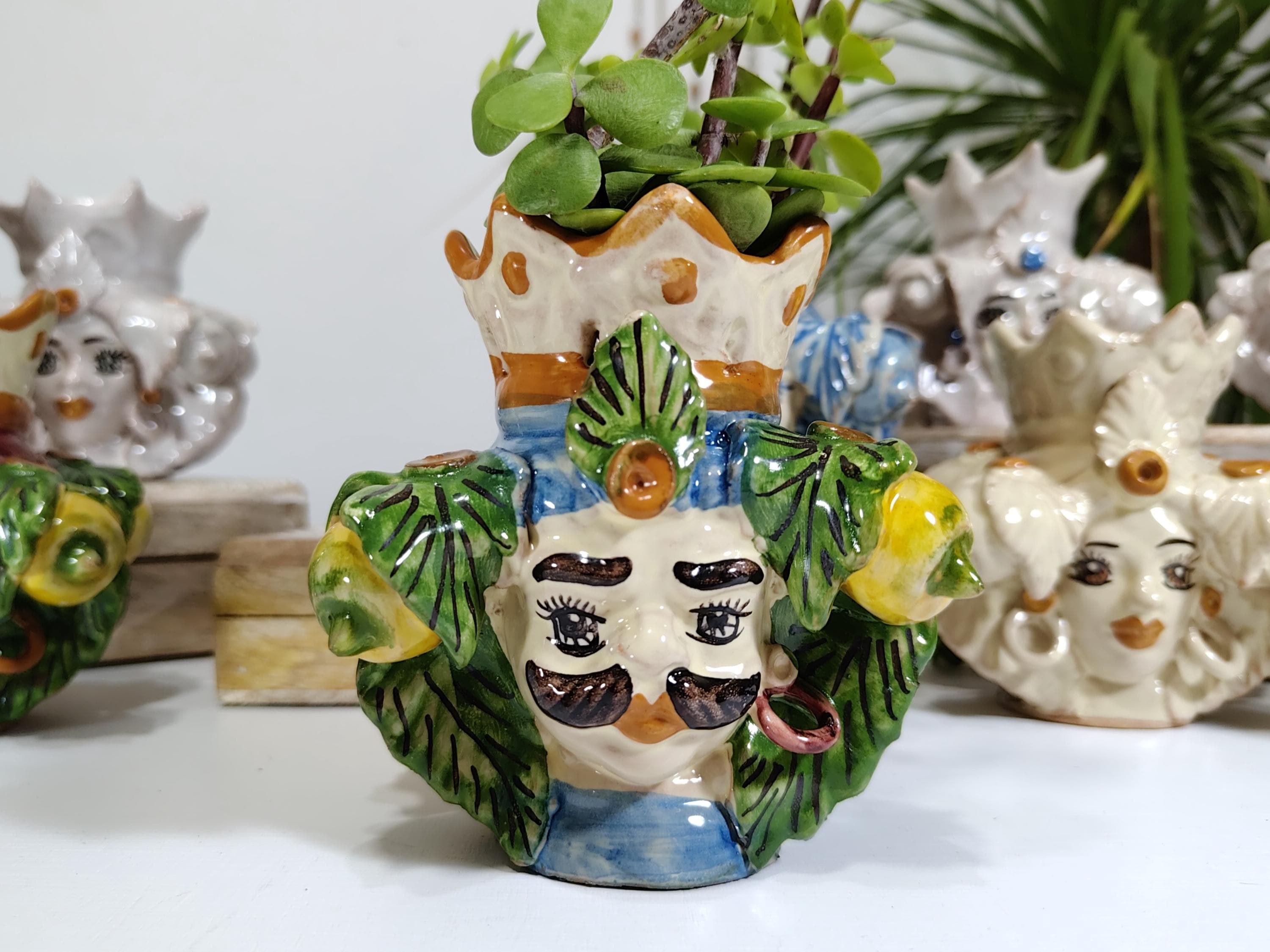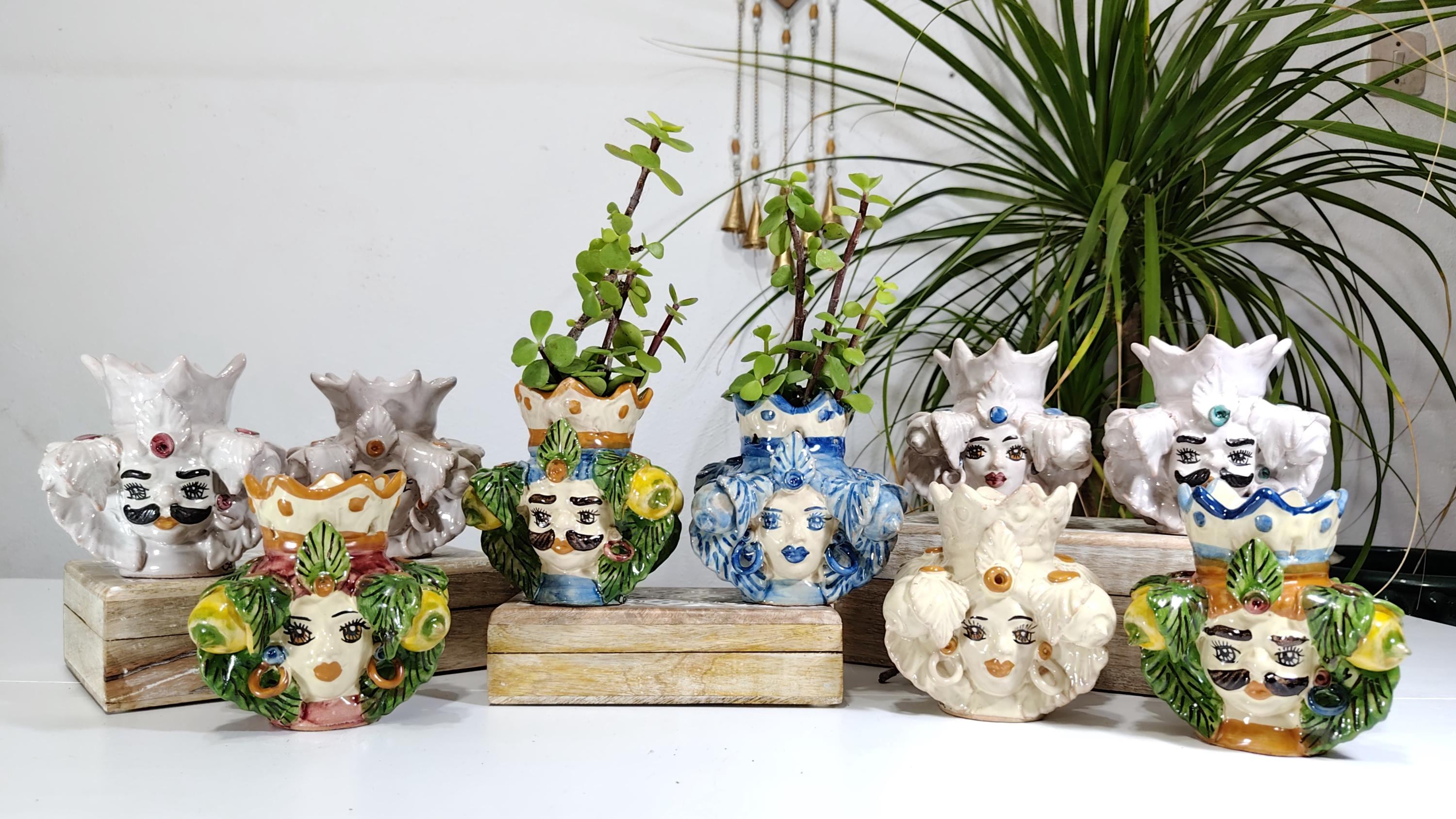 Sicilian Moorish heads in Caltagirone ceramic, entirely handcrafted in shape and decoration.