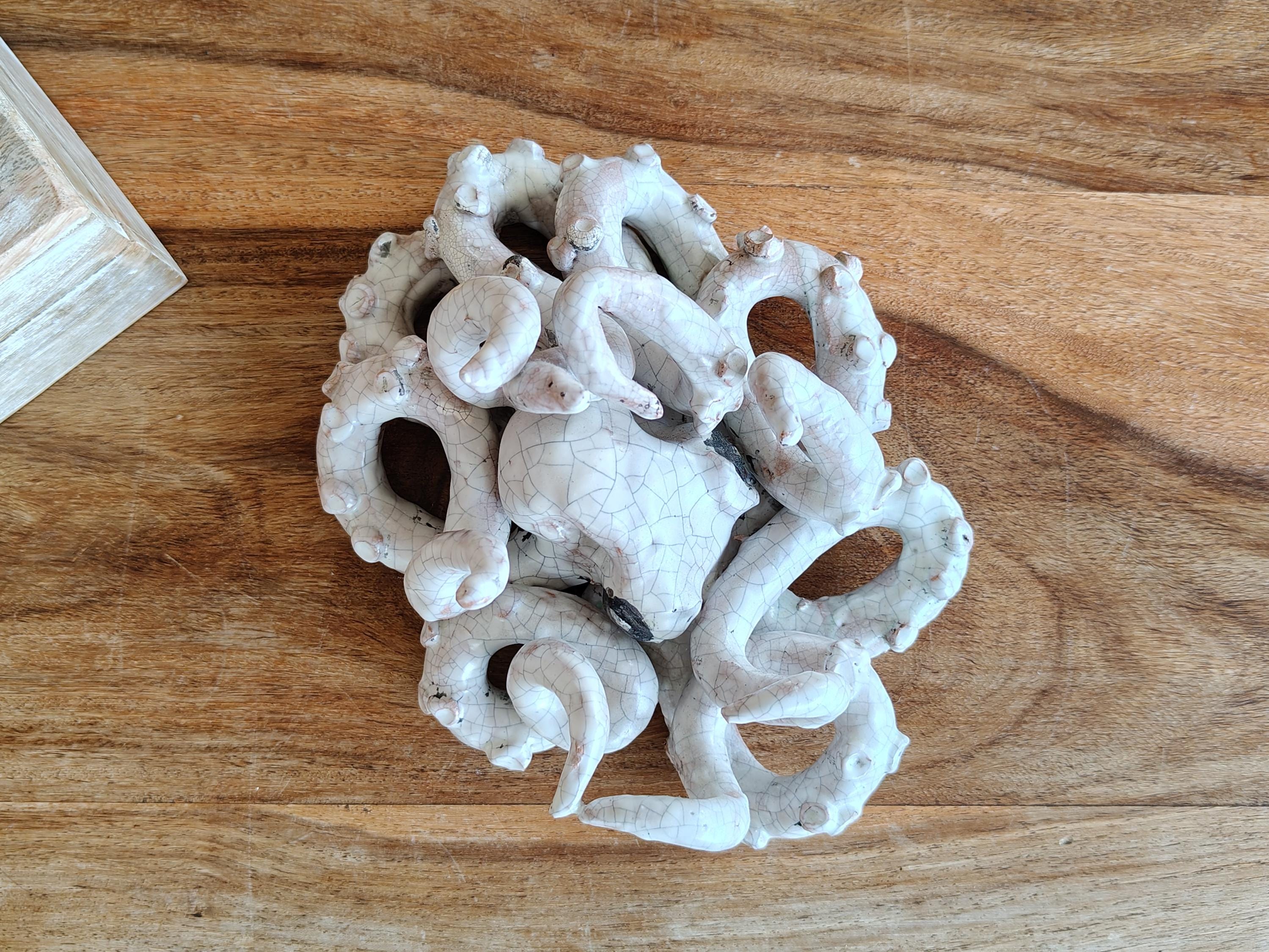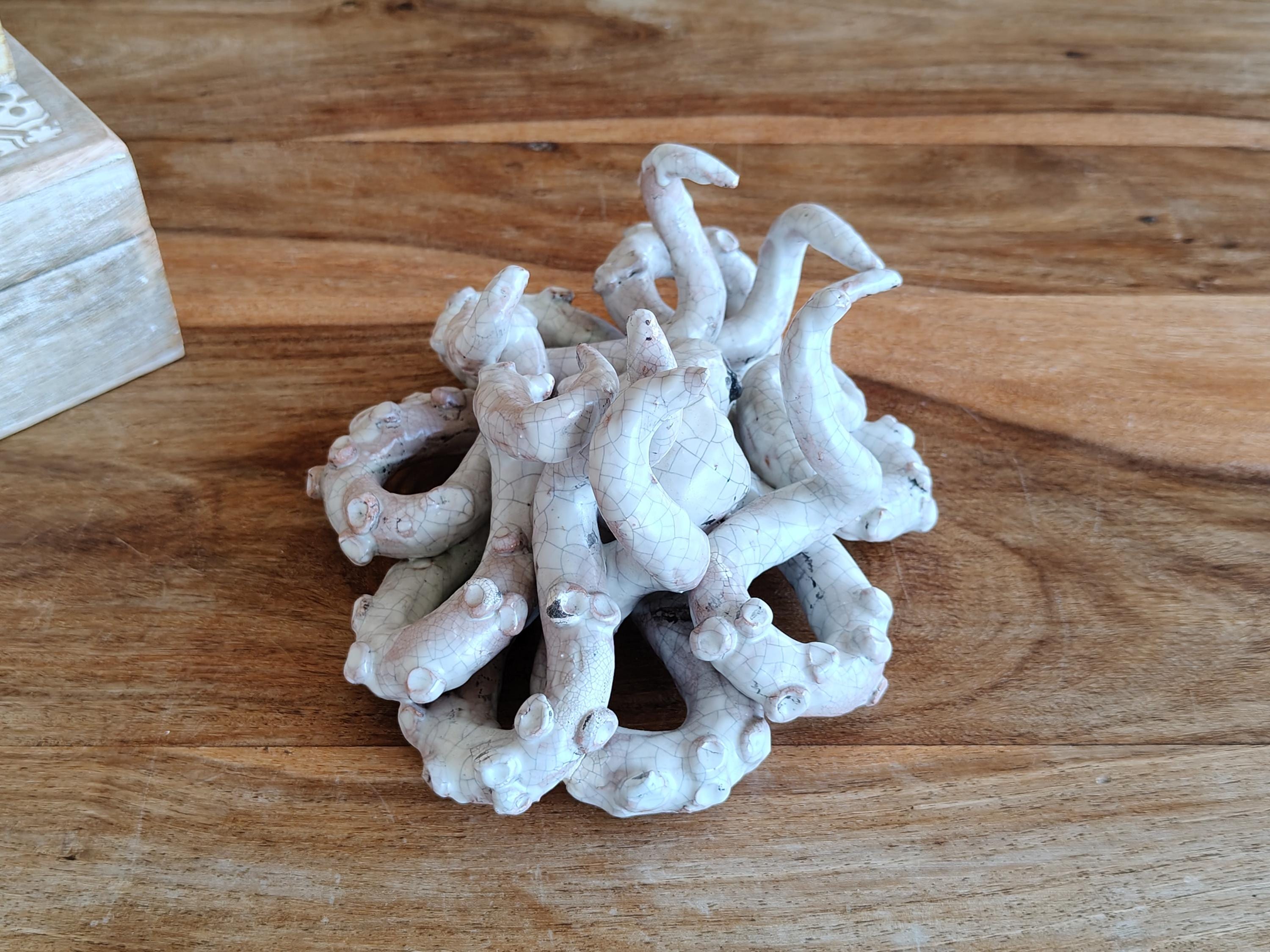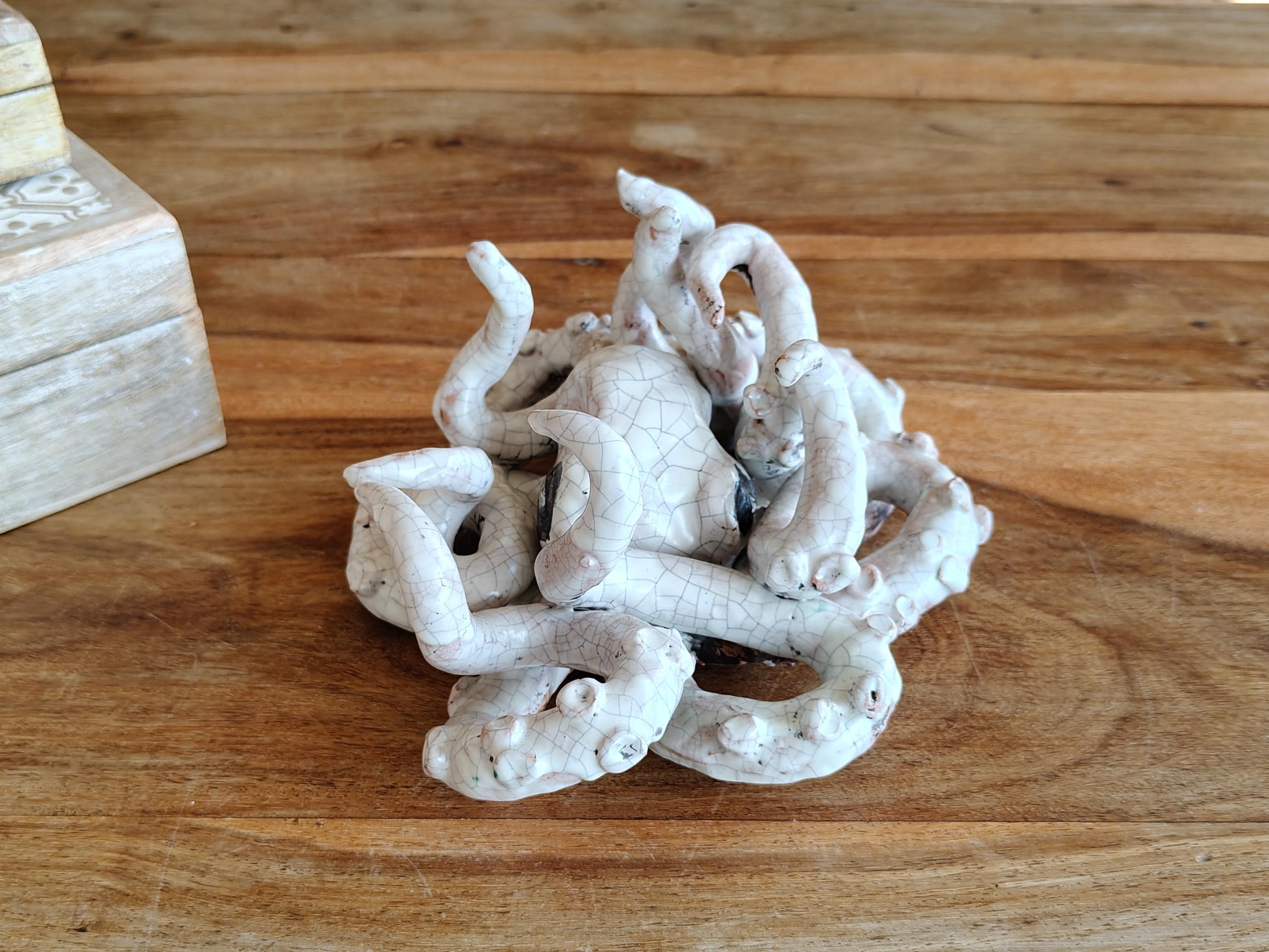 It's made of ceramic, and its most striking feature is the craquelure (or crackle) finish. This is an ivory glaze with a dense network of small surface cracks. This effect is intentional and gives the piece an antique, lived-in, or rustic chic look.