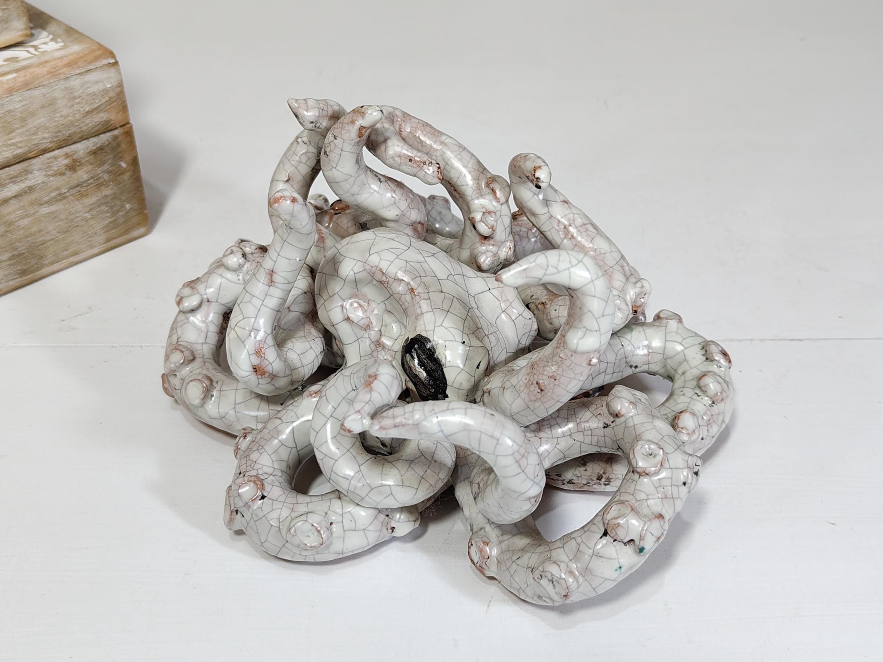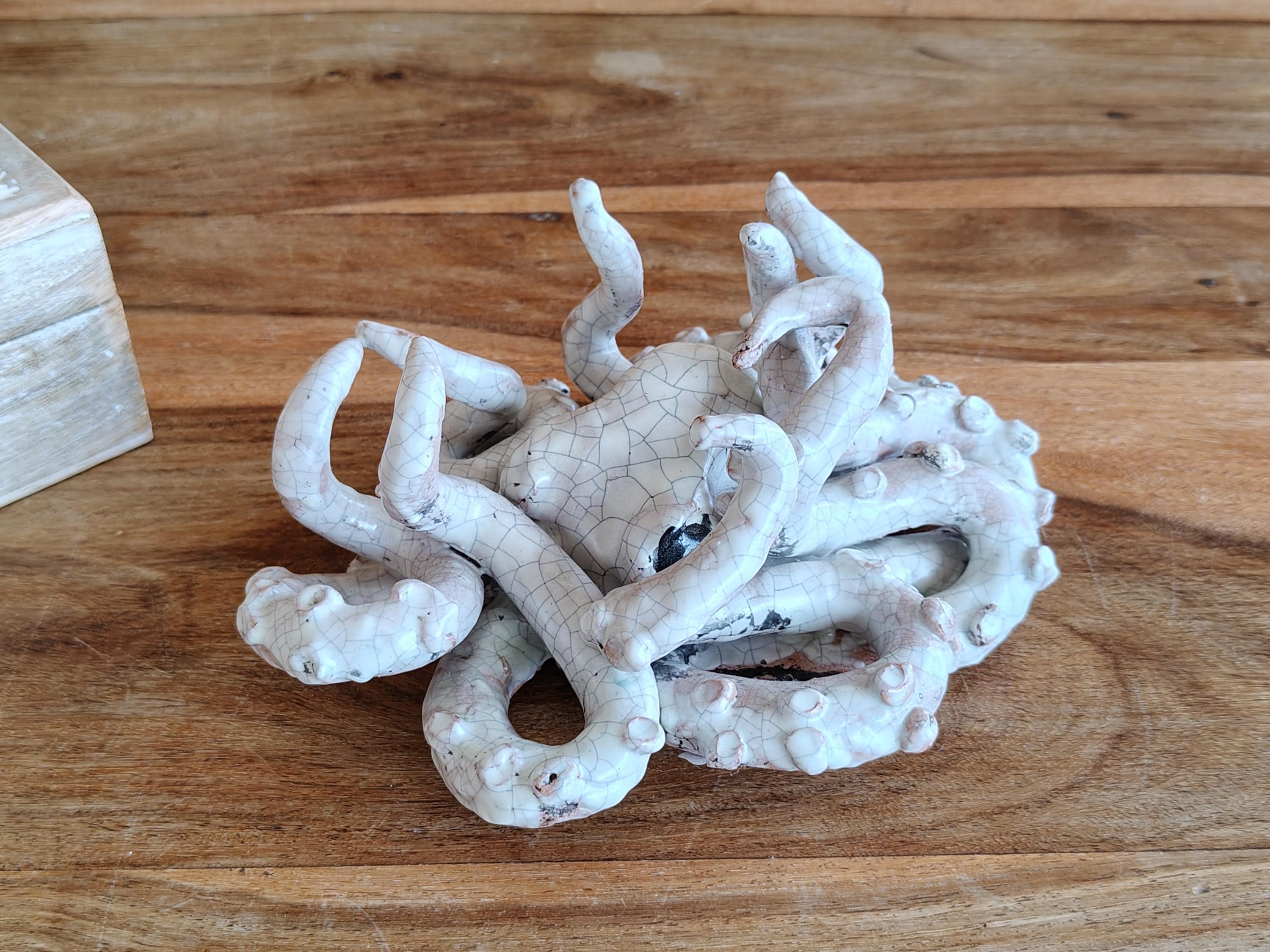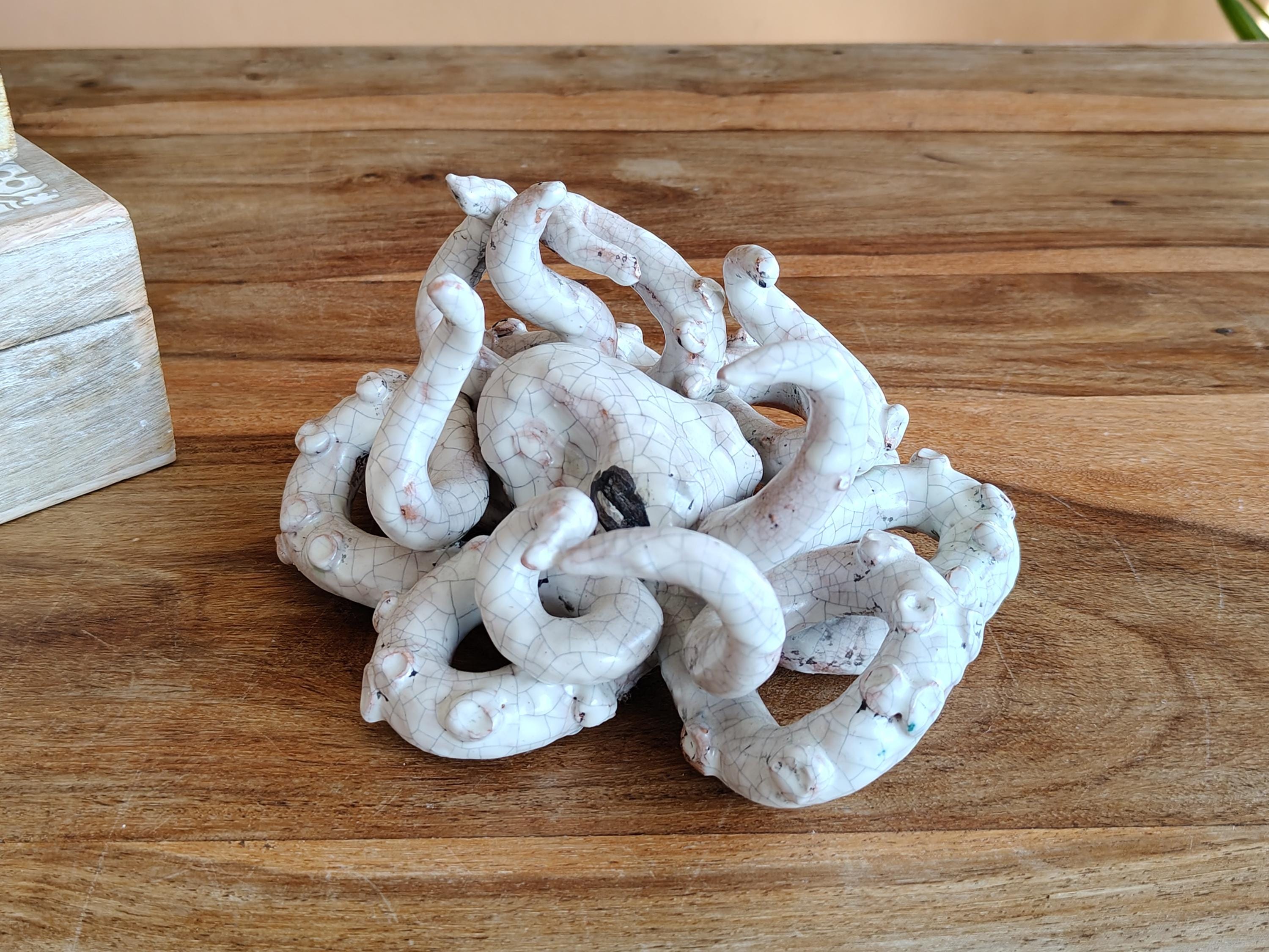 It's made of ceramic, and its most striking feature is the craquelure (or crackle) finish. This is an ivory glaze with a dense network of small surface cracks. This effect is intentional and gives the piece an antique, lived-in, or rustic chic look.