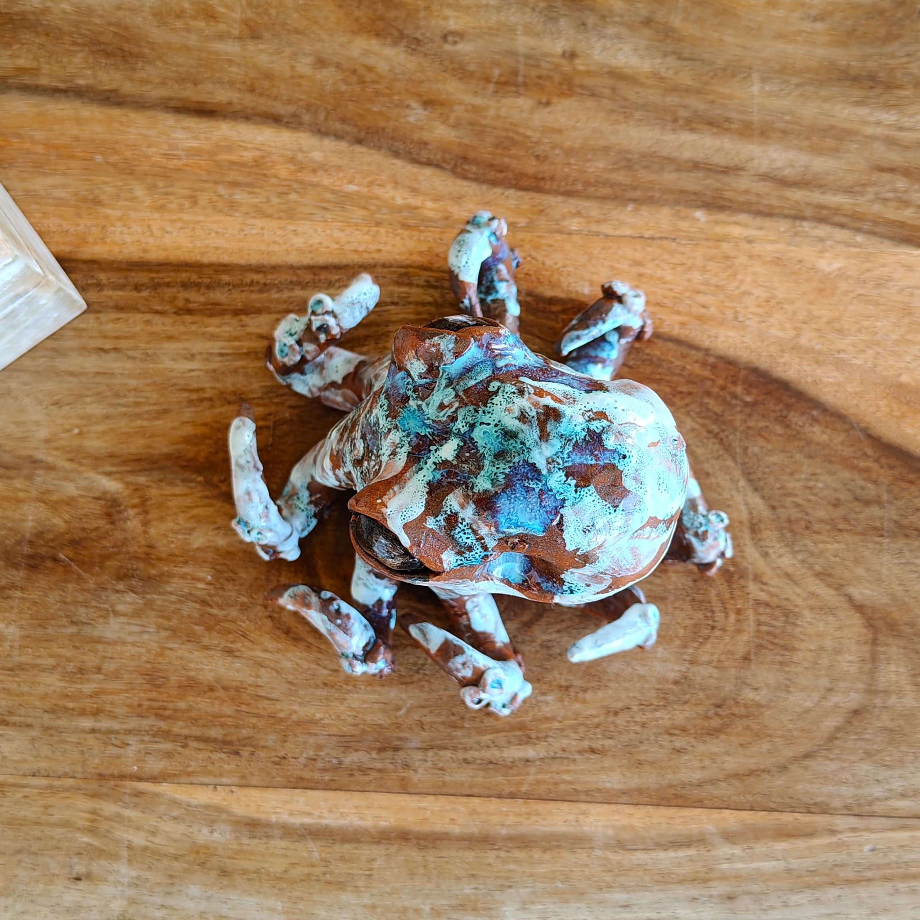 Predomina un turchese/azzurro brillante, che si alterna e si fonde con un marrone/terra cotta scuro o bronzato con contrasti di bianco spuma. Questa combinazione di colori contrastanti crea un effetto visivo molto suggestivo, enfatizzando le texture e i volumi.