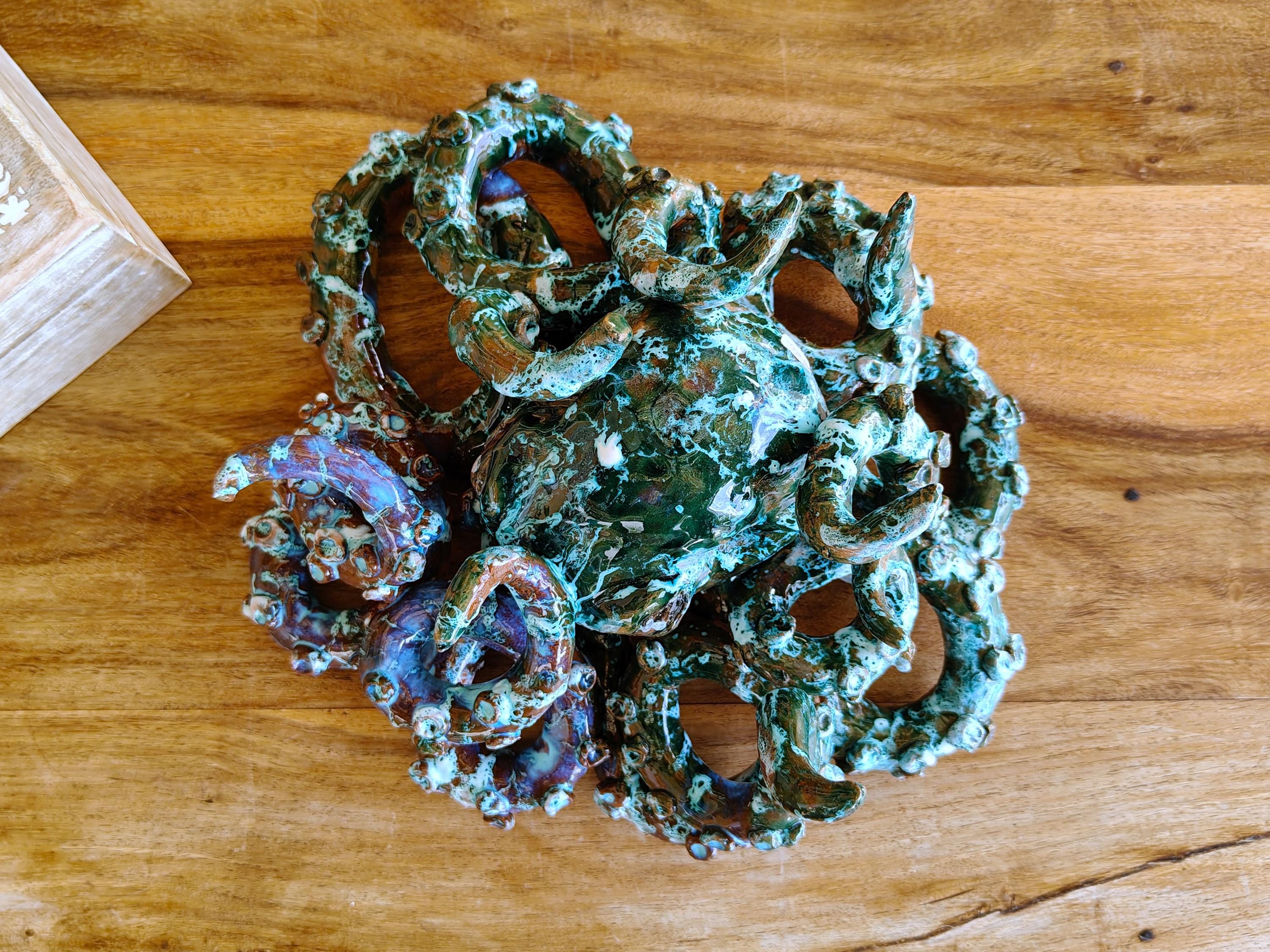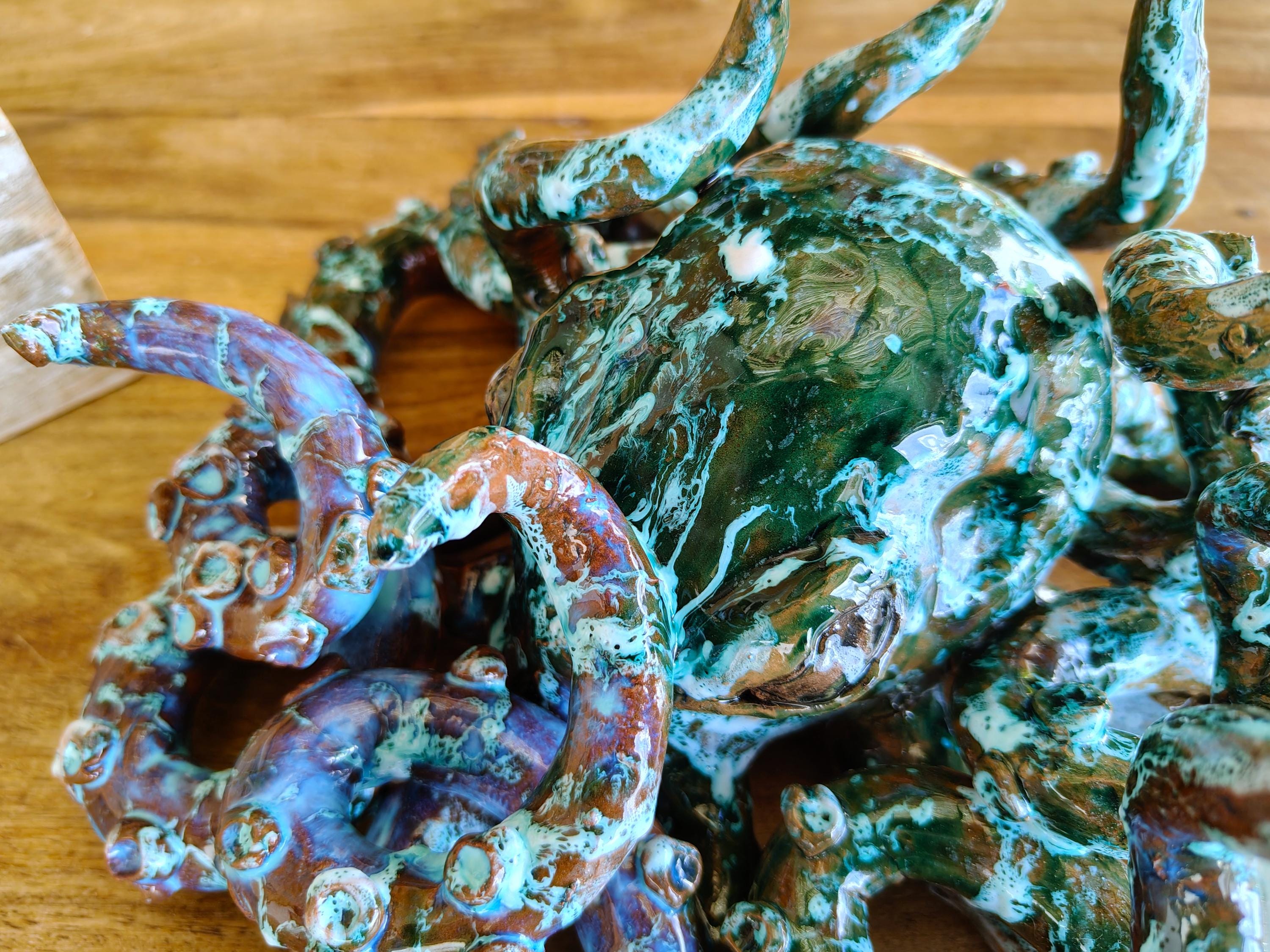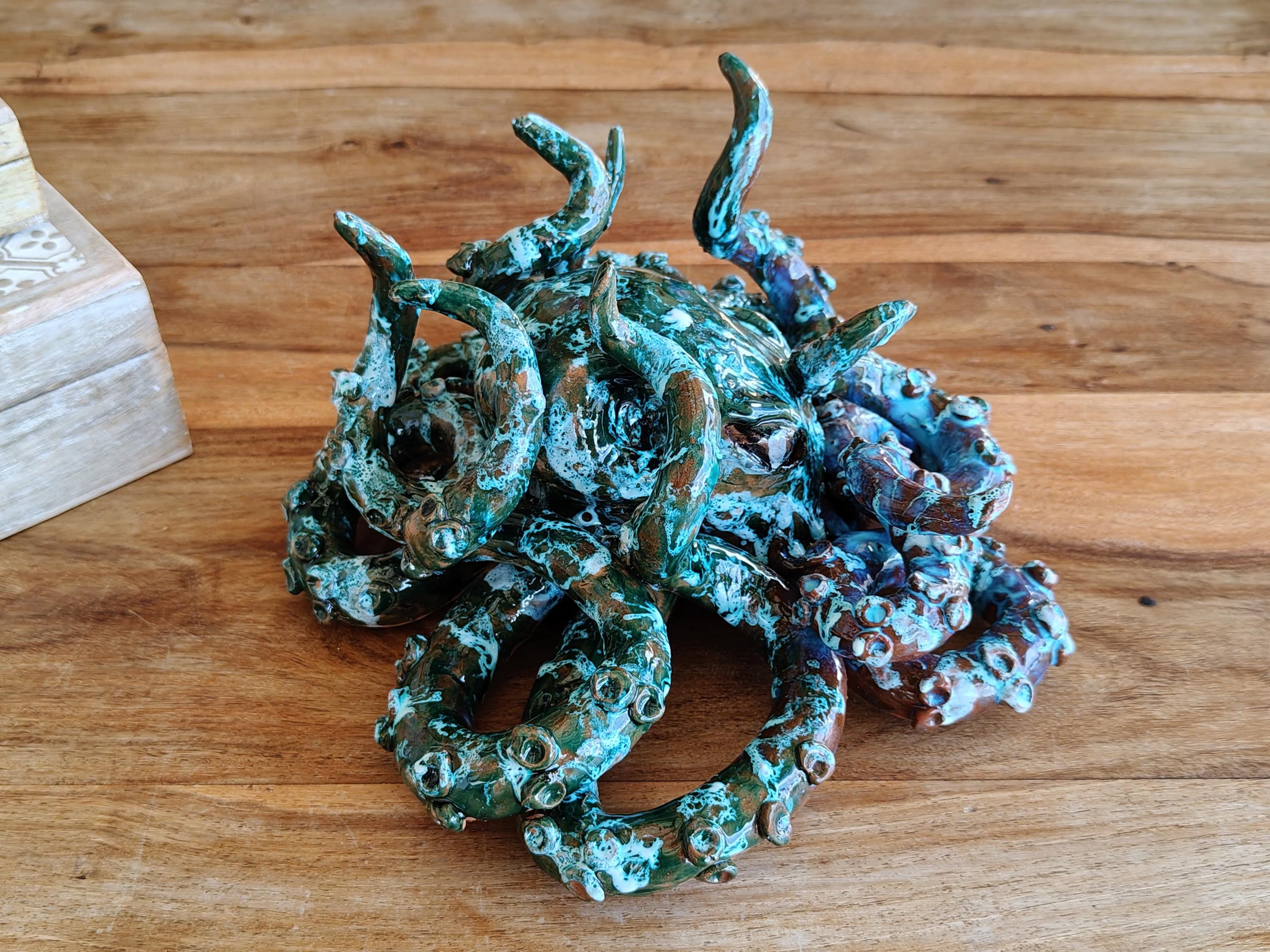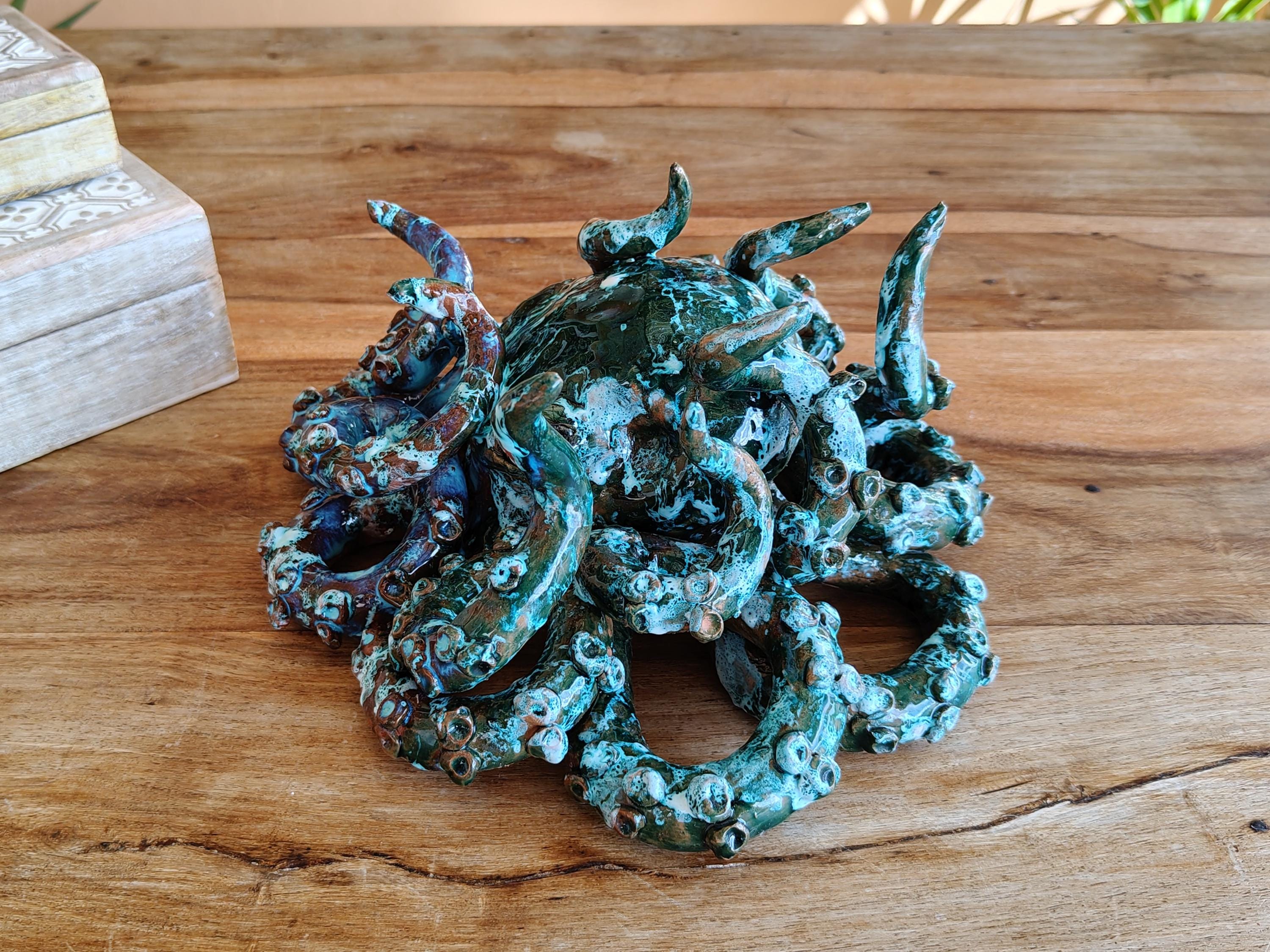 Shades of green predominate, then shift toward the front into shades of blue and turquoise, alternating and blending with a dark brown/terra cotta or bronze with contrasting white foam. This combination of contrasting colors creates a striking visual effect, emphasizing textures and volumes. The shifting hues give the impression that the octopus, as it comes to life, is changing color in an attempt to blend in.