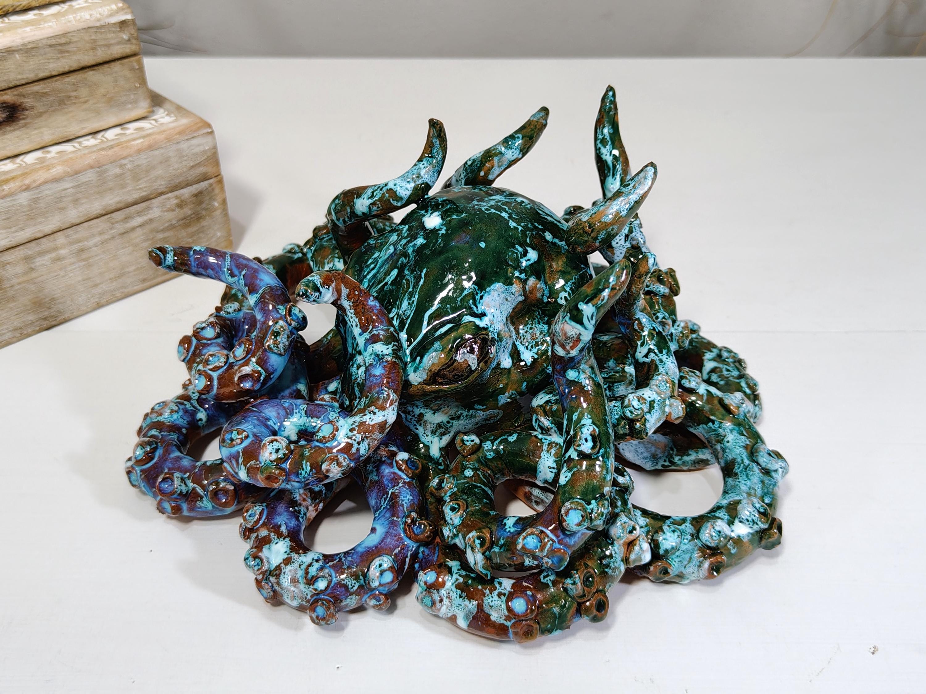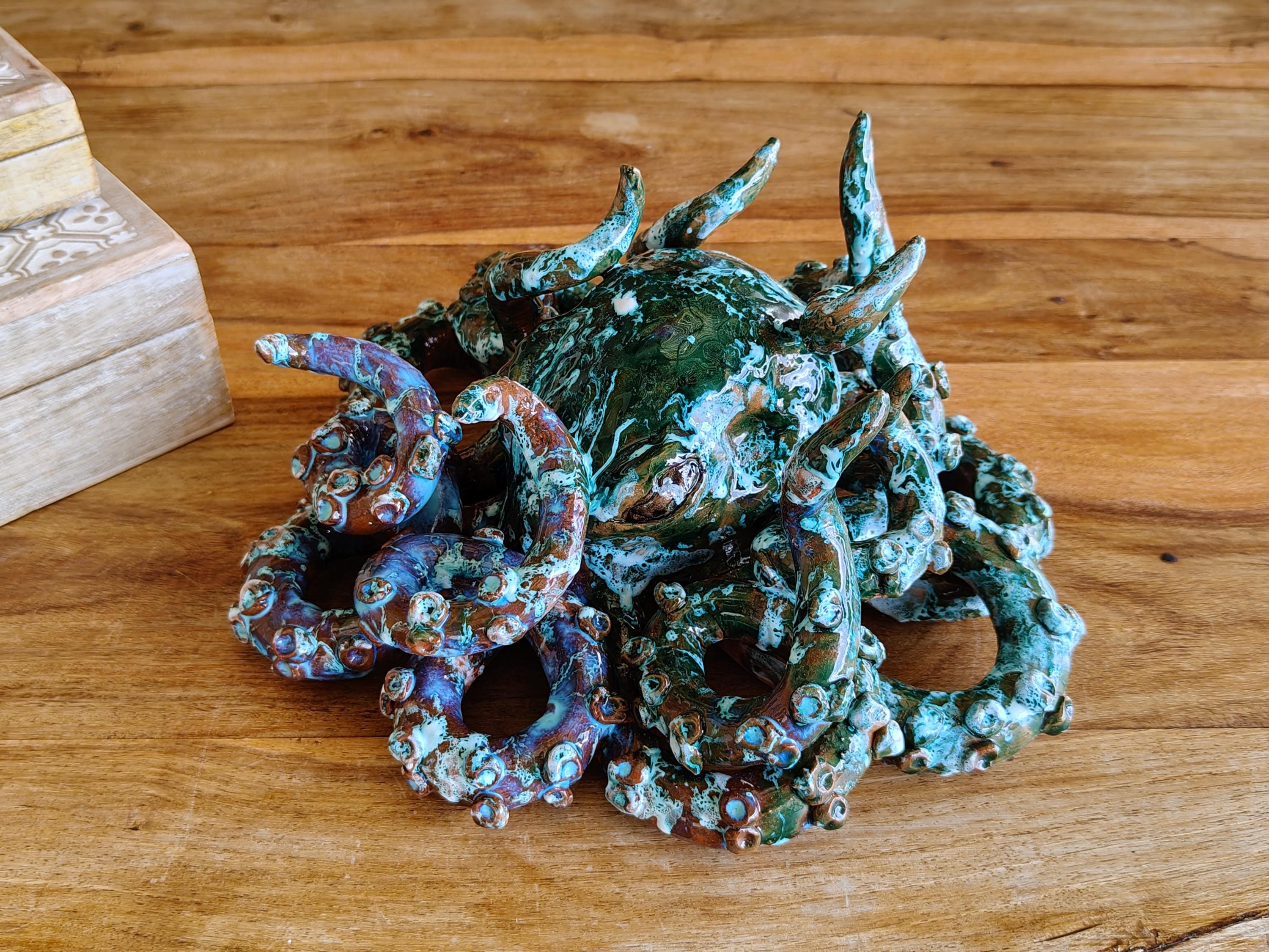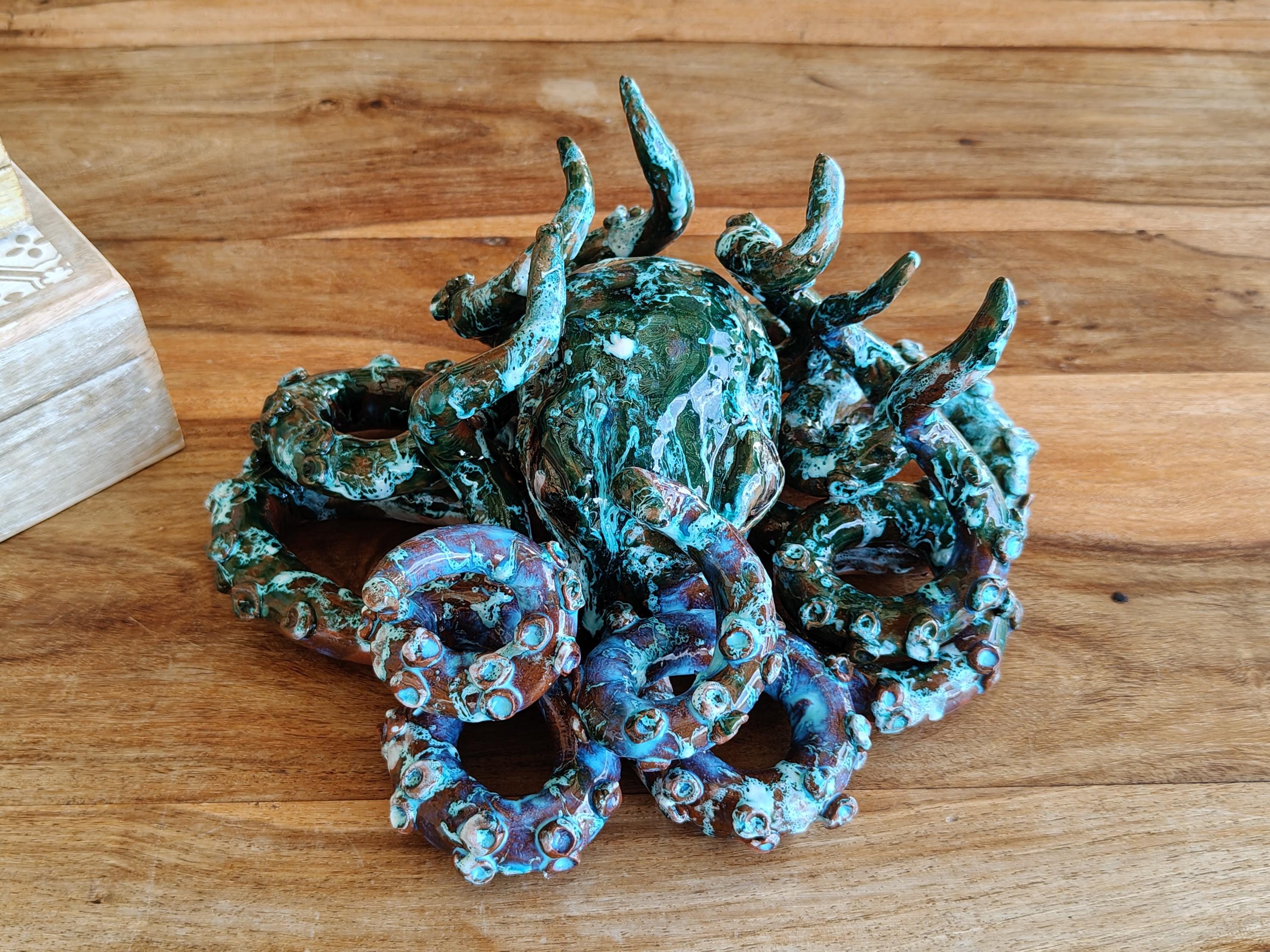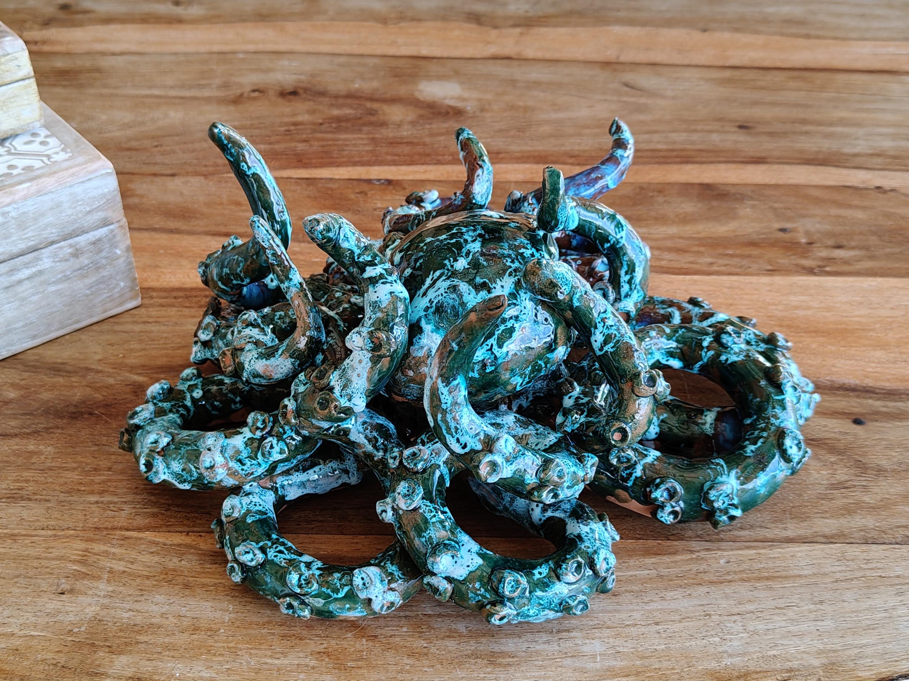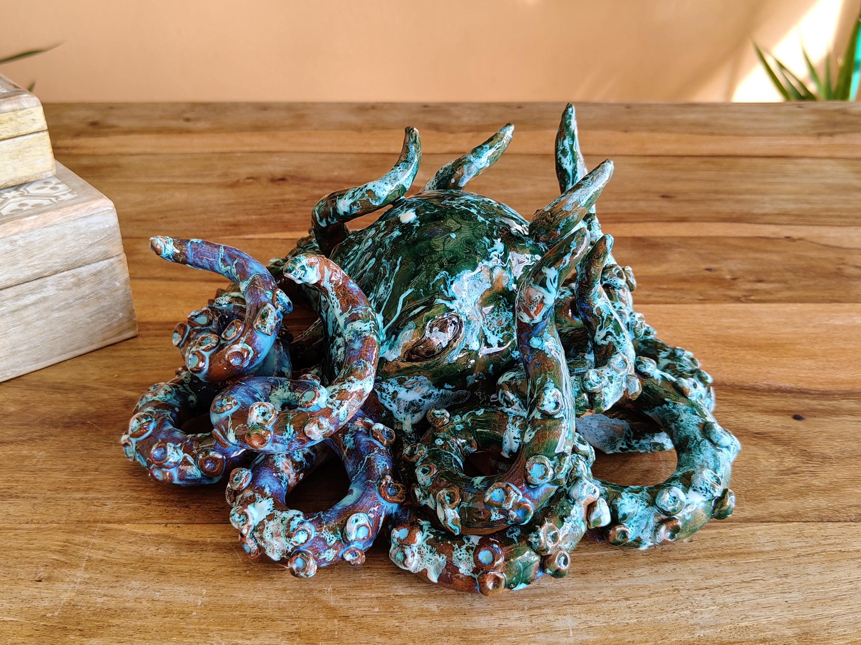 Shades of green predominate, then shift toward the front into shades of blue and turquoise, alternating and blending with a dark brown/terra cotta or bronze with contrasting white foam. This combination of contrasting colors creates a striking visual effect, emphasizing textures and volumes. The shifting hues give the impression that the octopus, as it comes to life, is changing color in an attempt to blend in.