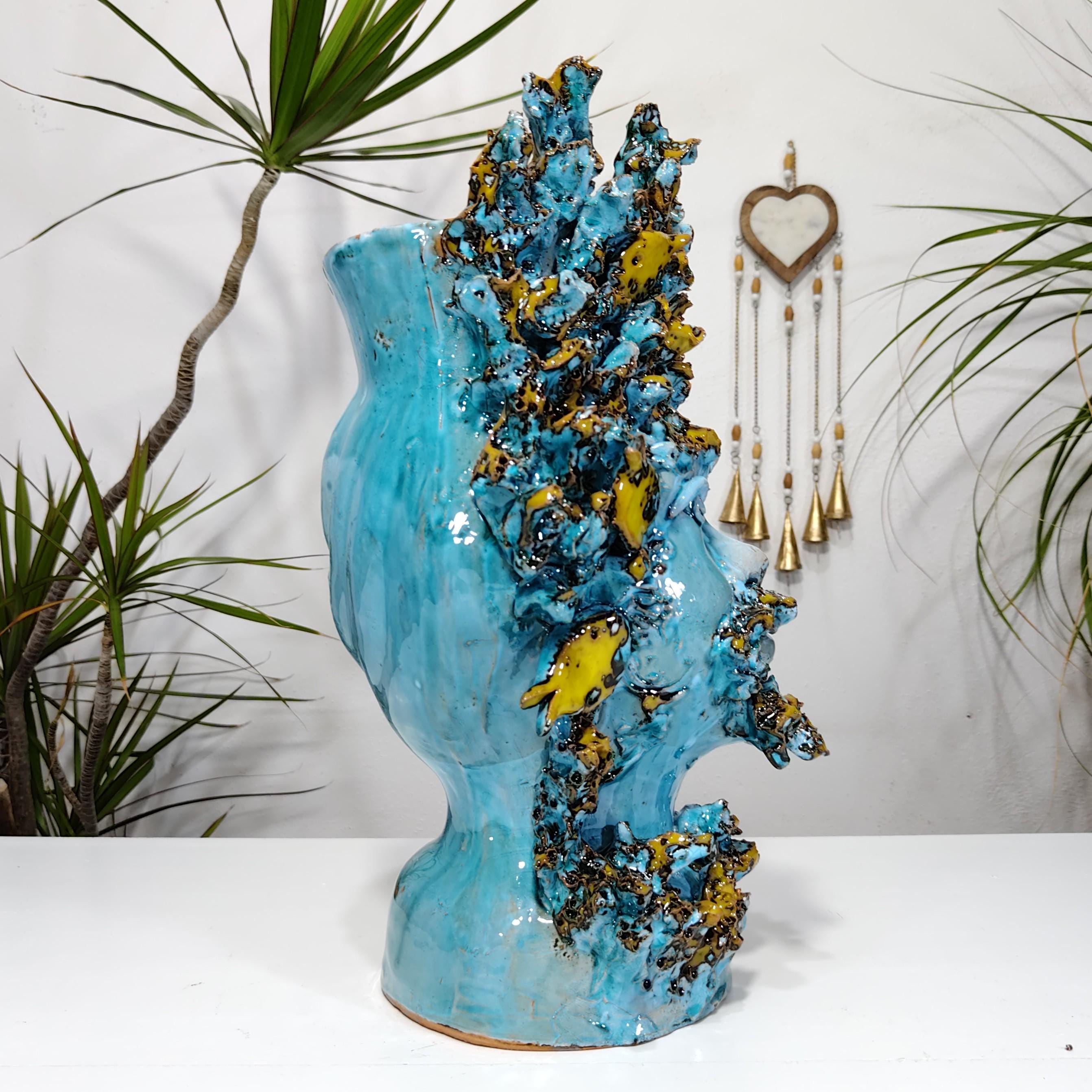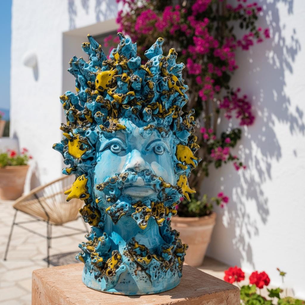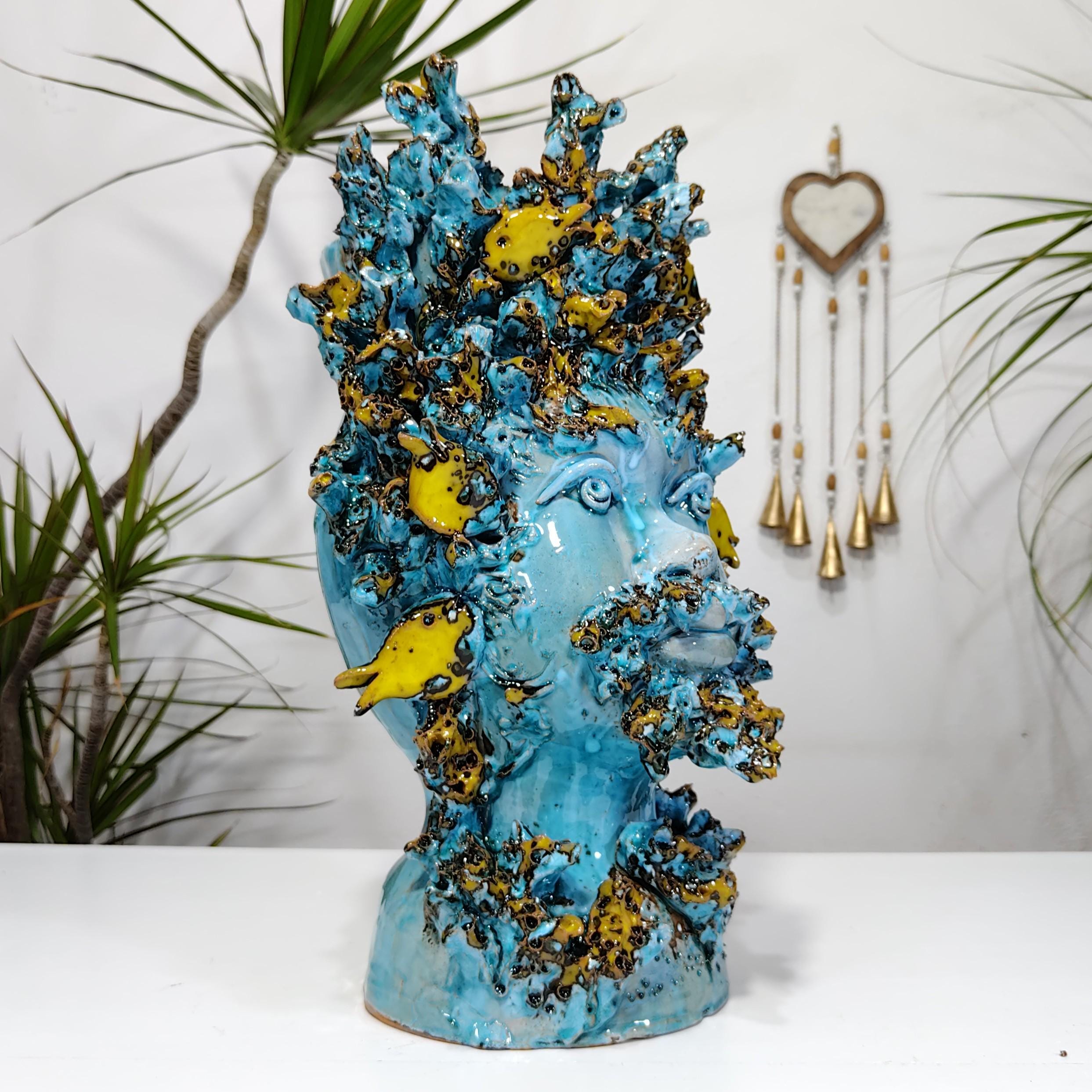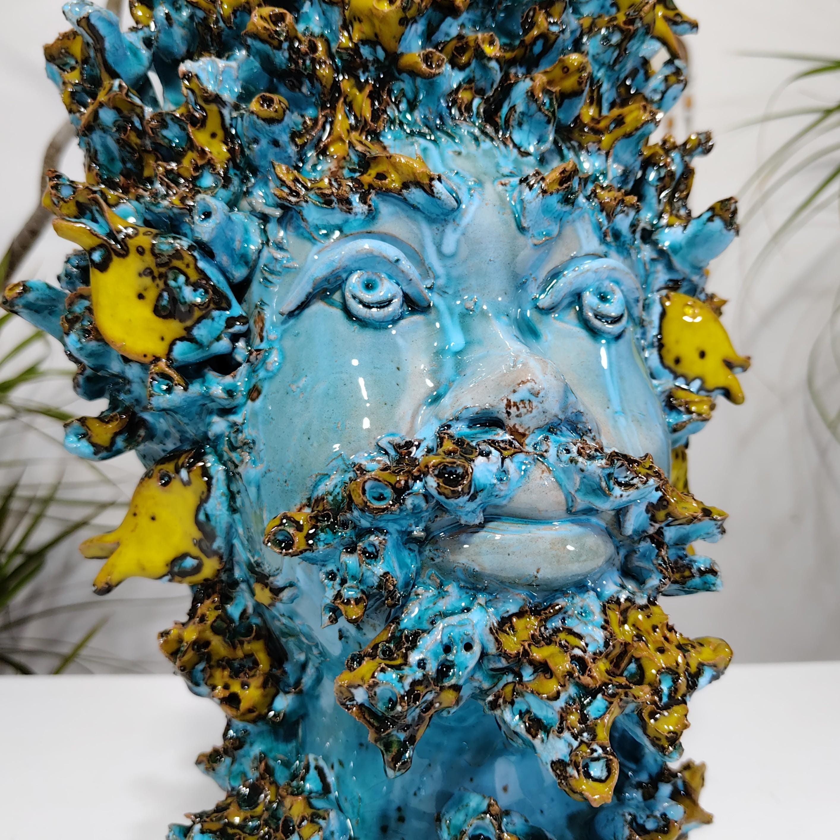 Sicilian Moorish heads entirely hand-made, multicolored turquoise/aquamarine with yellow in triple firing H43 L28
