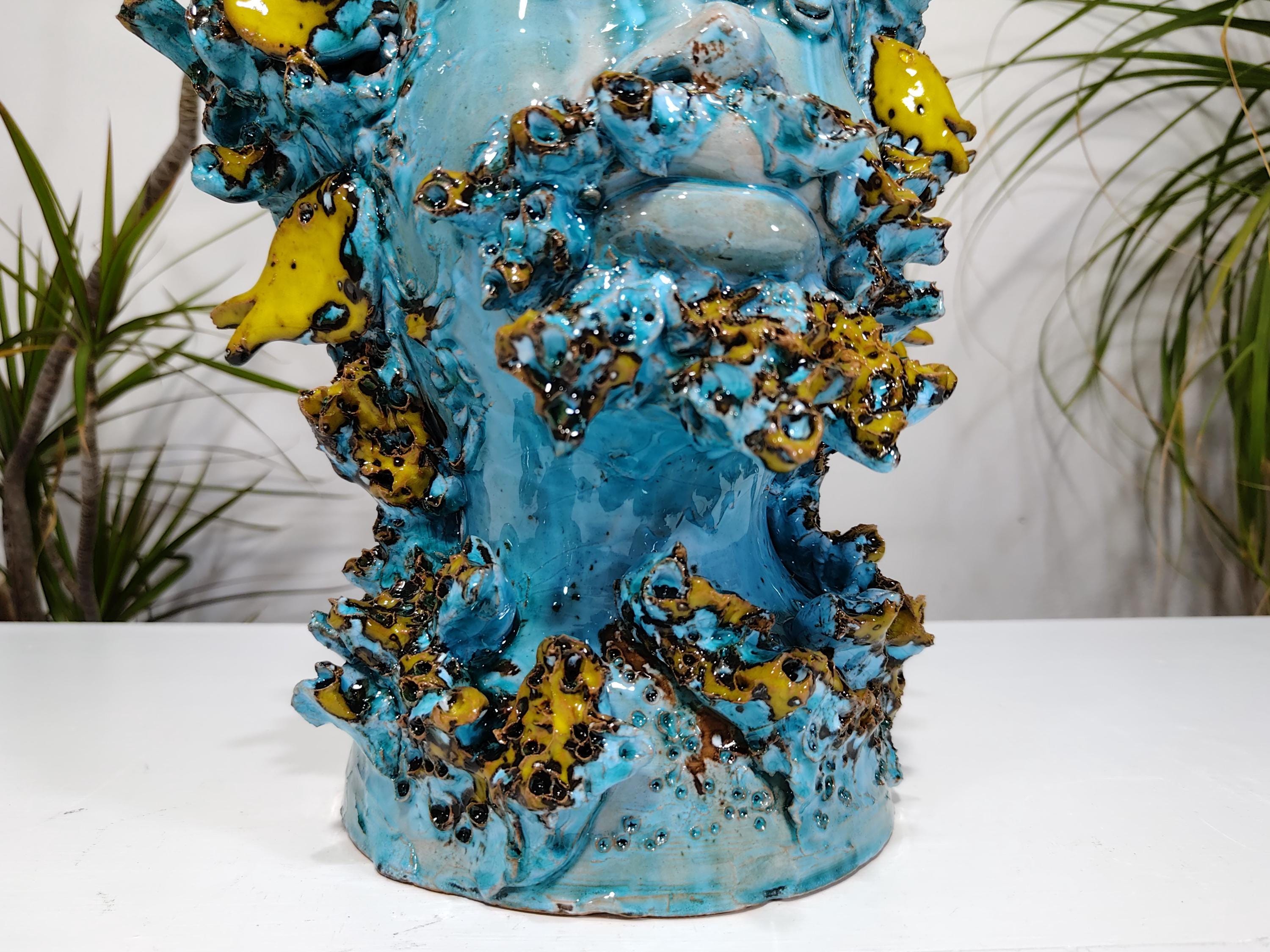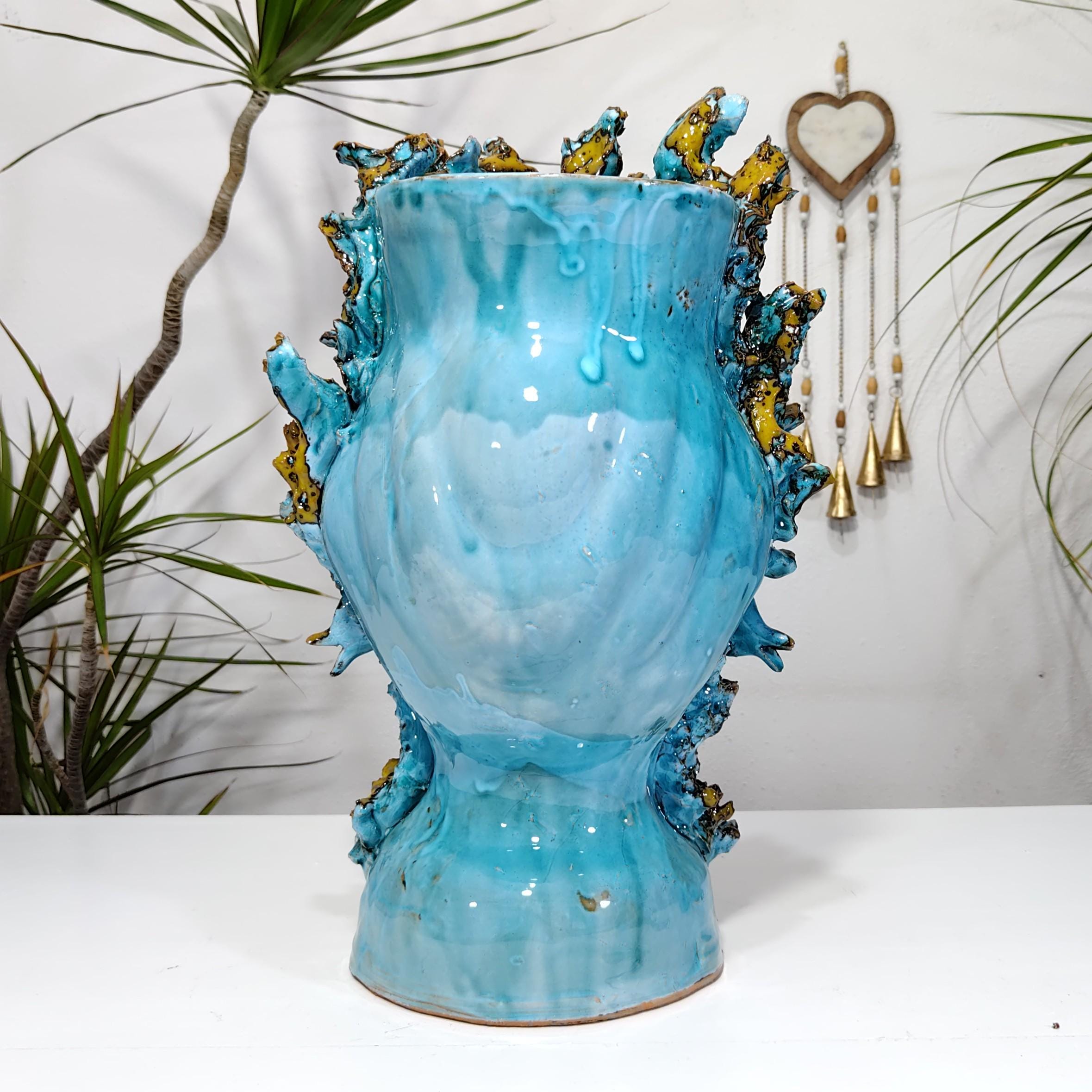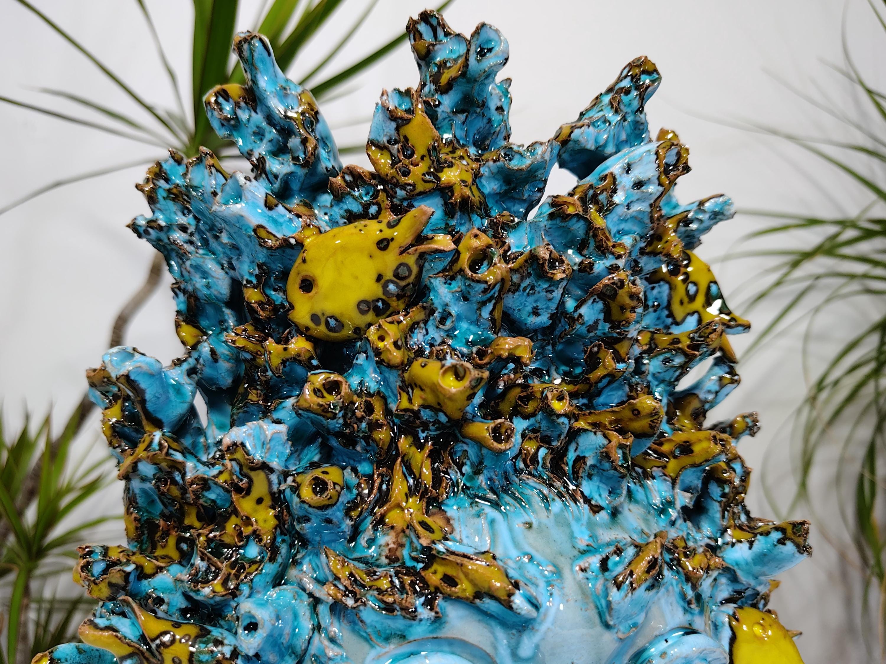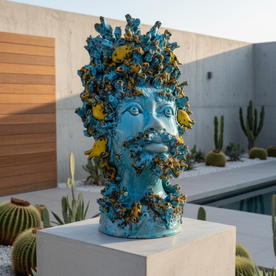 Sicilian Moorish heads entirely hand-made, multicolored turquoise/aquamarine with yellow in triple firing H43 L28