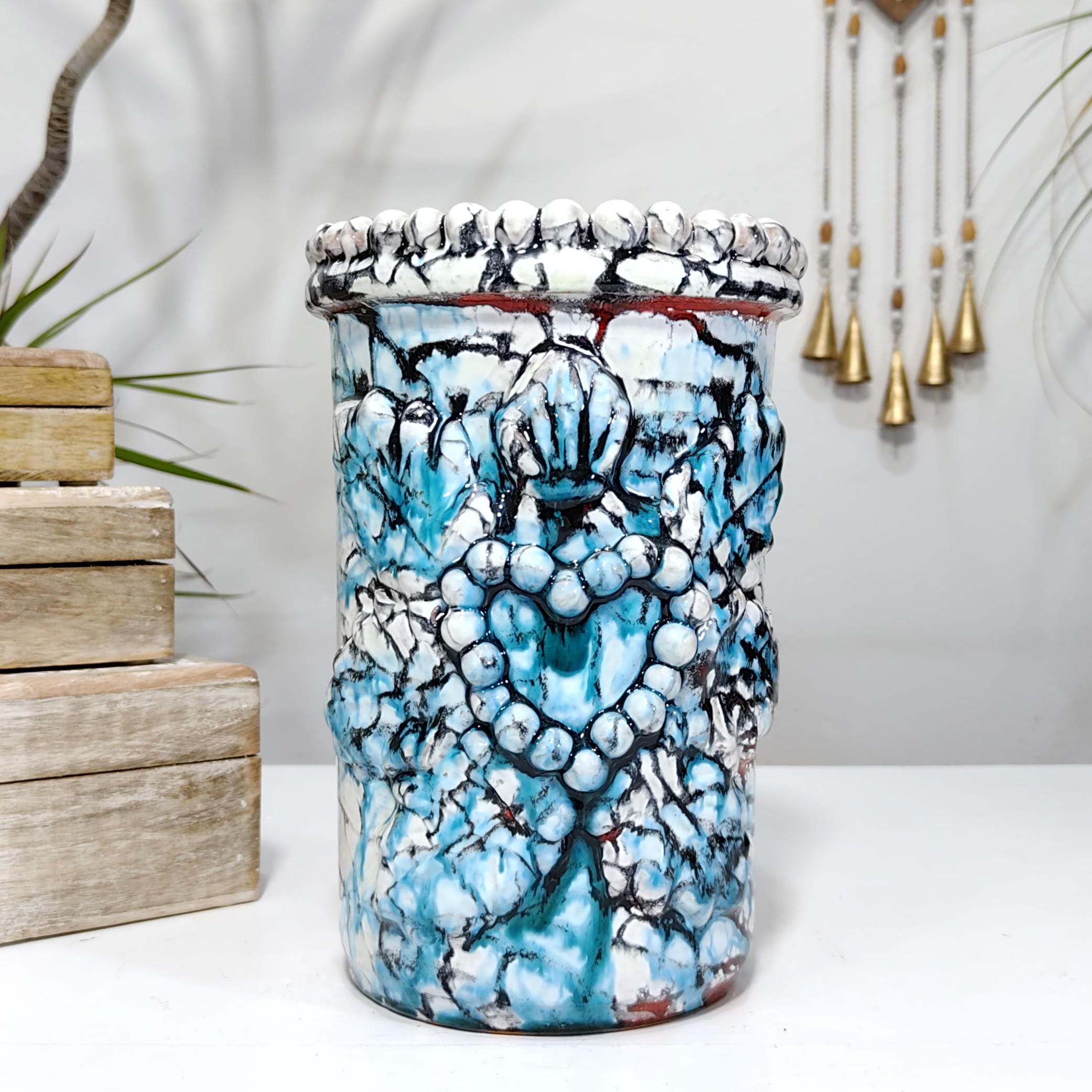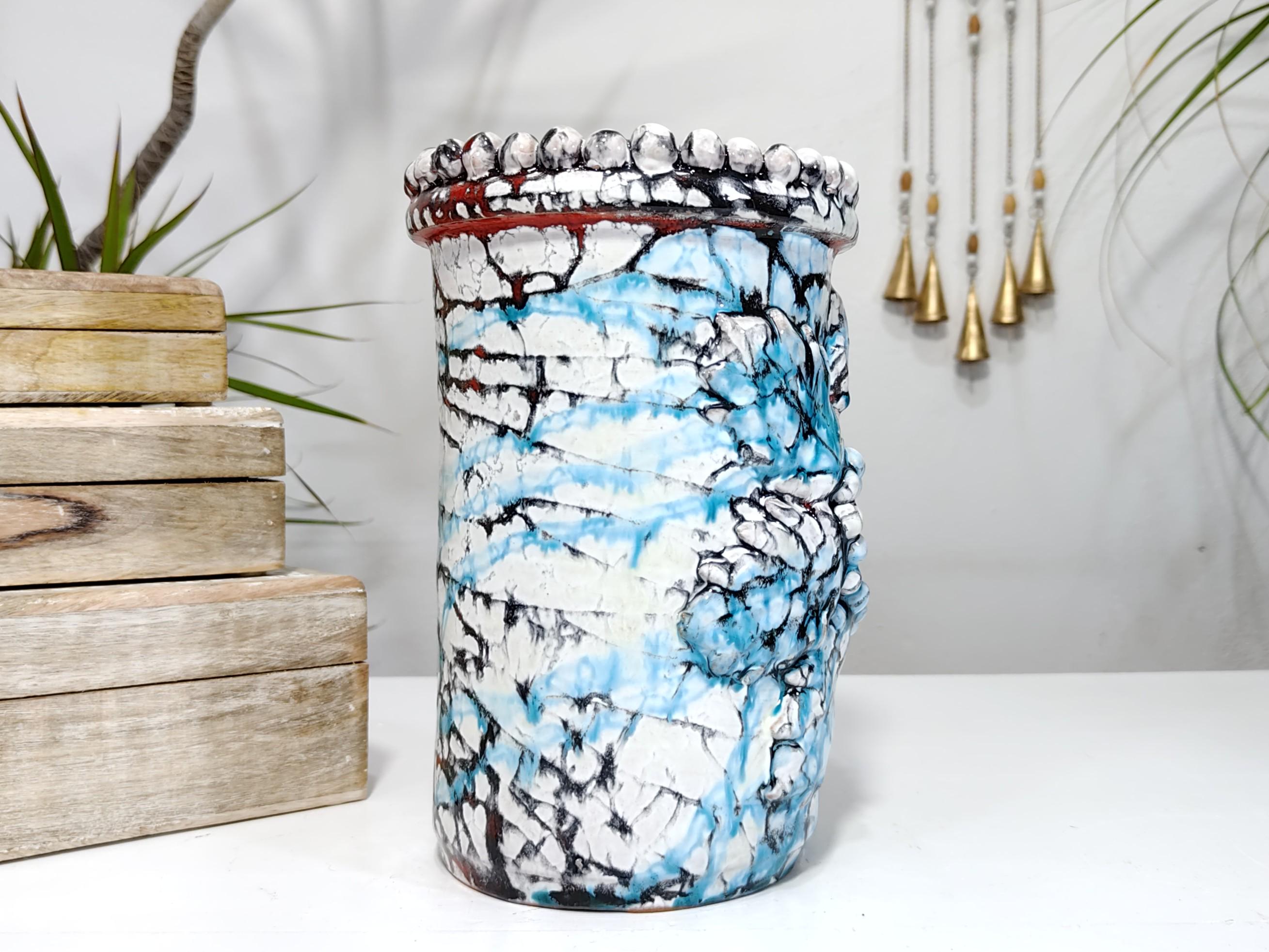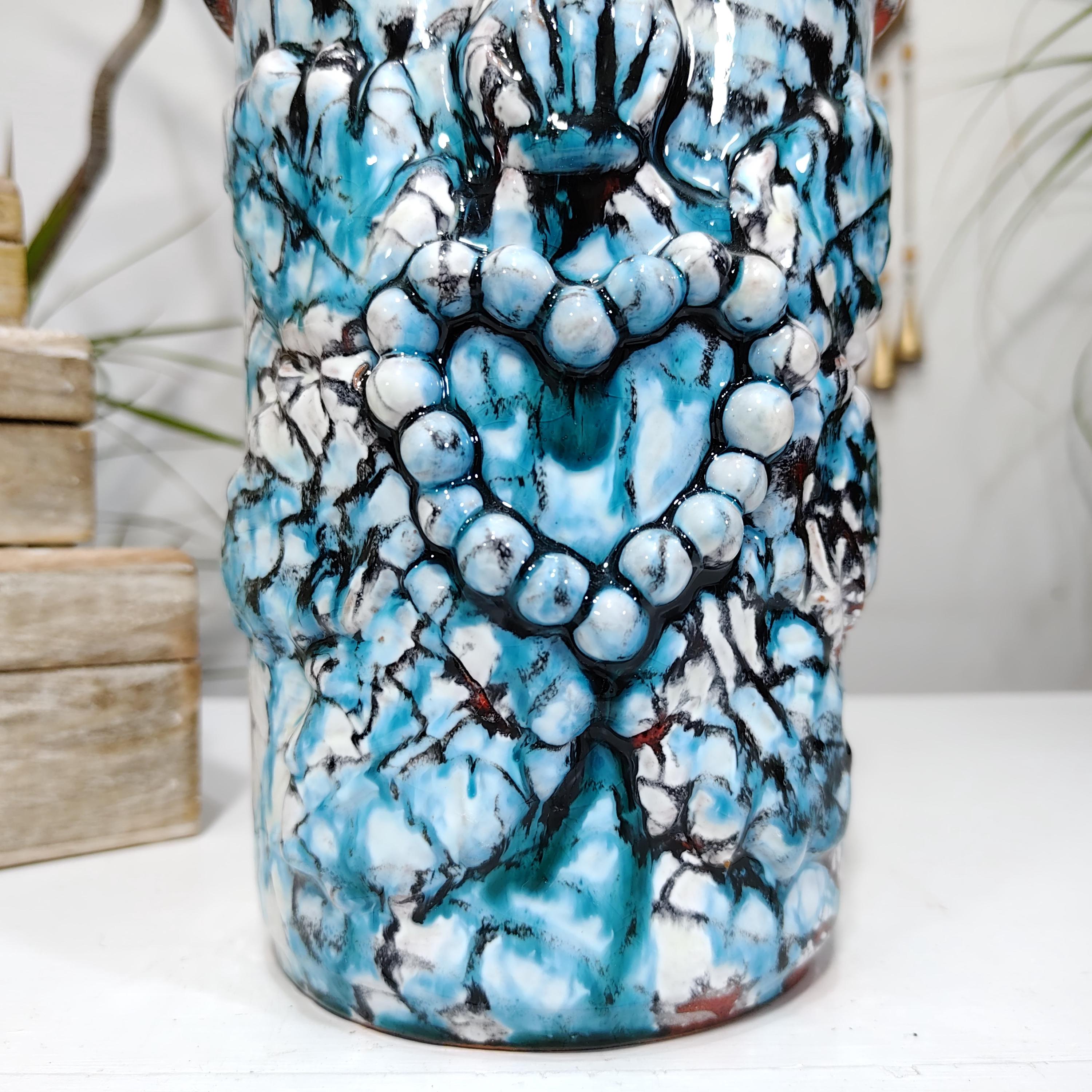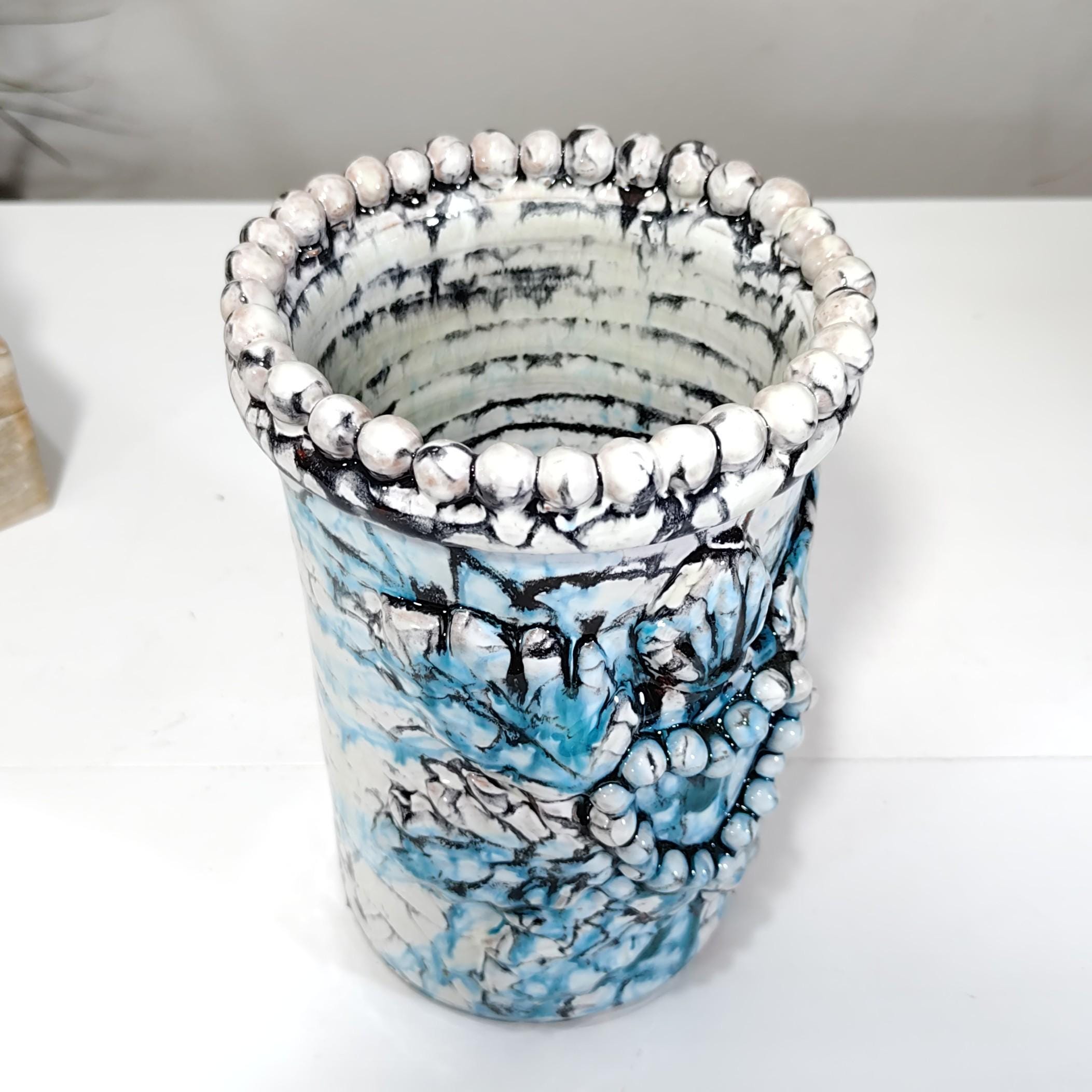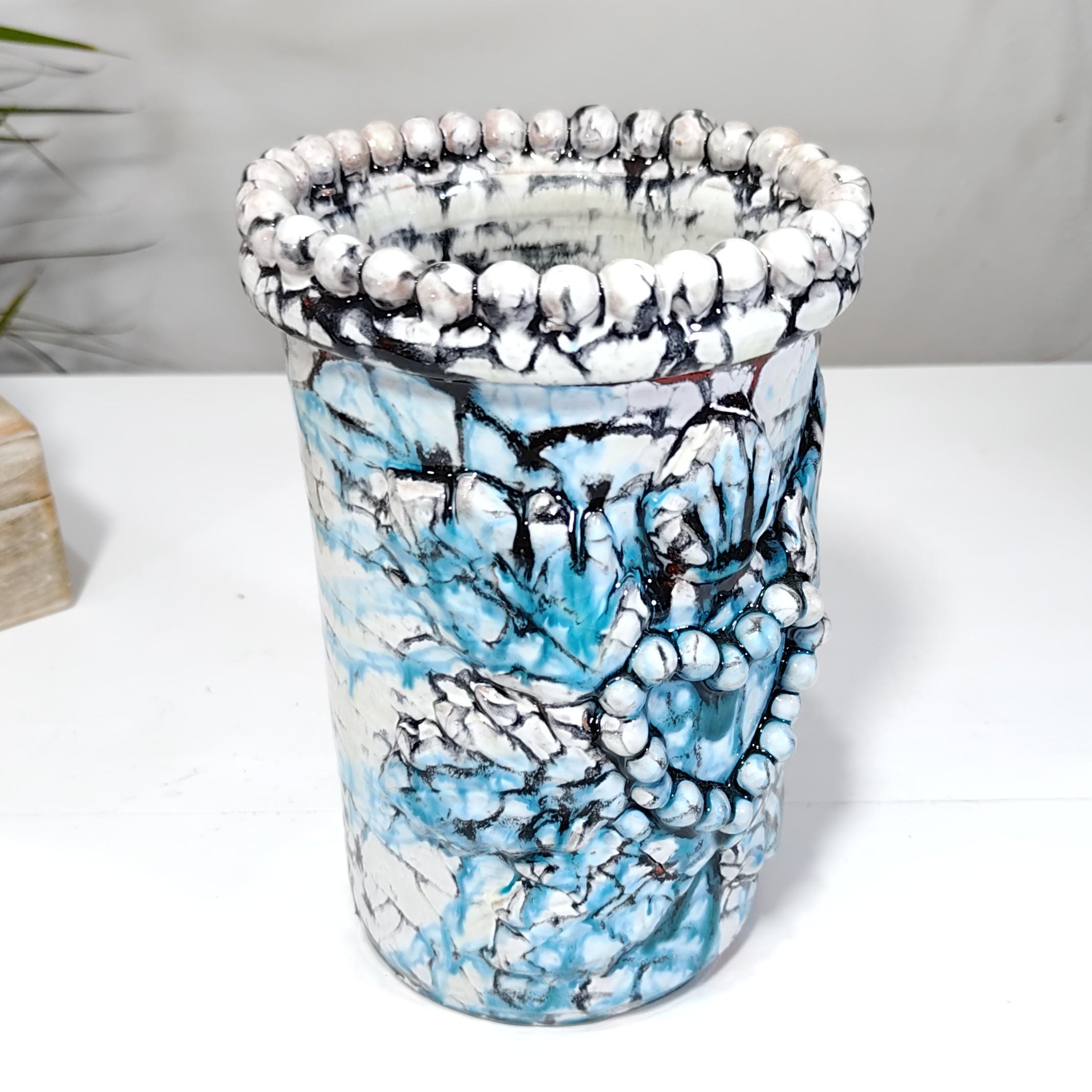 The enameling, a distinctive feature. Bright turquoise blue and white dominate, blending and breaking with a network of cracks or black lines (craquelure or reactive enamel effect). This contrast between the light/bright color and the dark lines gives the piece a raw yet sophisticated feel.