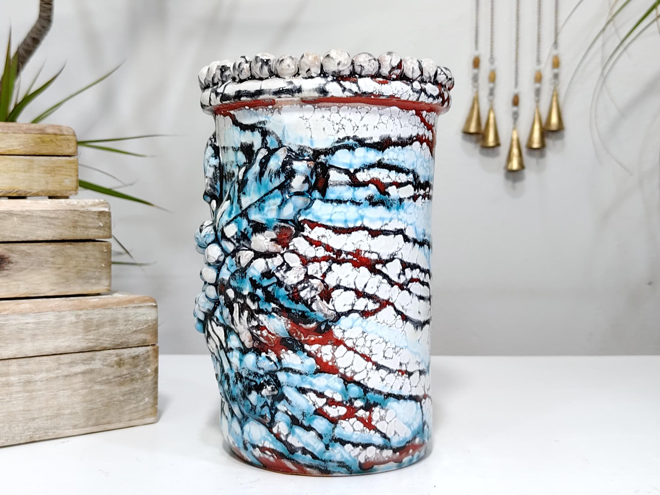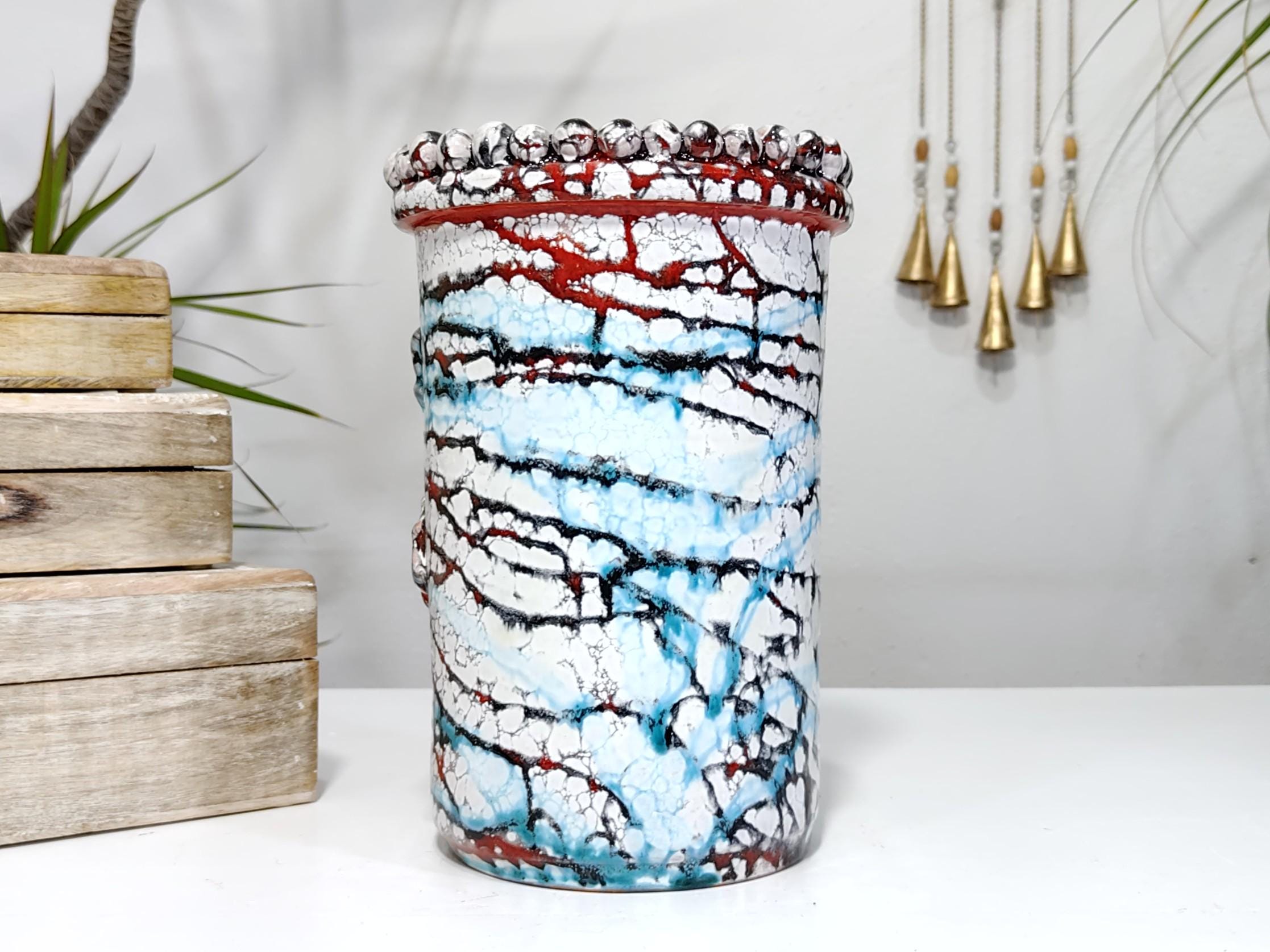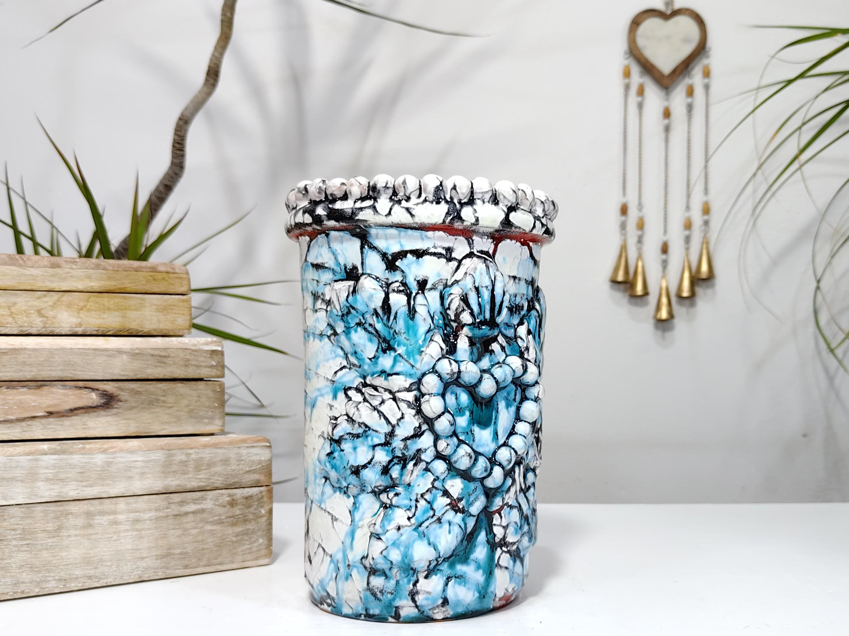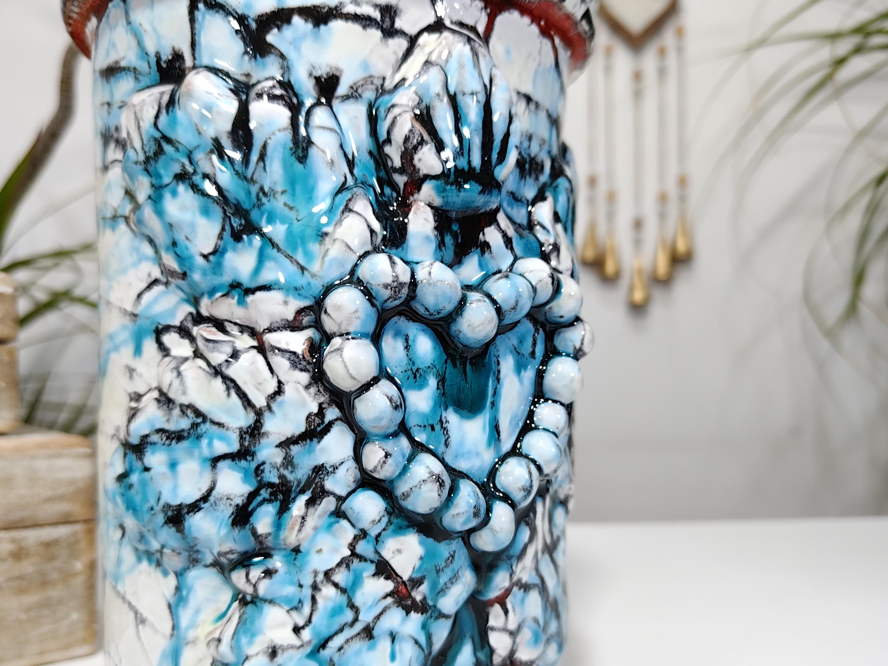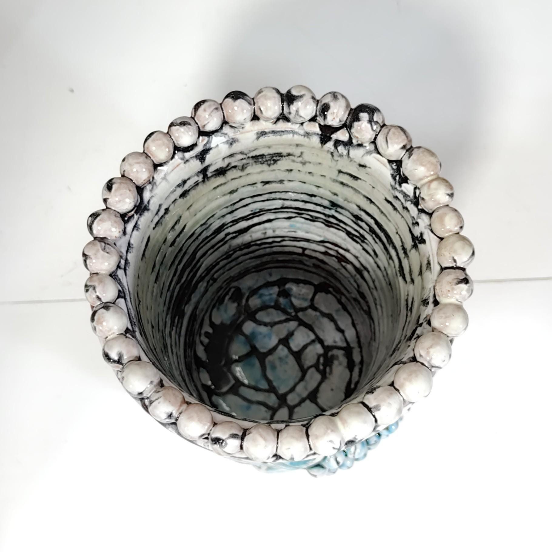 The enameling, a distinctive feature. Bright turquoise blue and white dominate, blending and breaking with a network of cracks or black lines (craquelure or reactive enamel effect). This contrast between the light/bright color and the dark lines gives the piece a raw yet sophisticated feel.