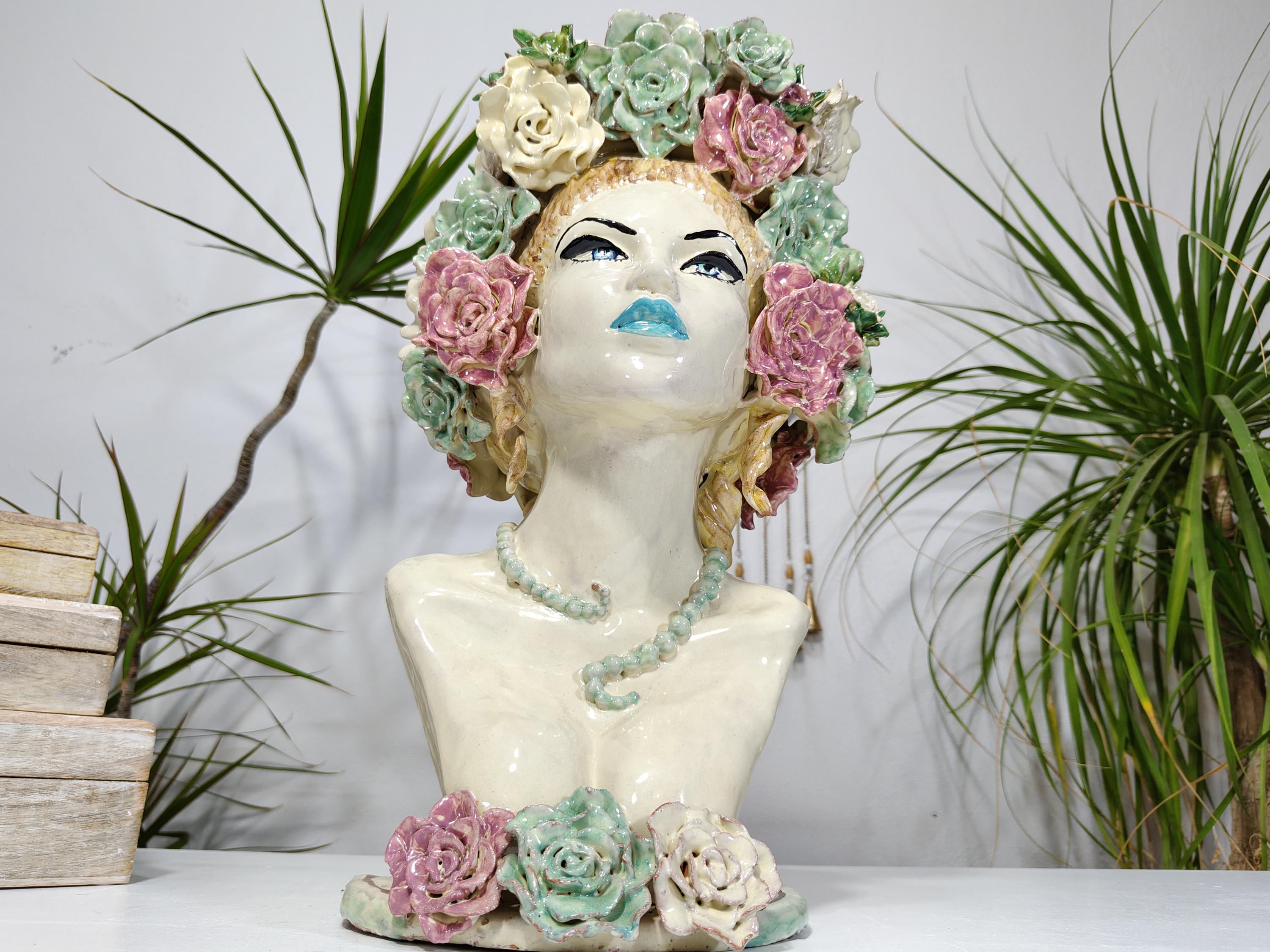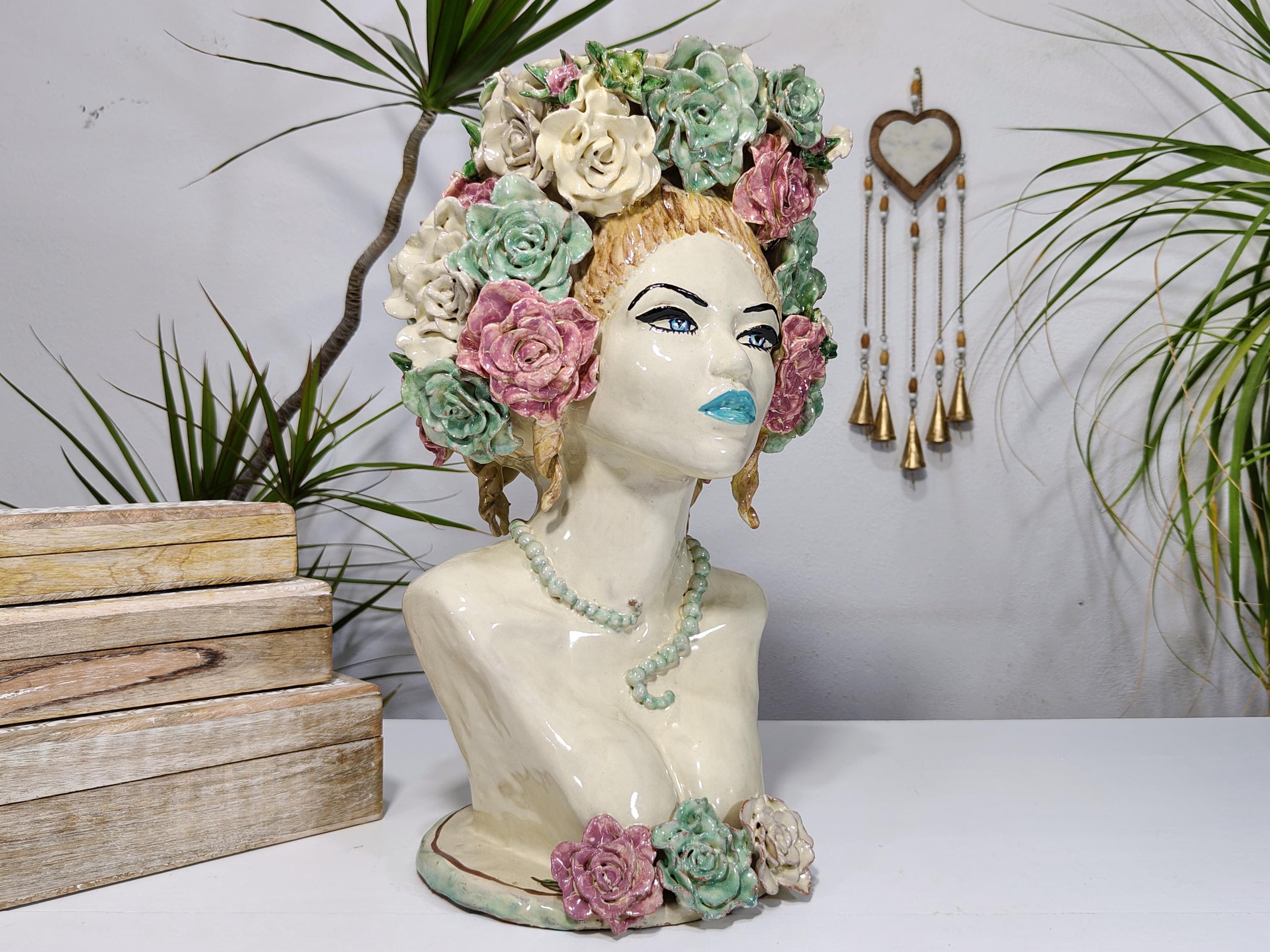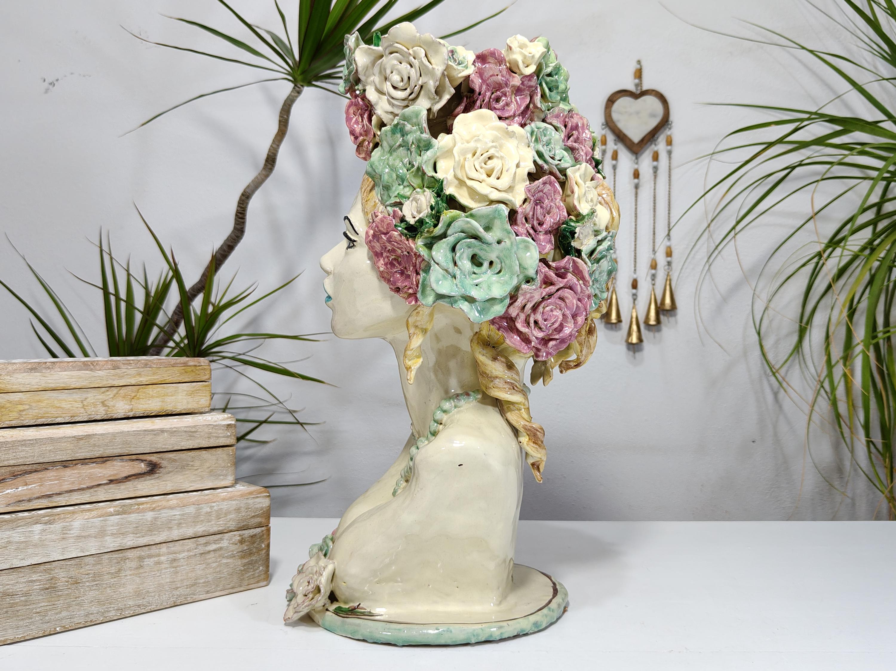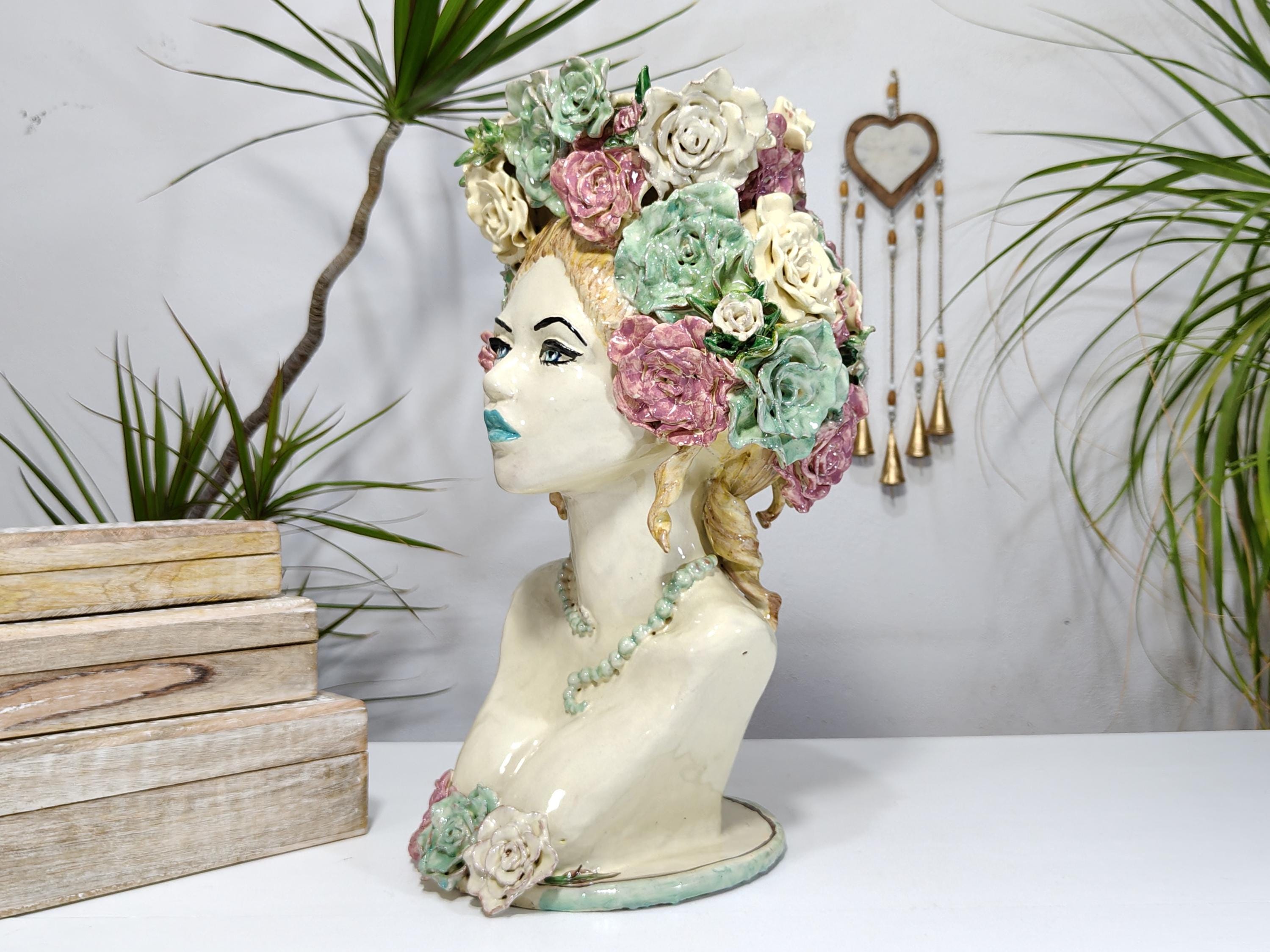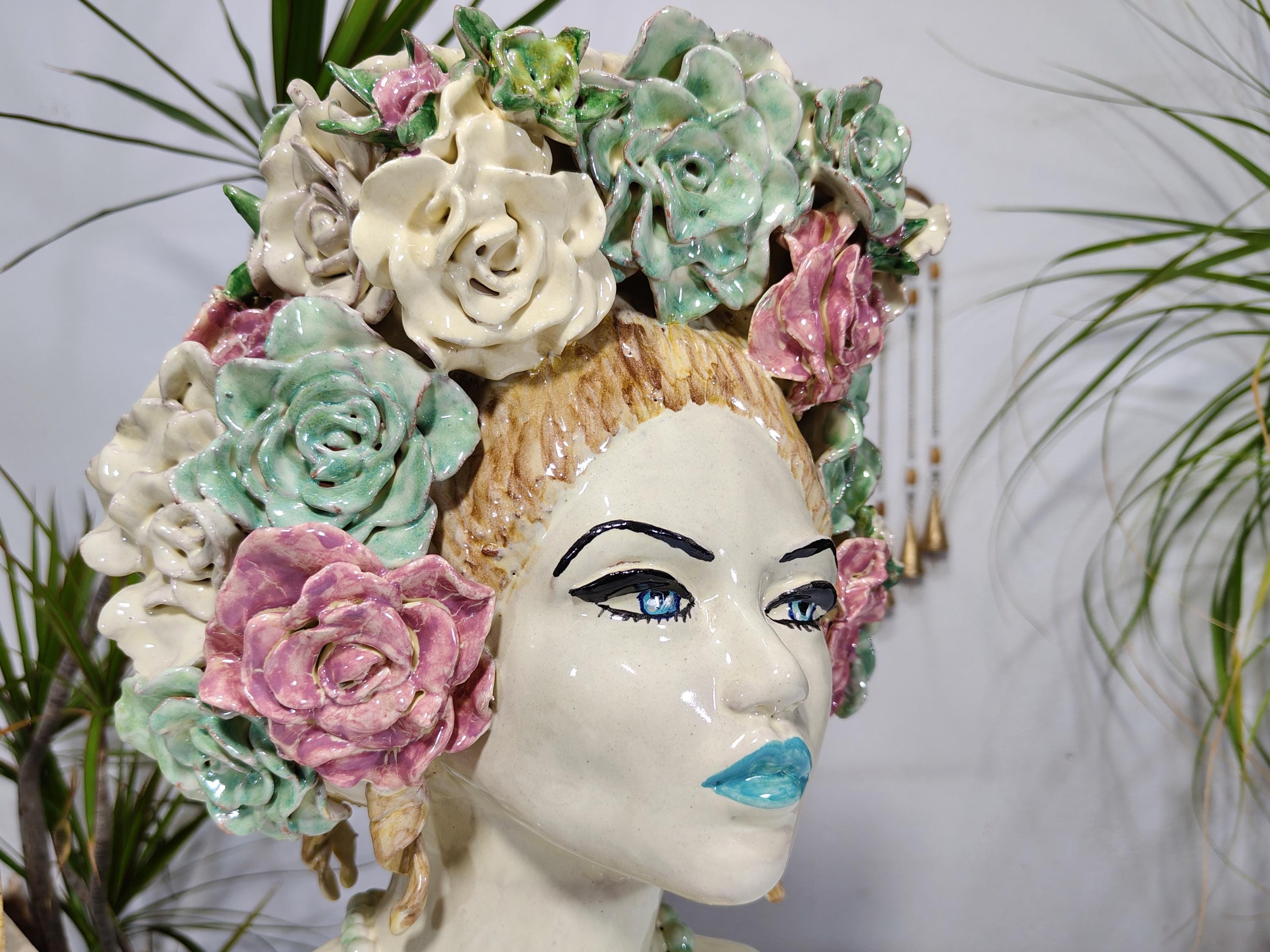 Large half bust of a woman Caltagirone ceramic entirely hand-made in shape and decoration