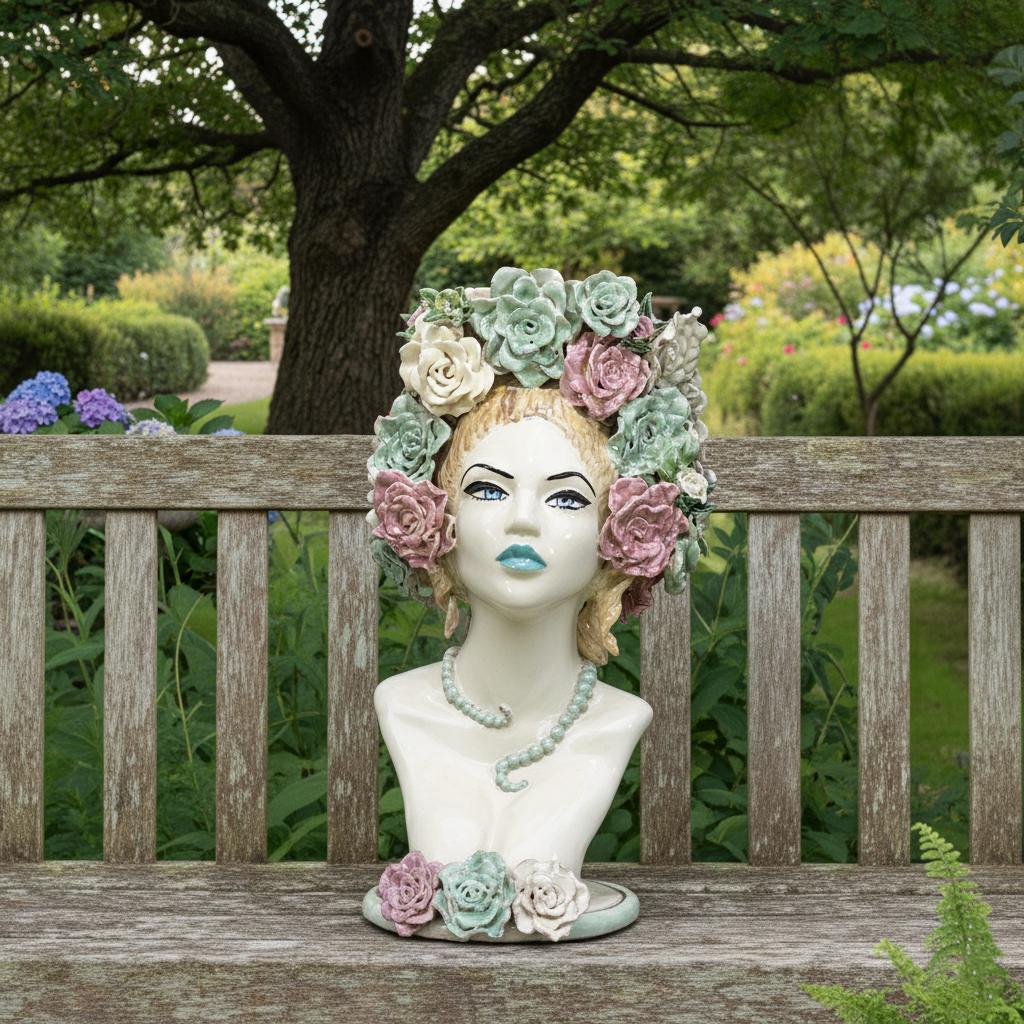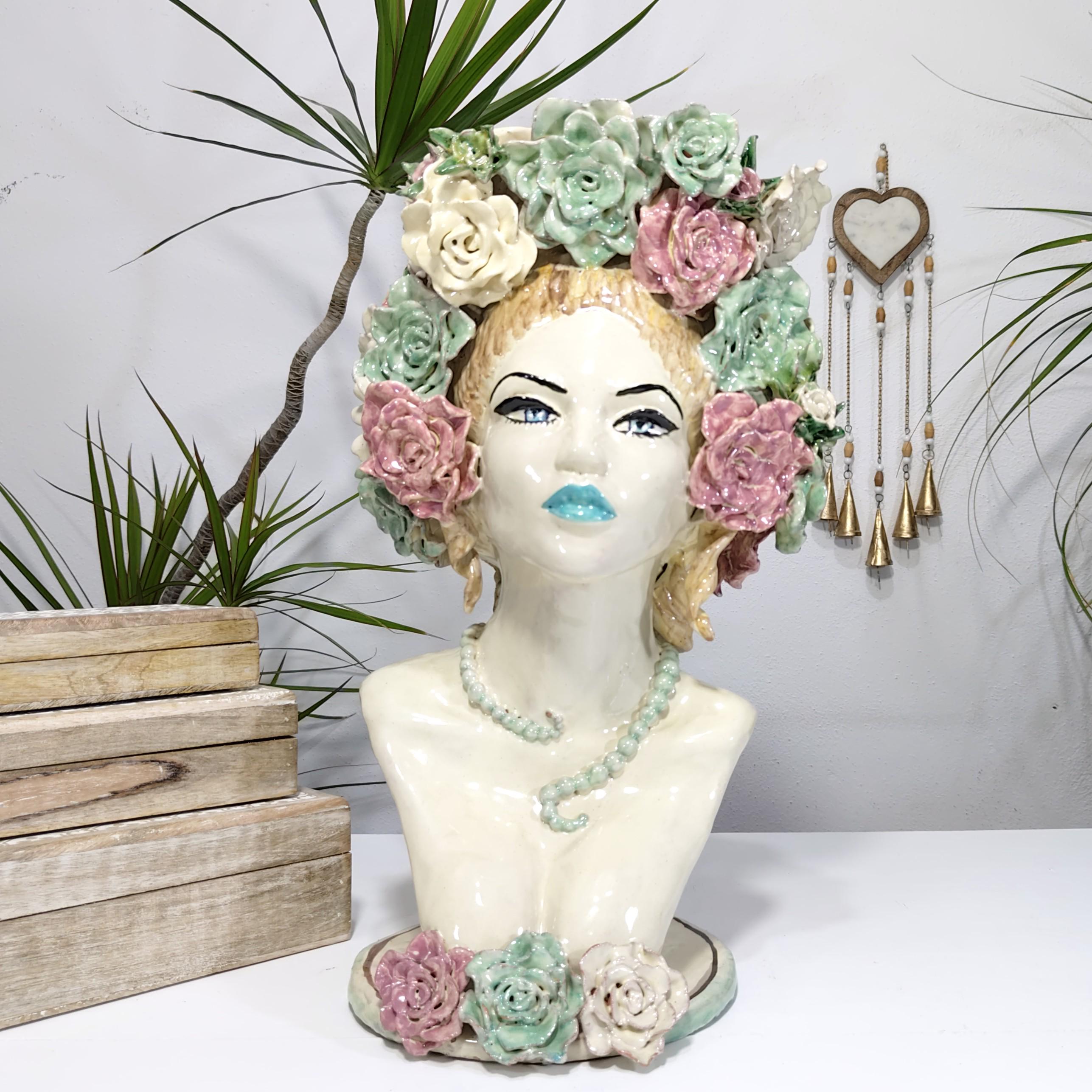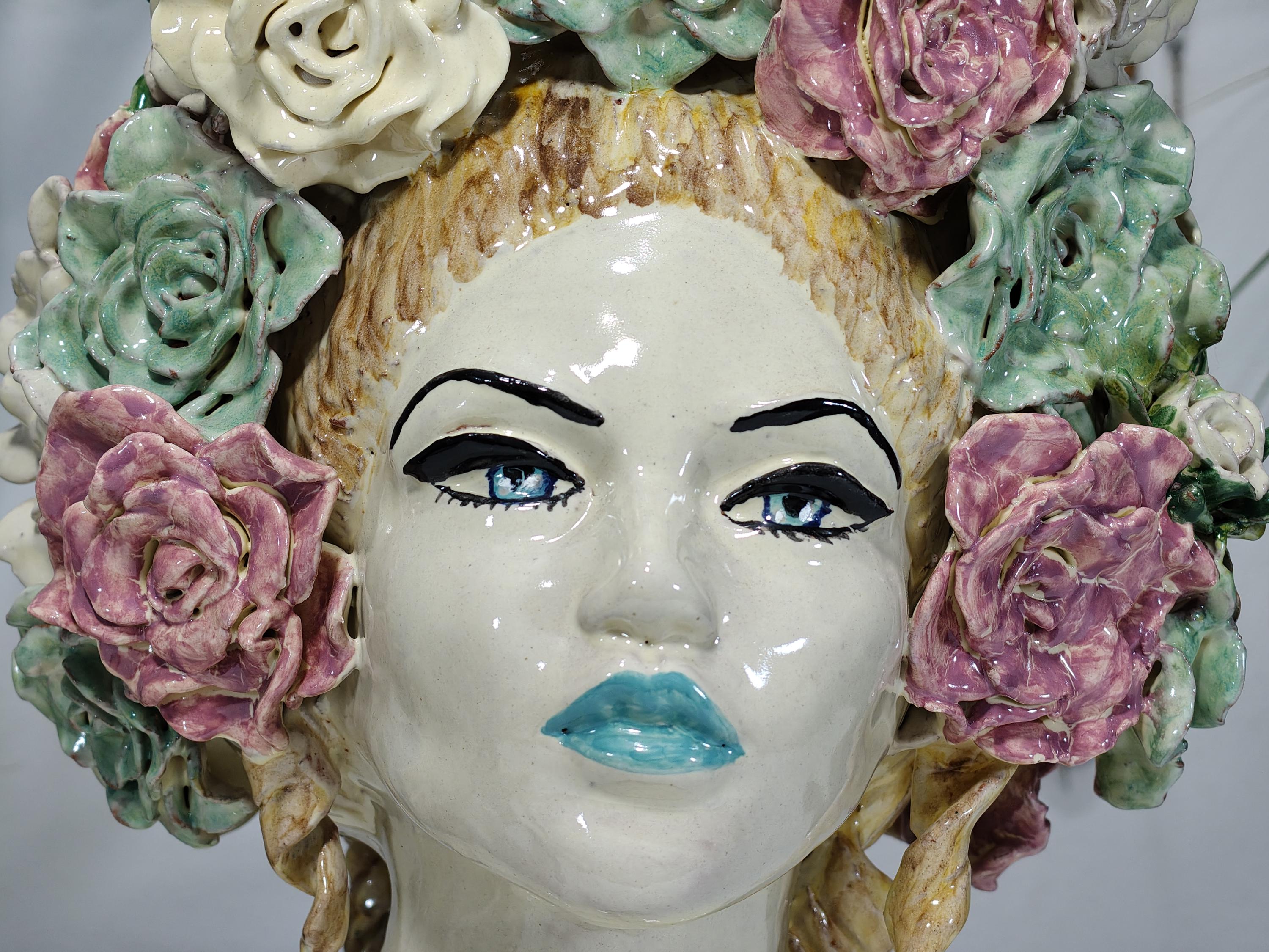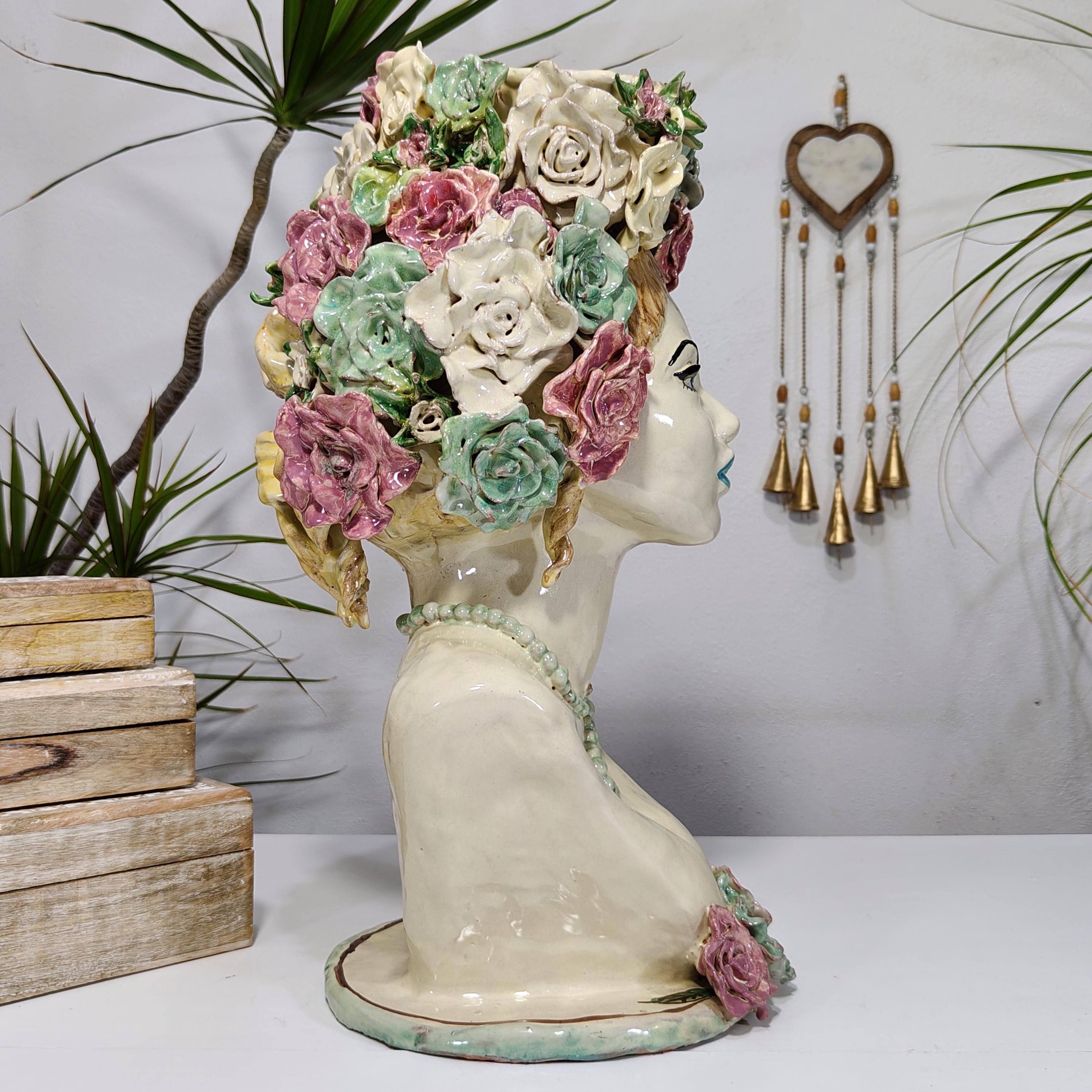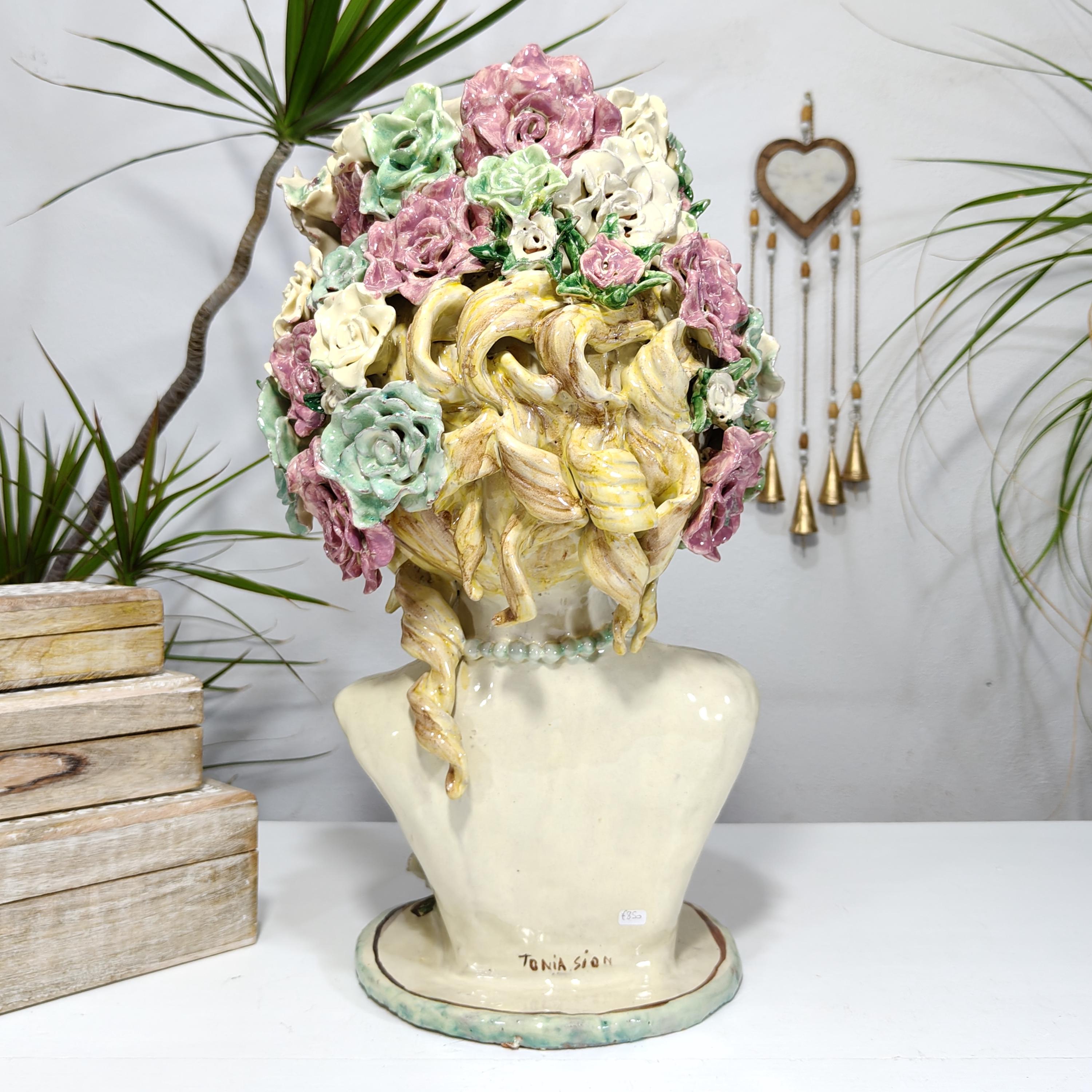 Large half bust of a woman Caltagirone ceramic entirely hand-made in shape and decoration