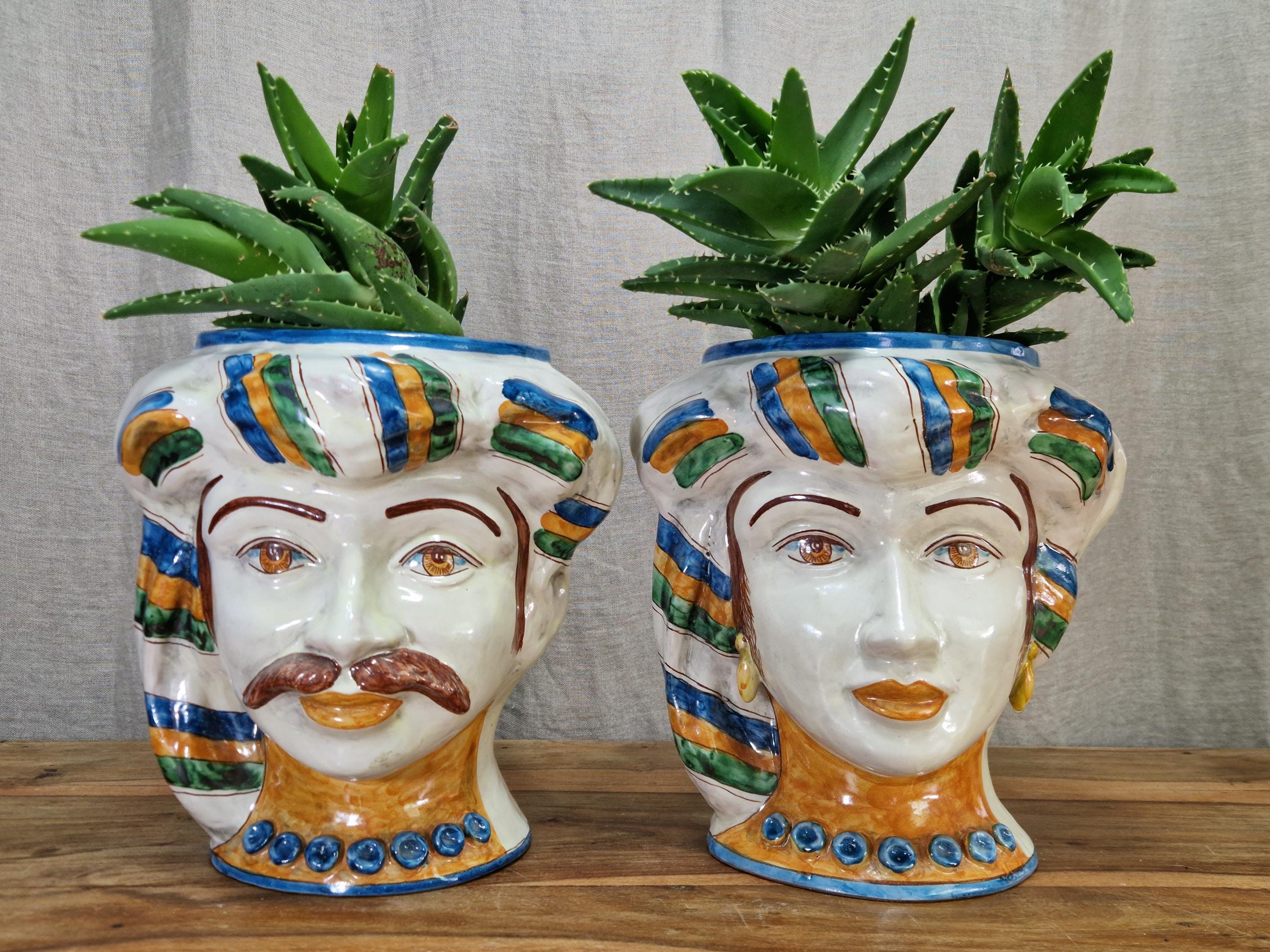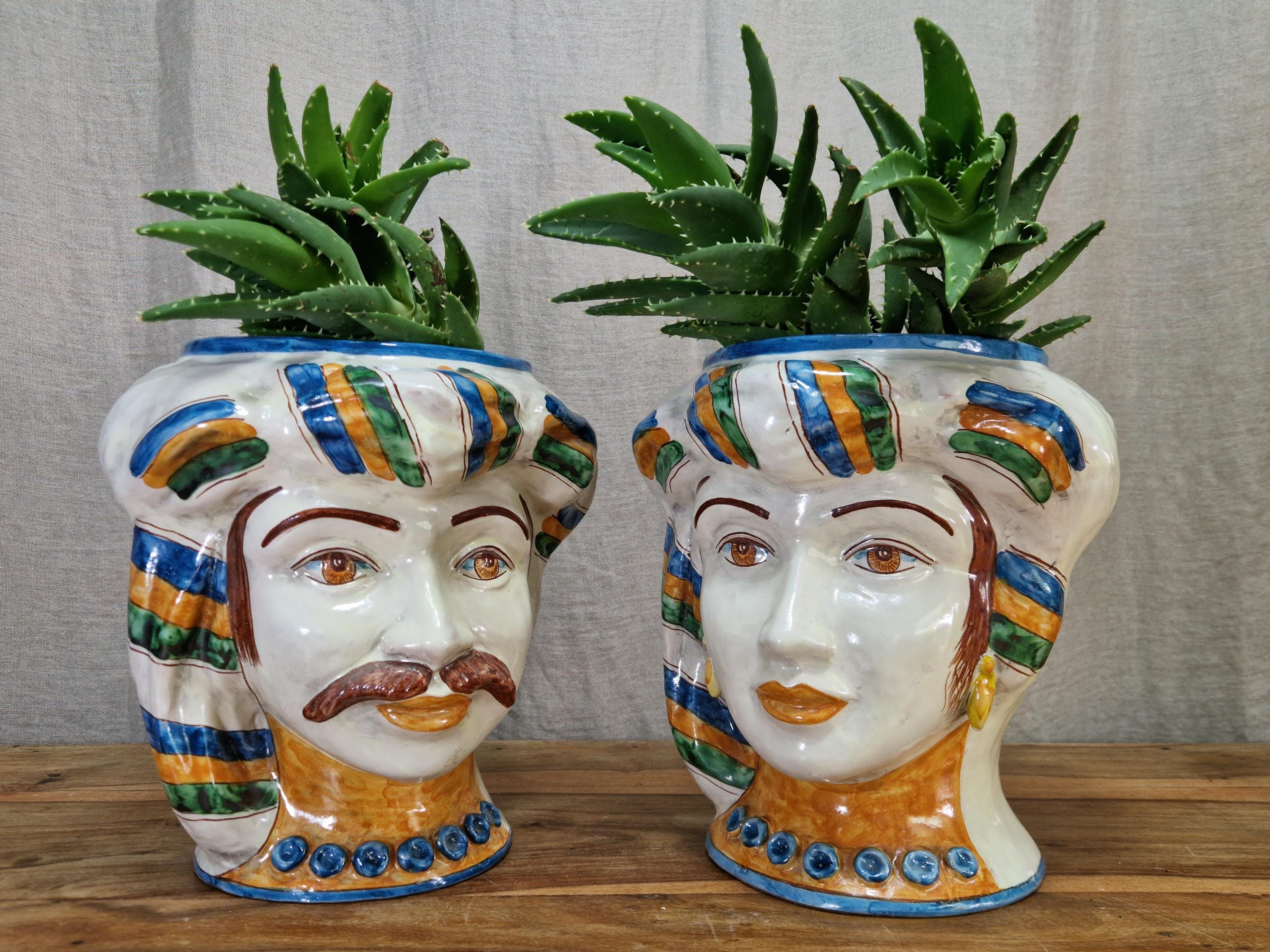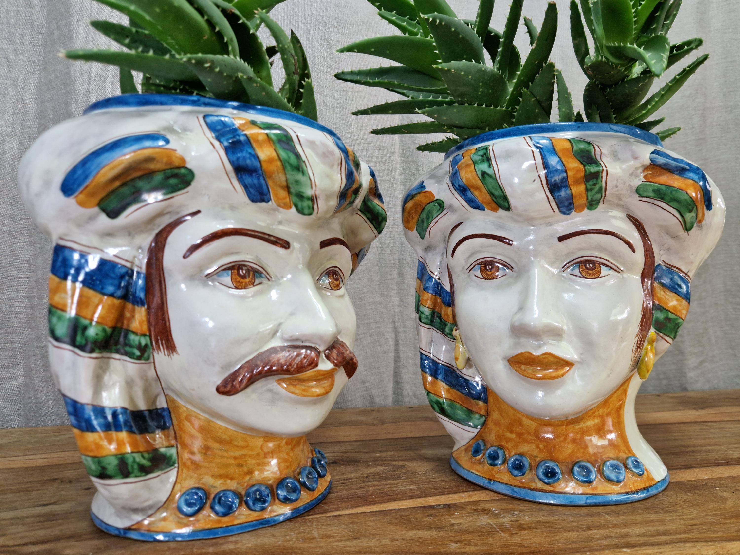 Large Sicilian Moor's heads in Caltagirone ceramic, entirely hand-made in shape and decoration, H28 W28