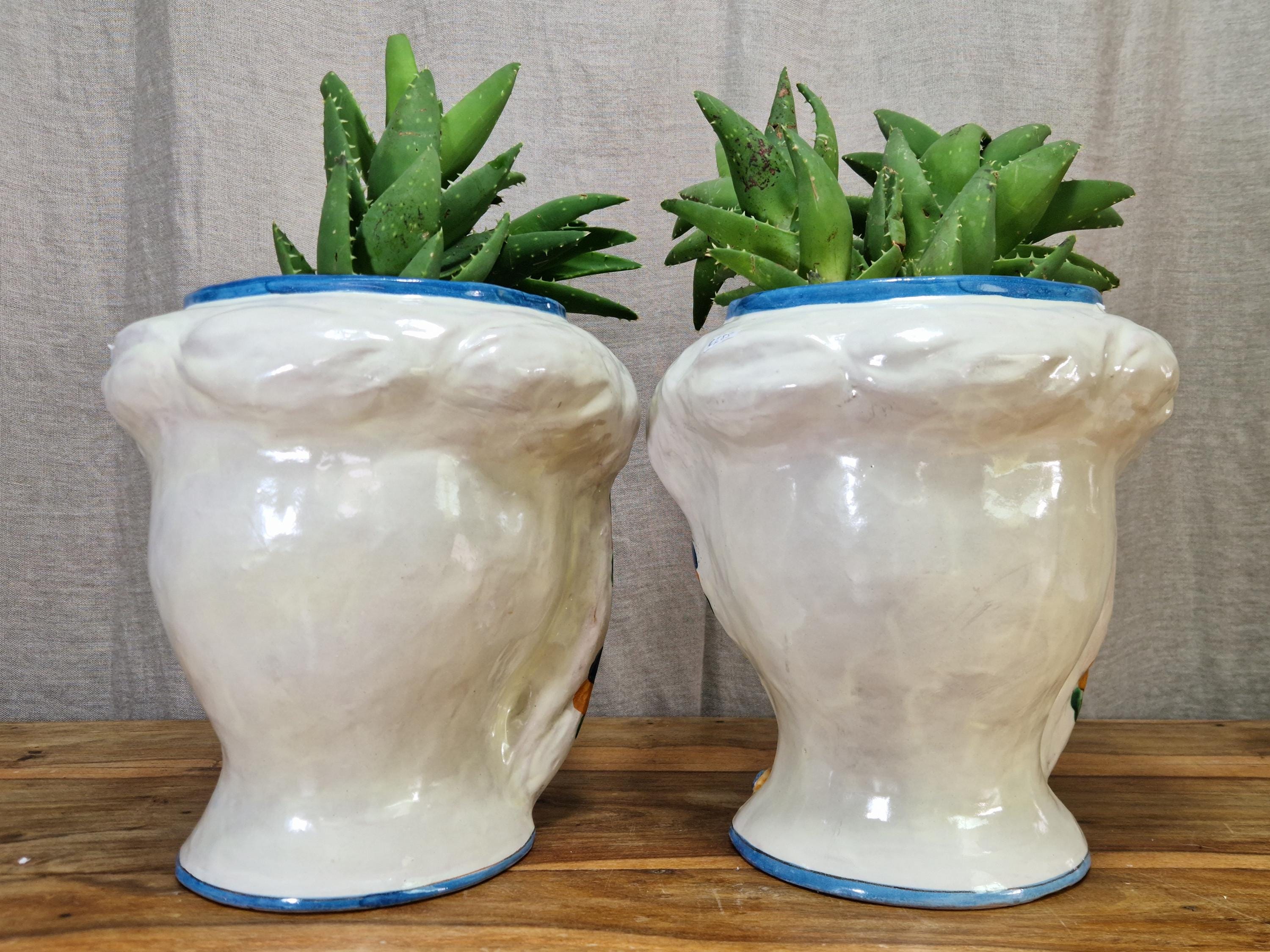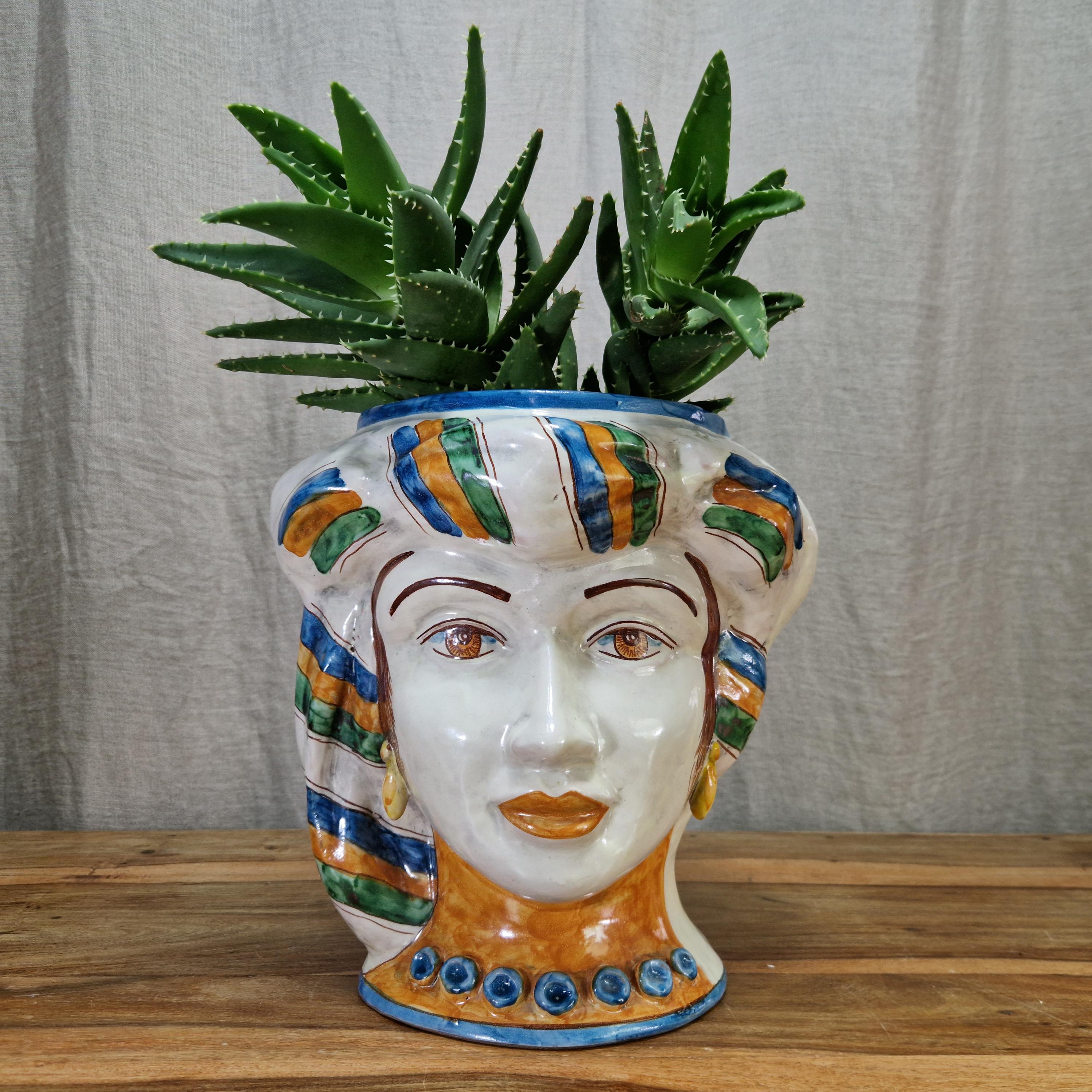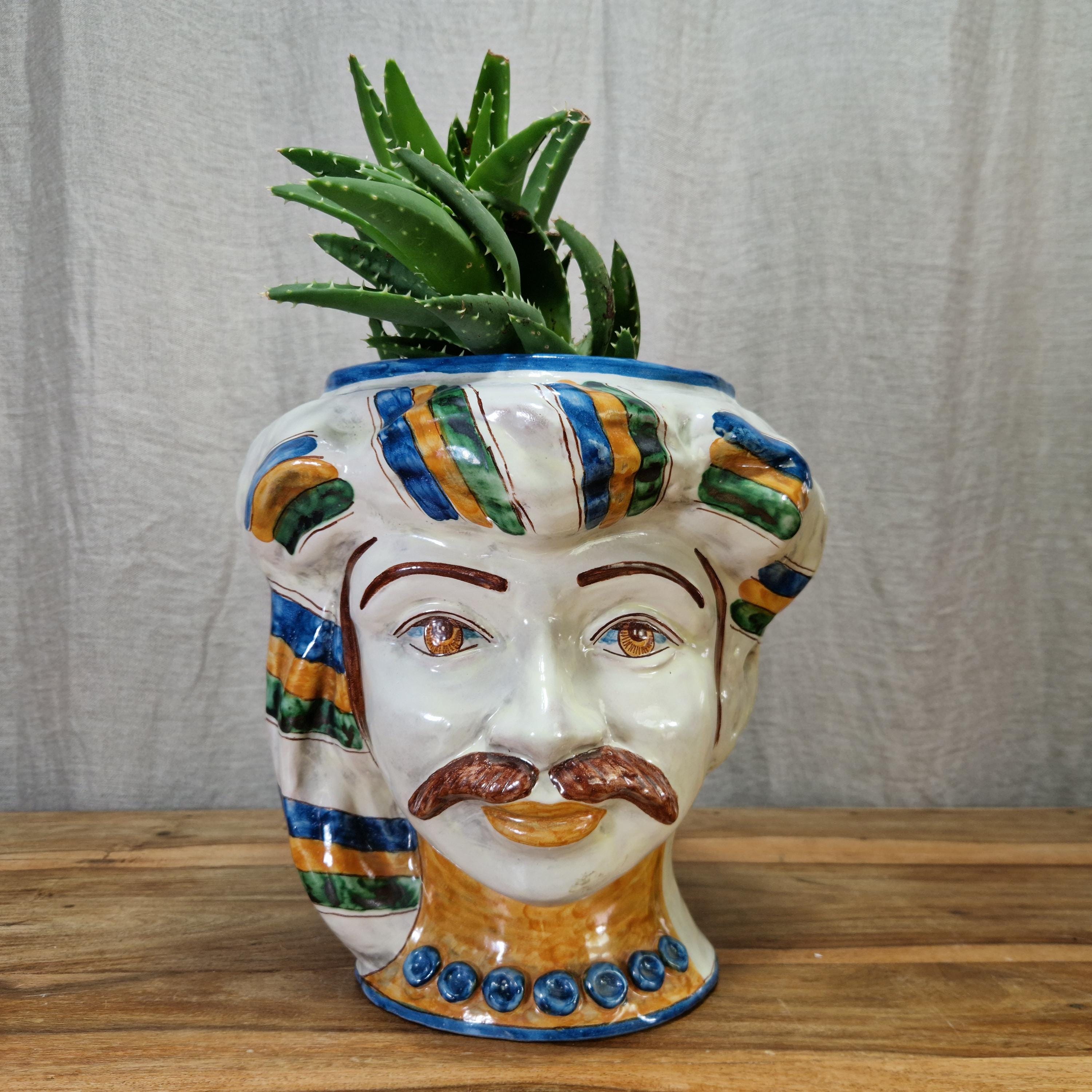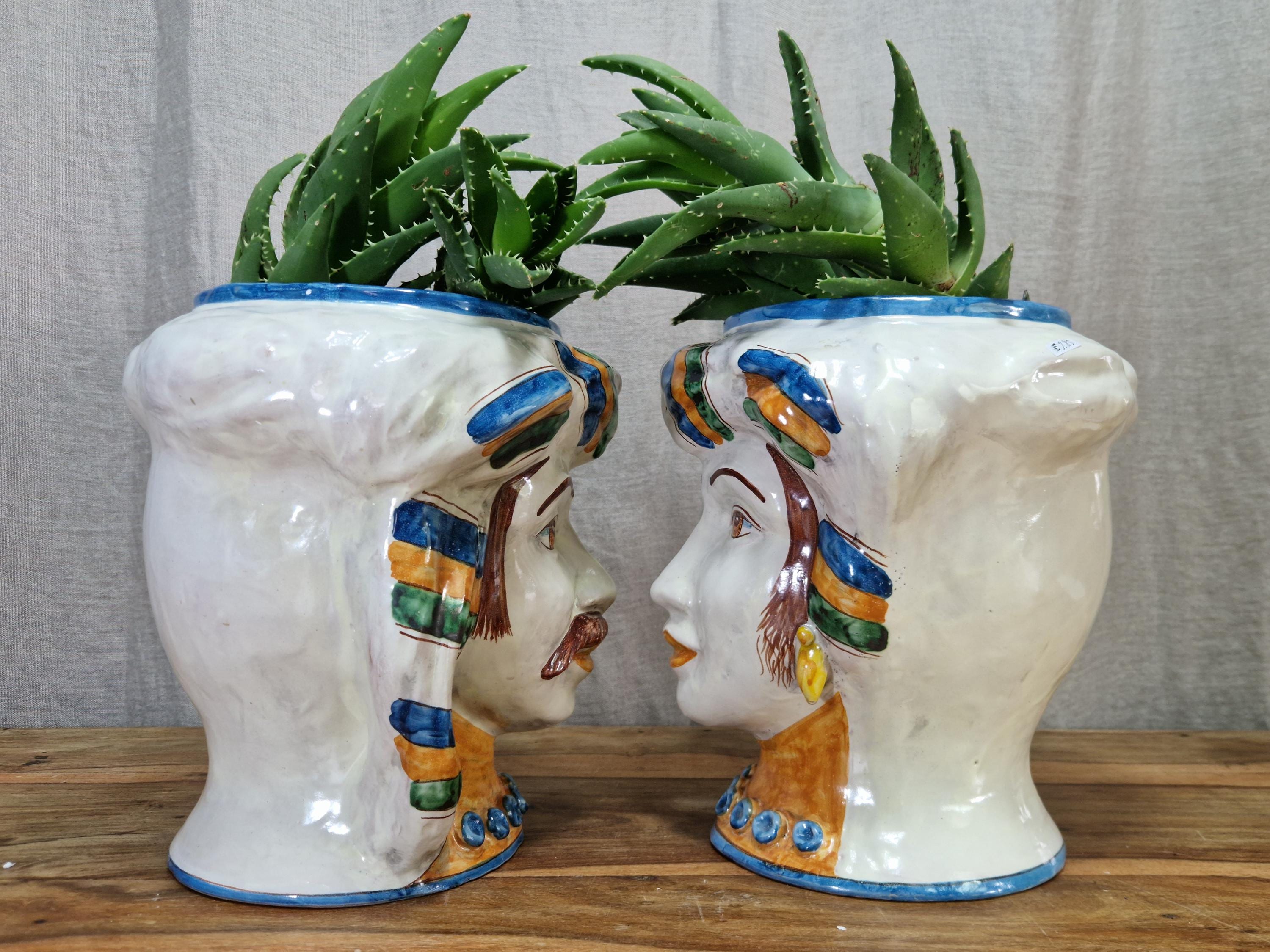 Large Sicilian Moor's heads in Caltagirone ceramic, entirely hand-made in shape and decoration, H28 W28