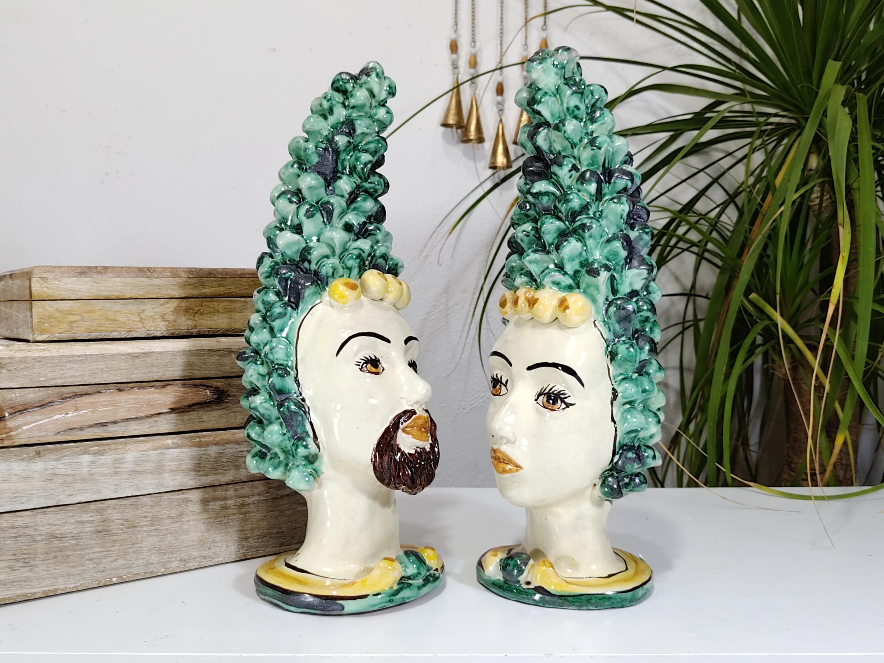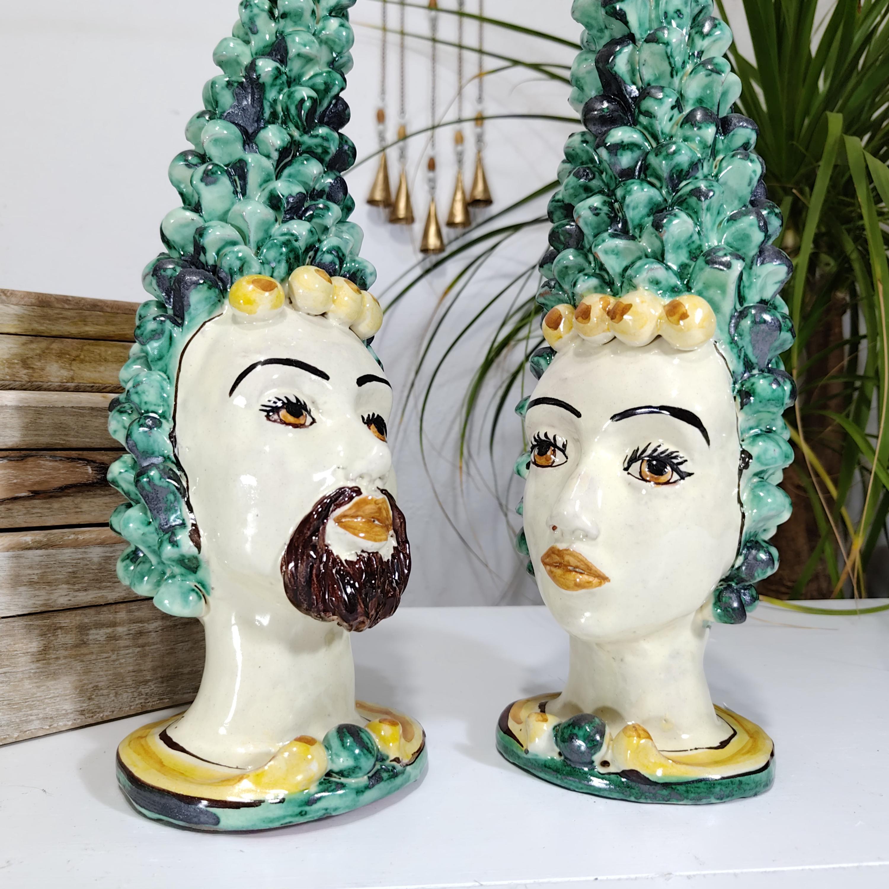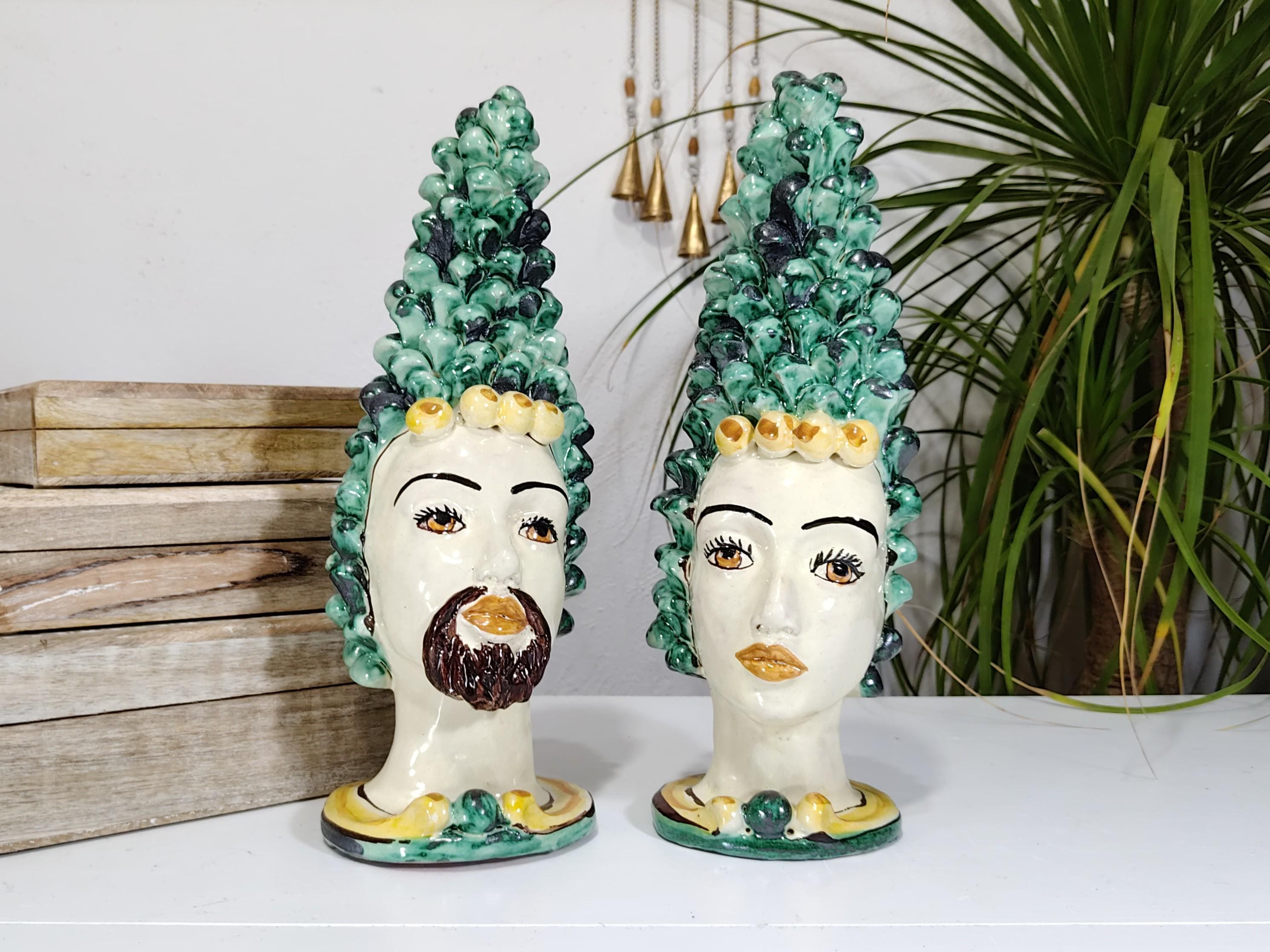 Sicilian anthropomorphic heads in Caltagirone ceramics, entirely hand-crafted in shape and decoration.