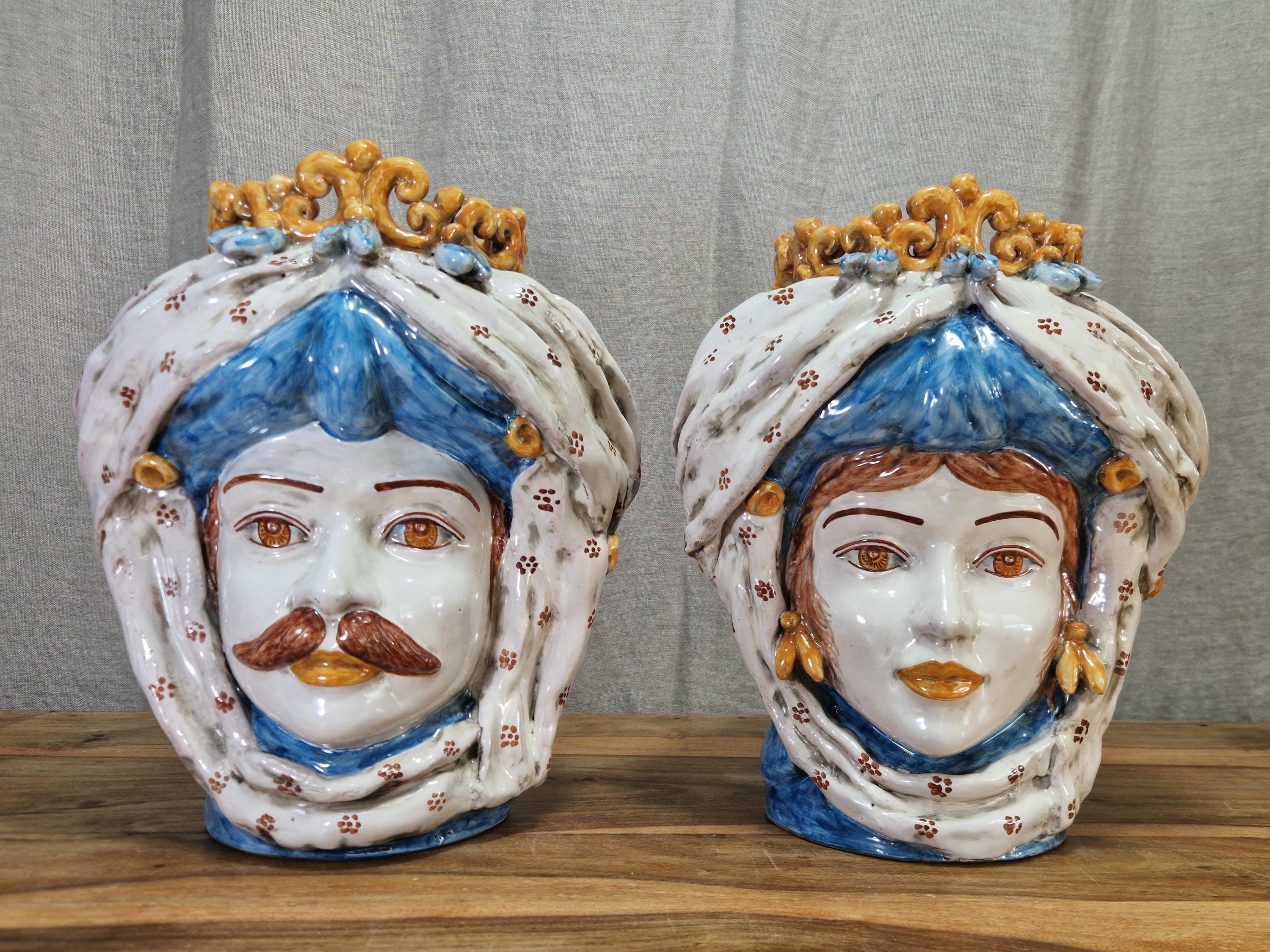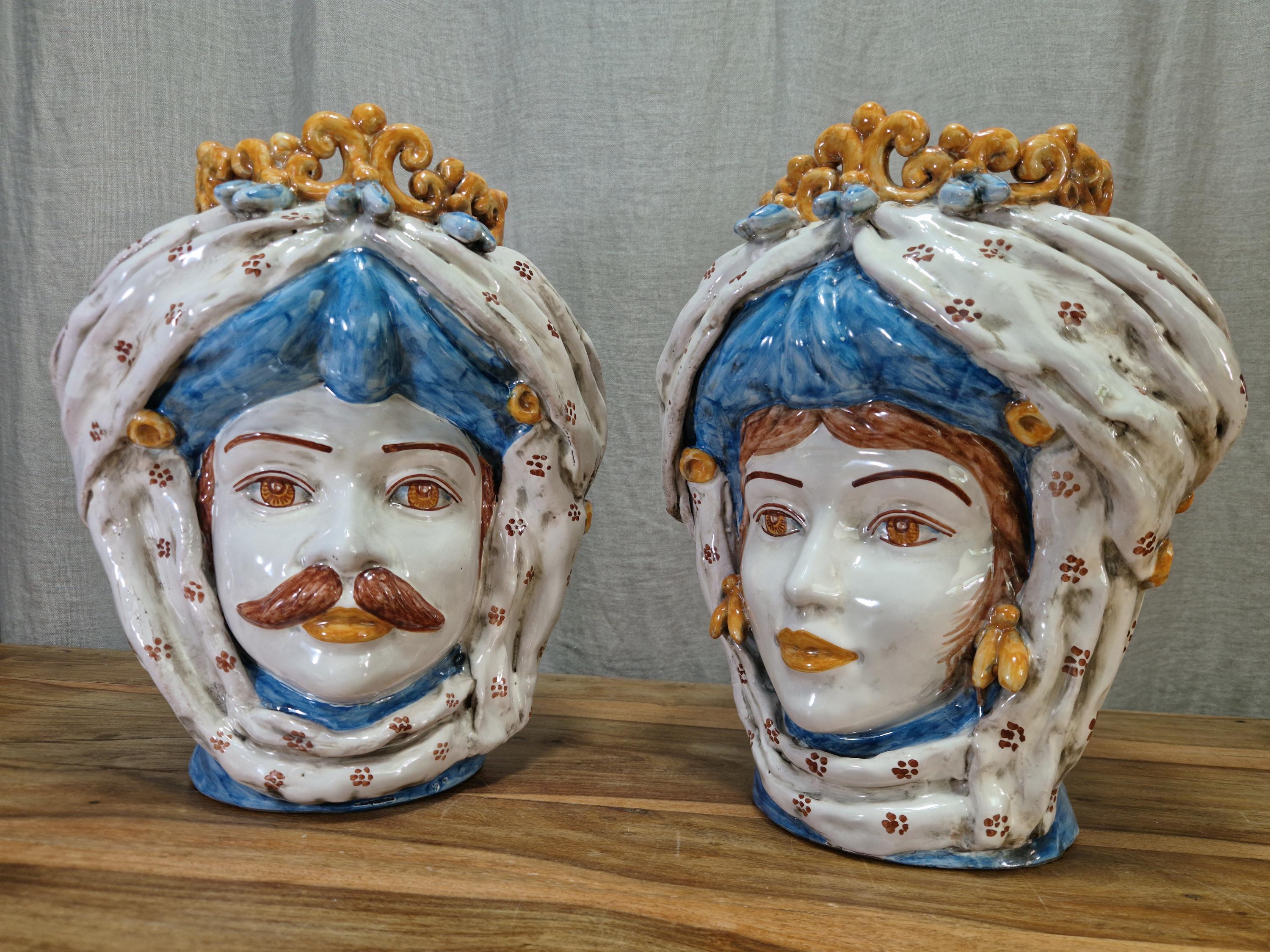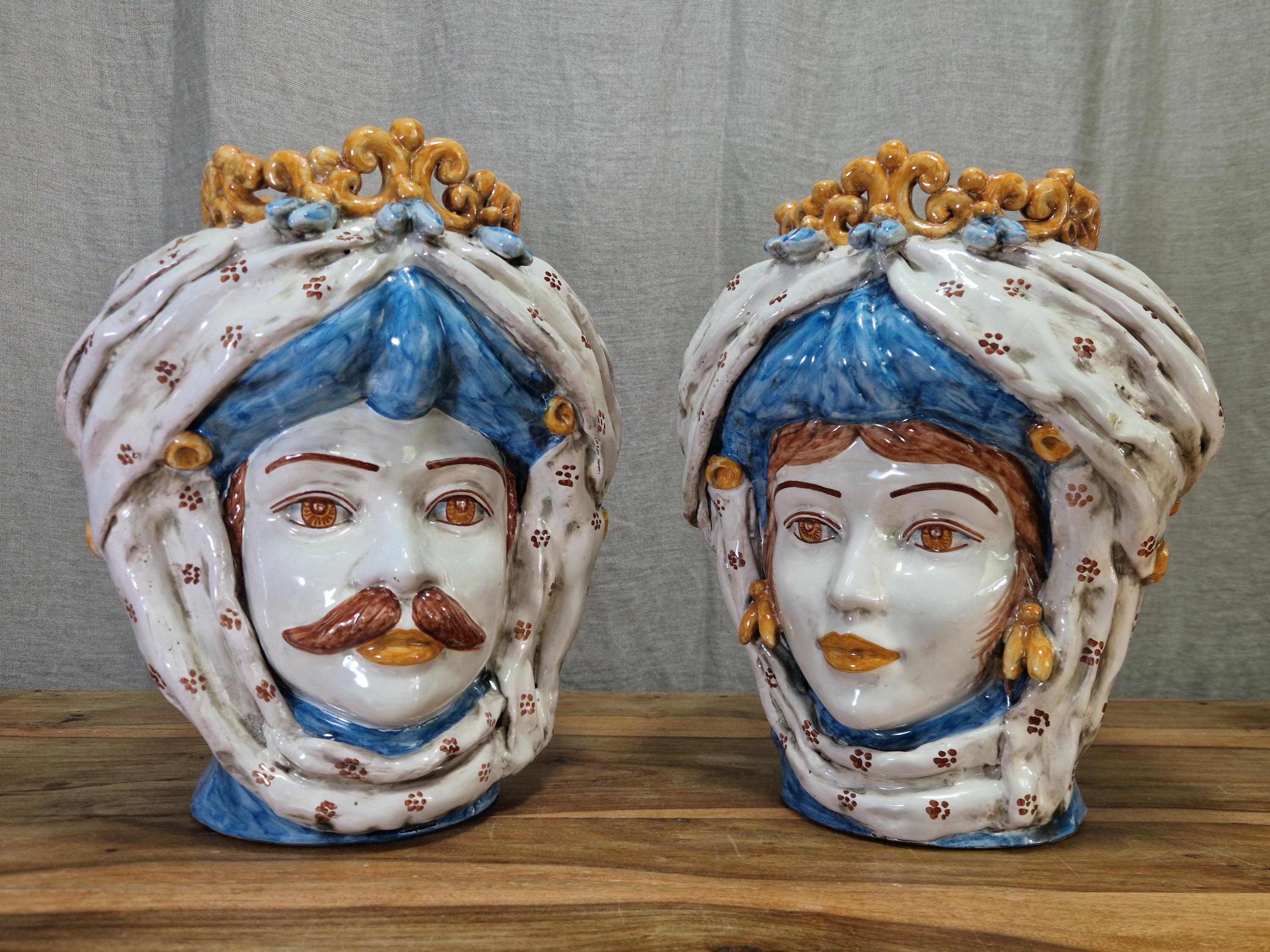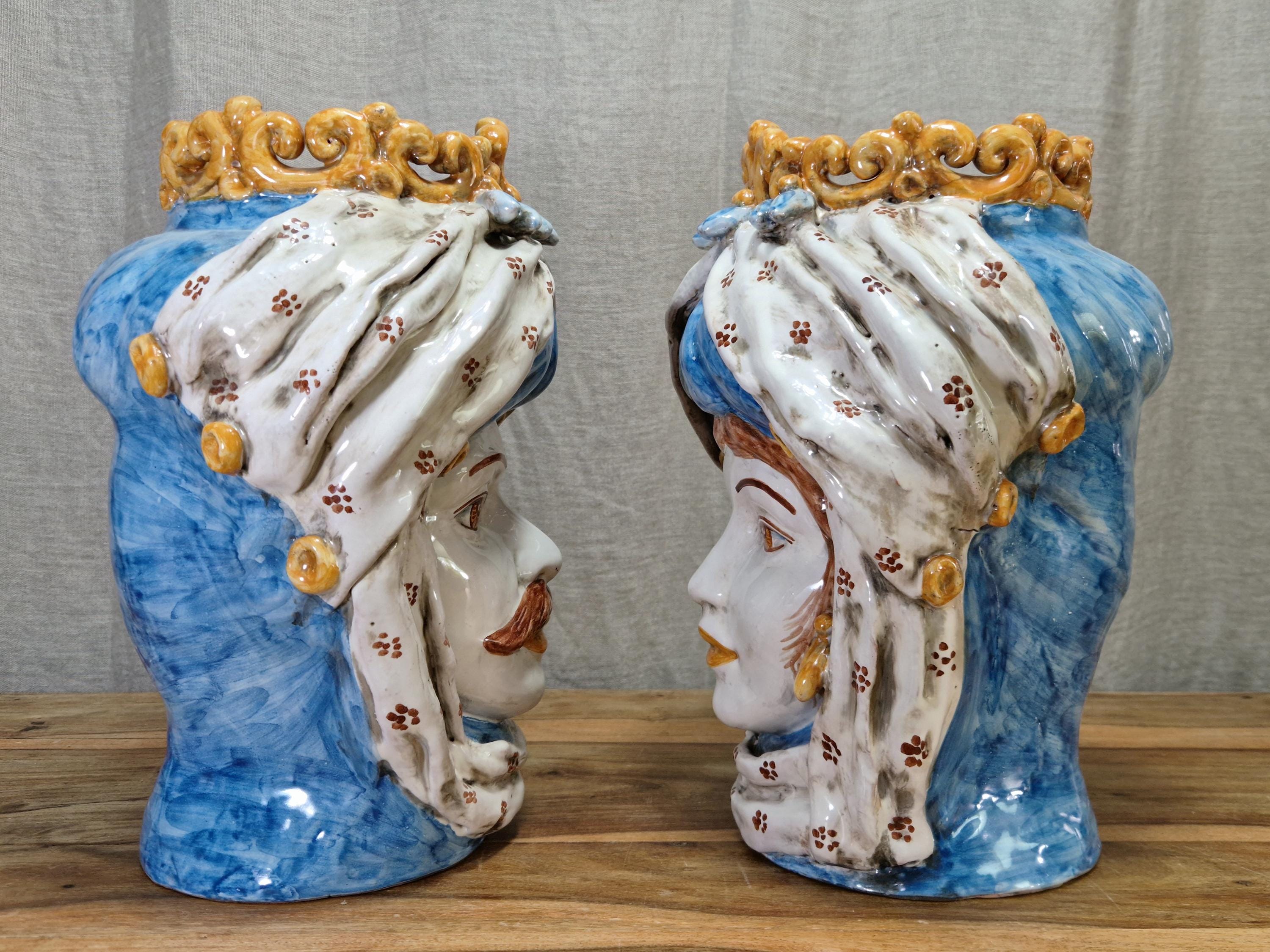 Sicilian Moorish heads in Caltagirone ceramic, entirely hand-crafted in shape and decoration, H34 W30