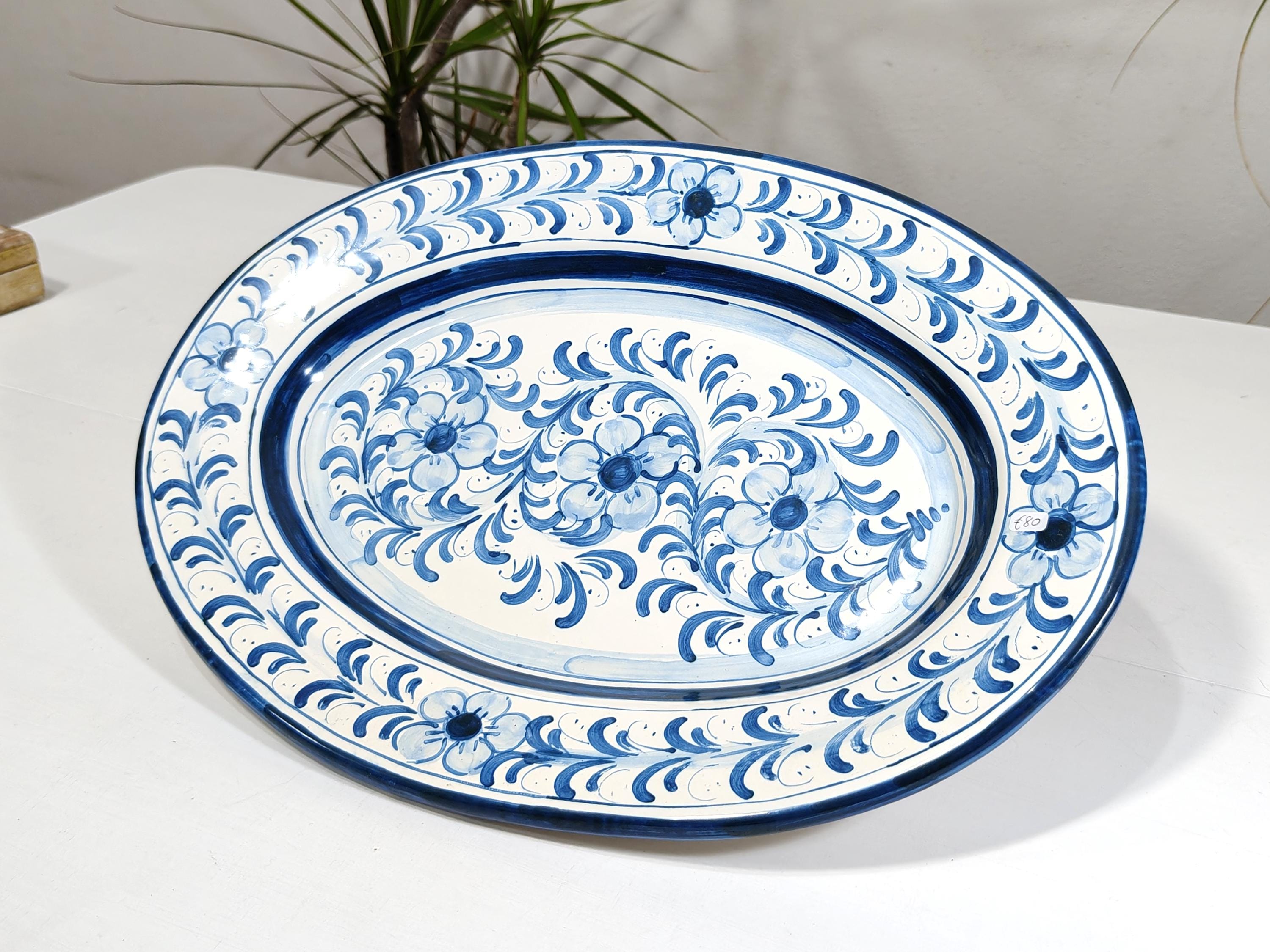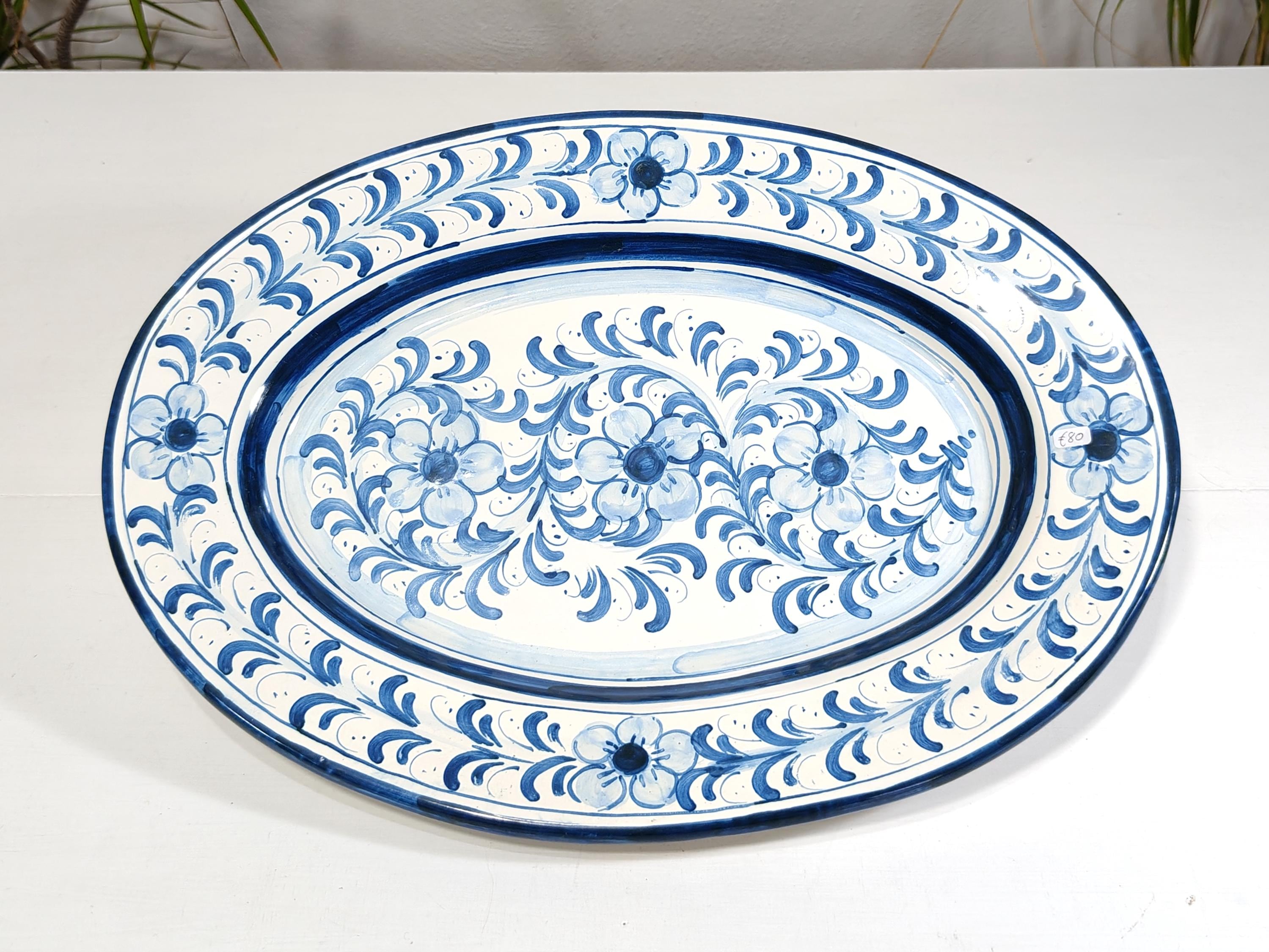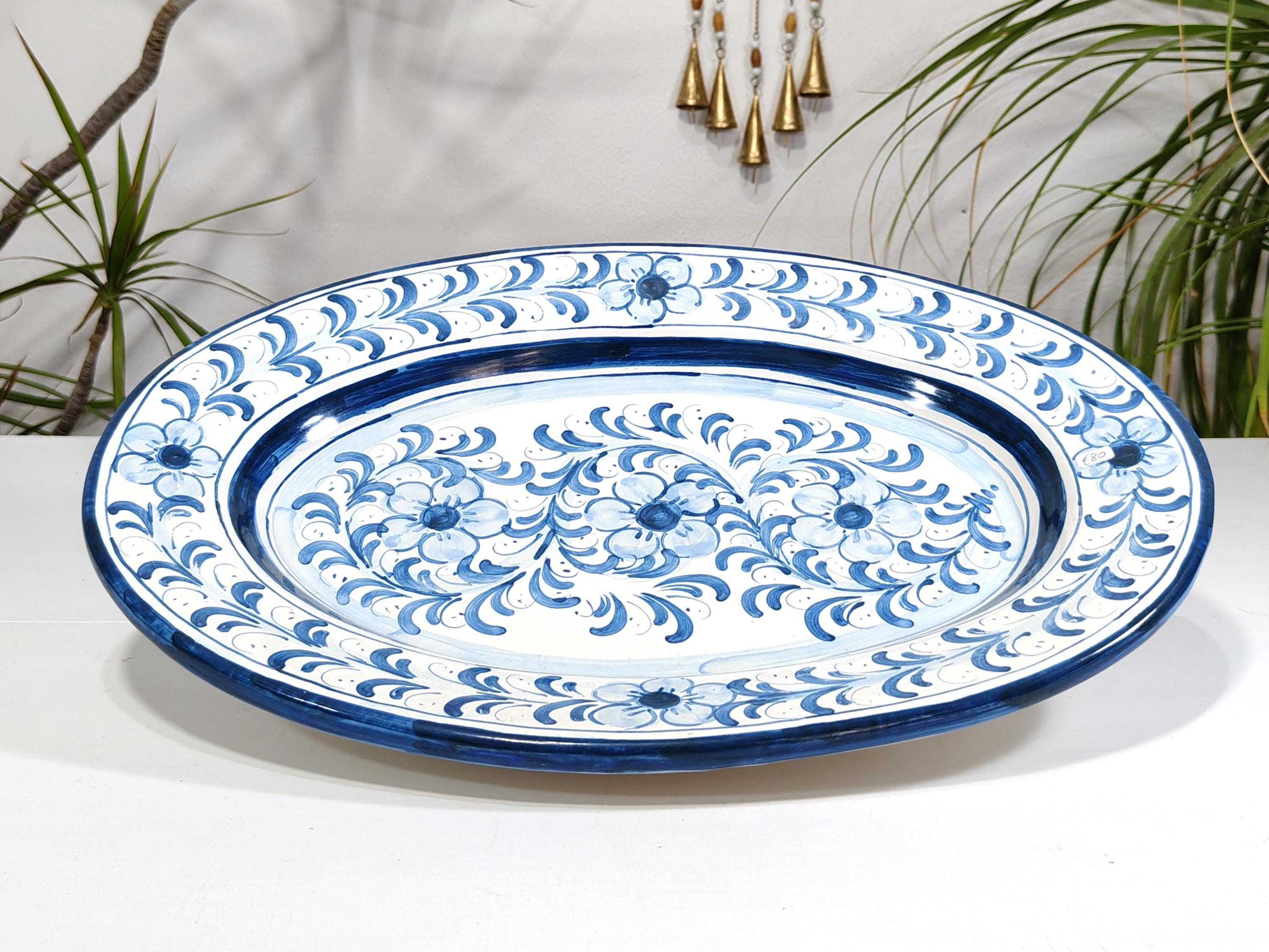 41 cm oval plate from Sicilian Caltagirone with classic Floral Blue decoration, pizza plate, underplate, serving plate.