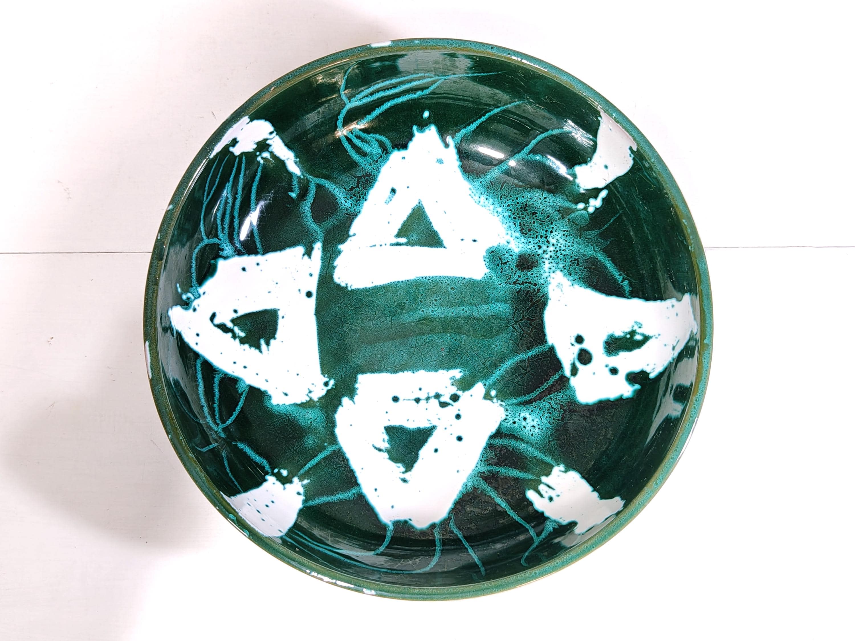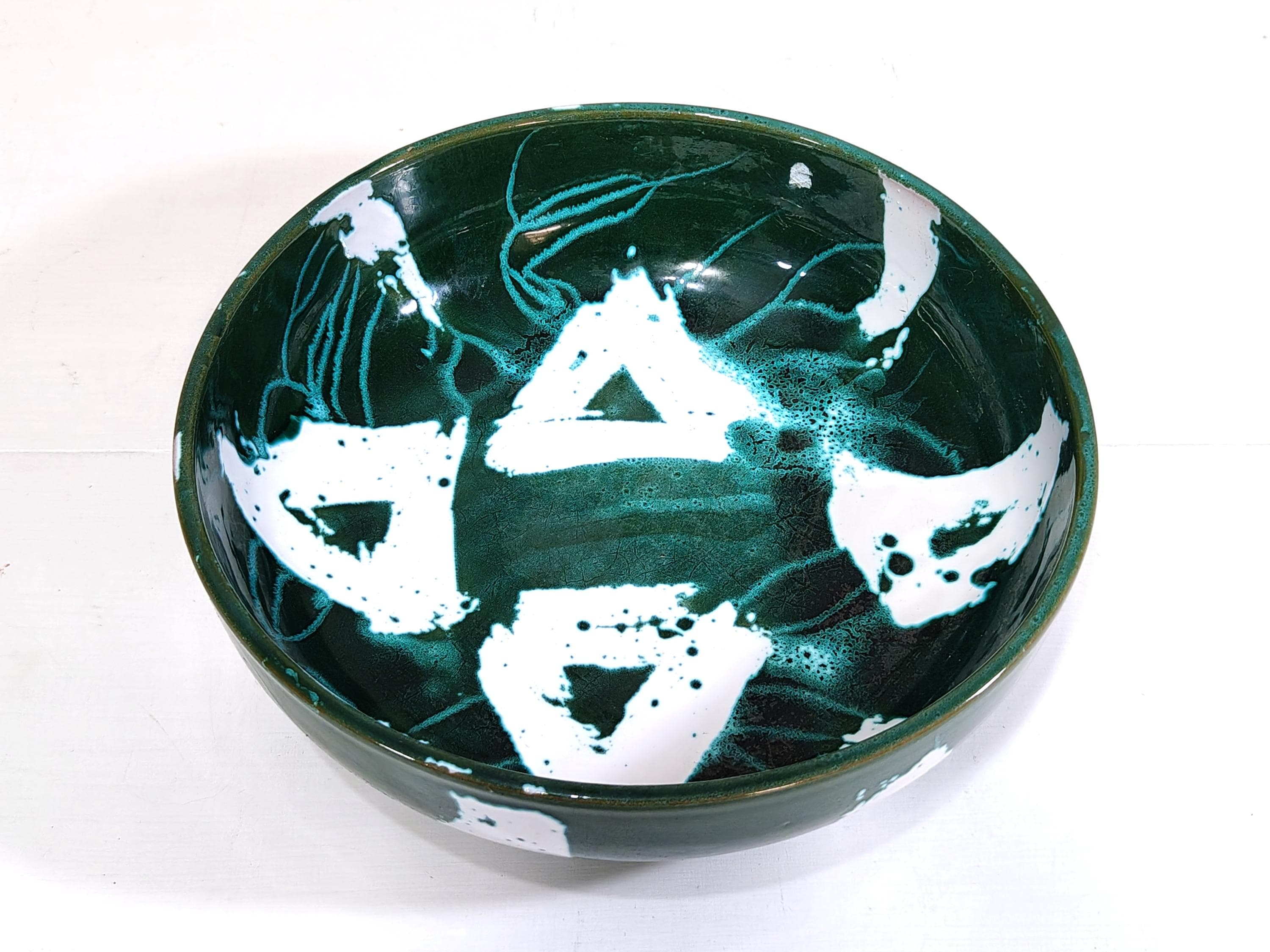 it is fired several times at high temperatures with overlapping colours and finished with abstract decorations,
