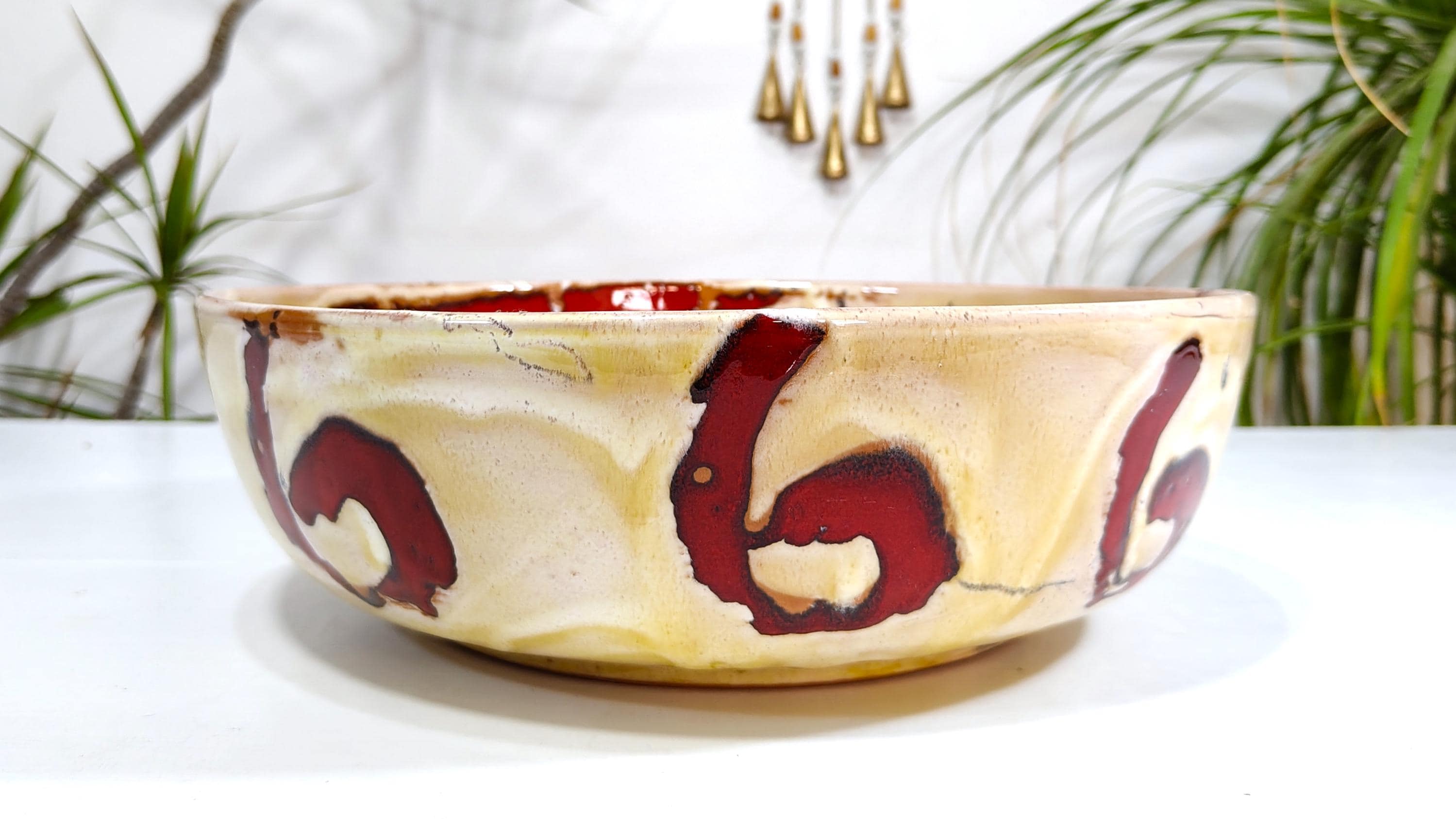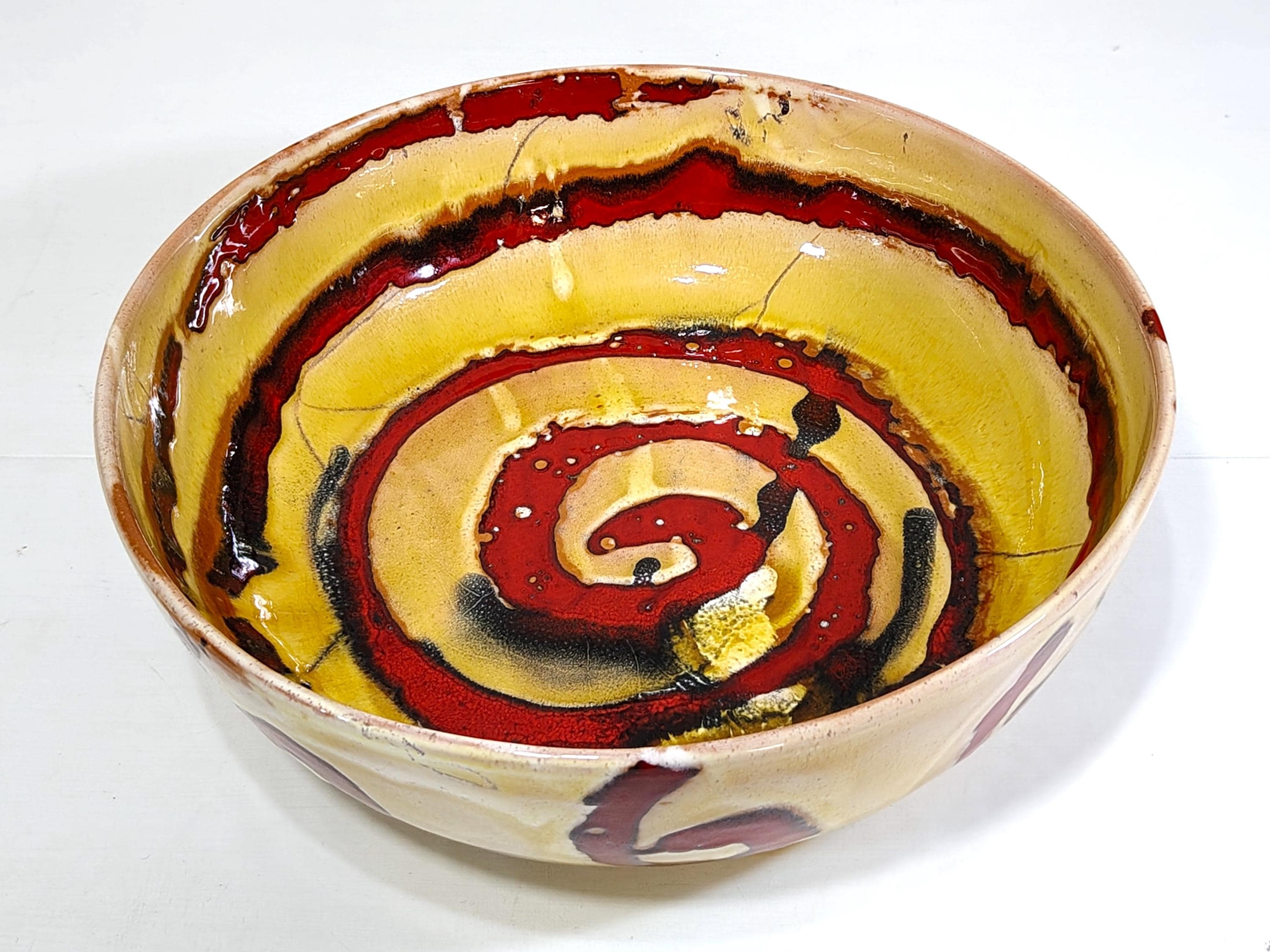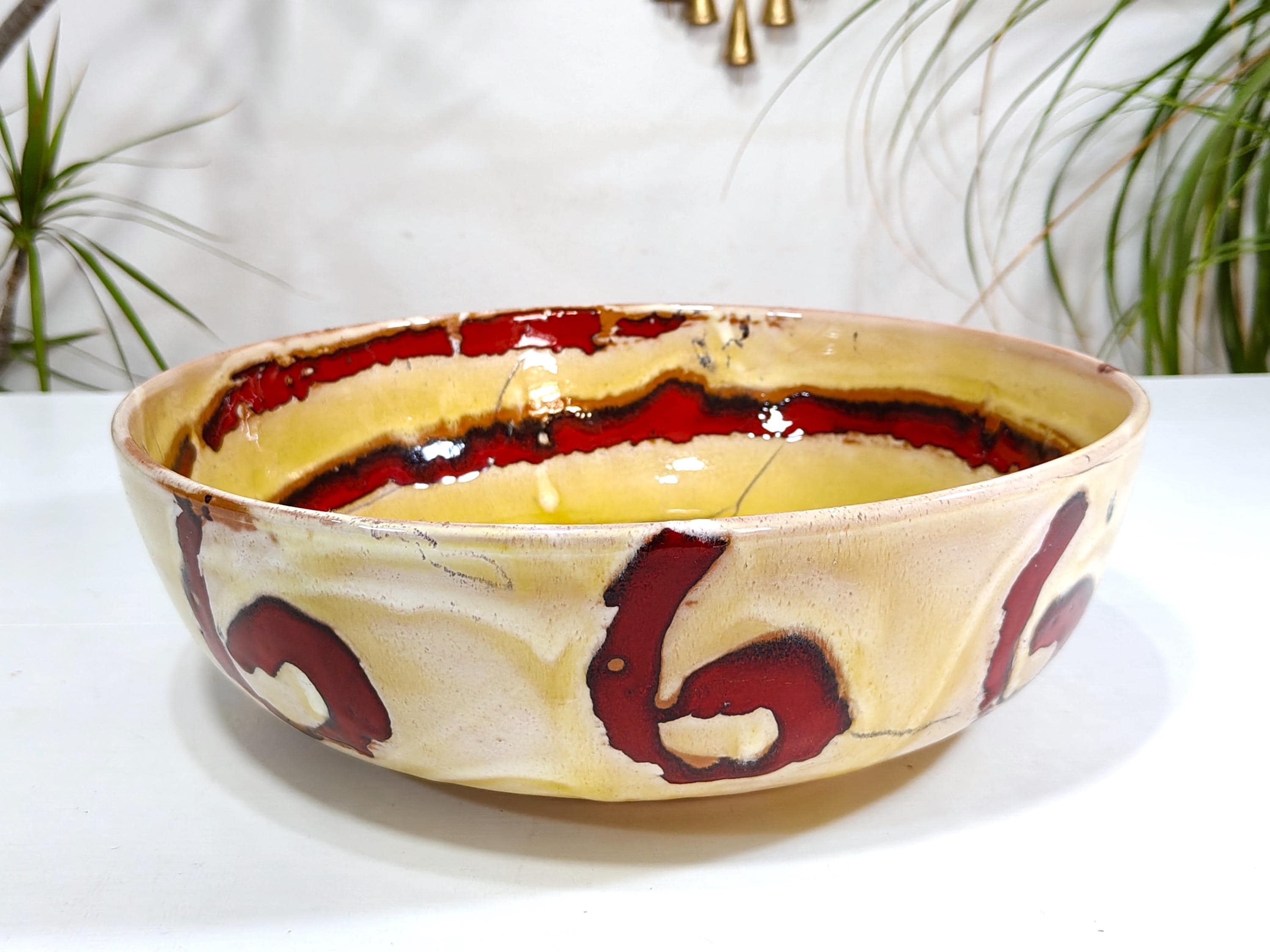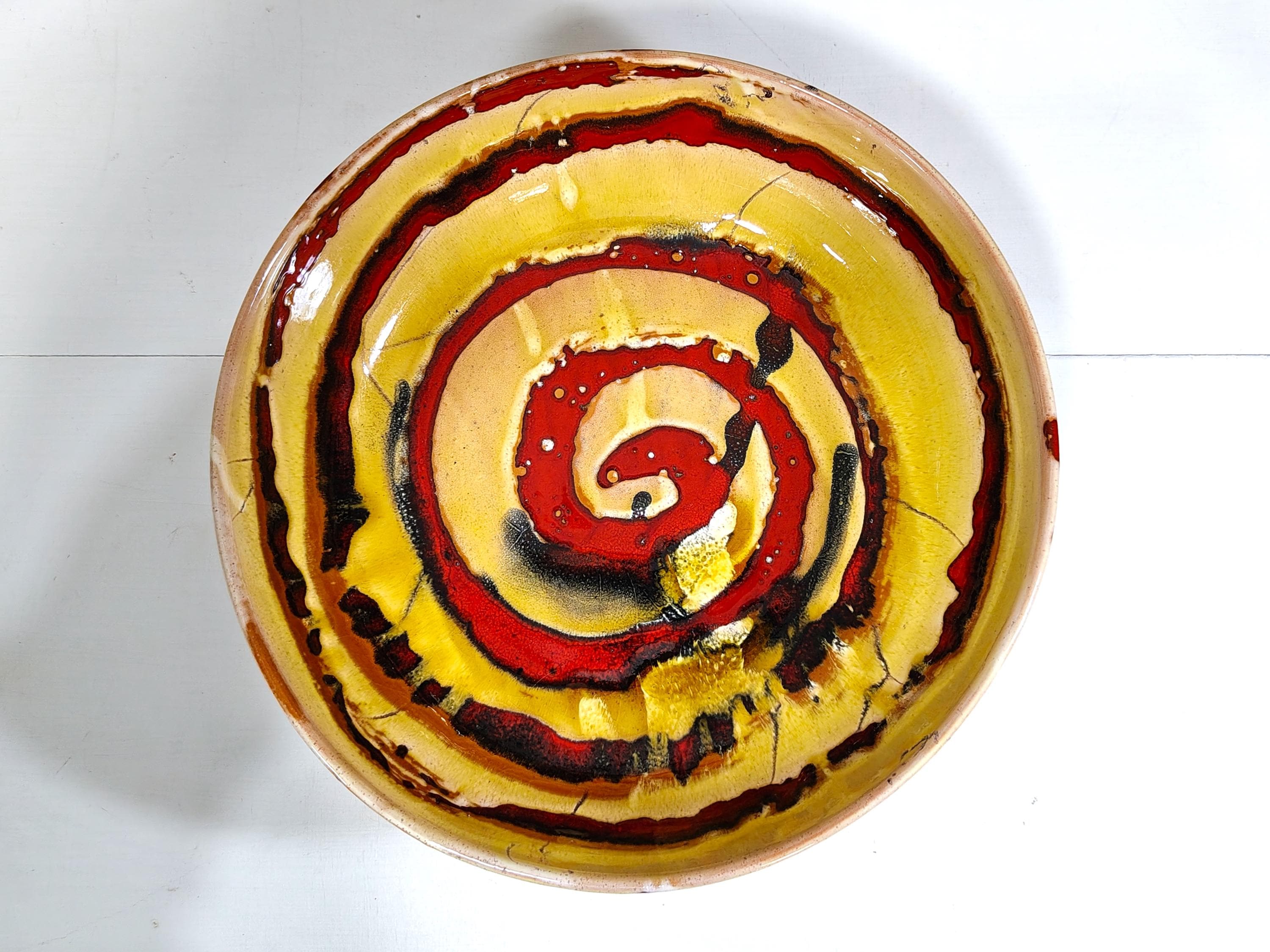 it is fired several times at high temperatures with overlapping colours and finished with abstract decorations,