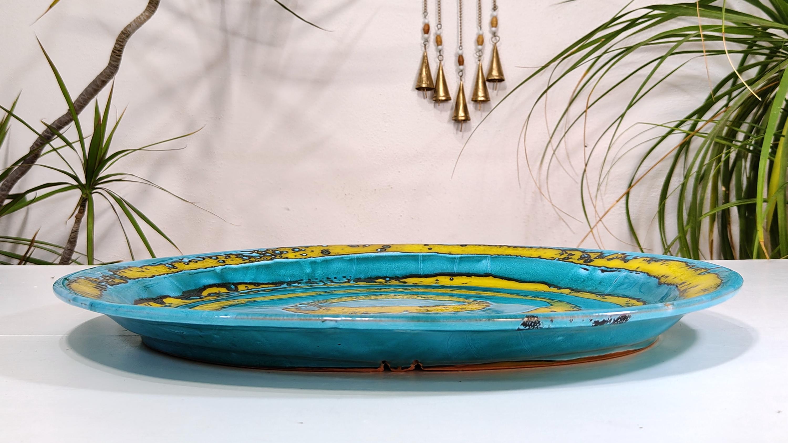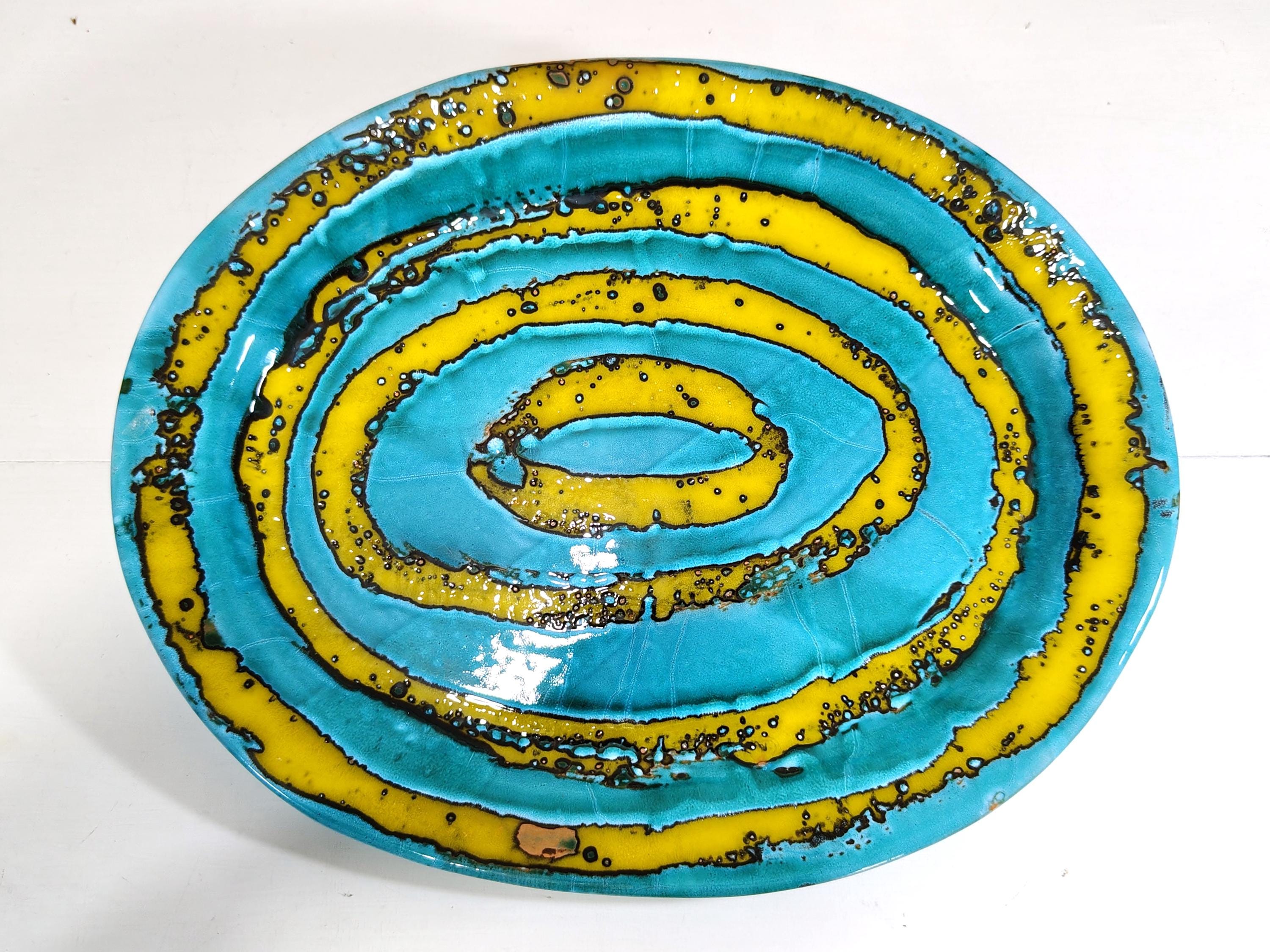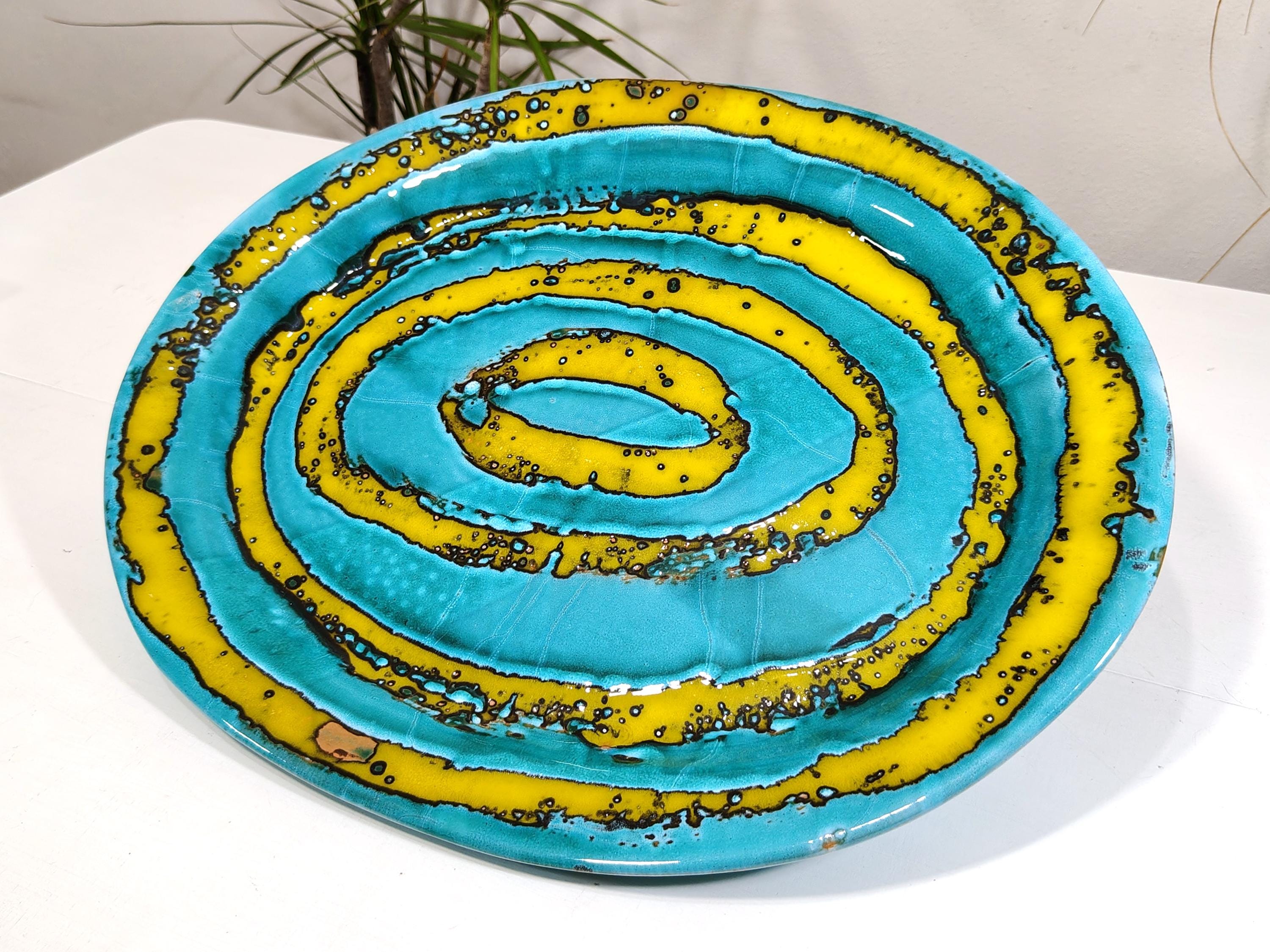 it is fired several times at high temperatures with overlapping colours and finished with abstract decorations,