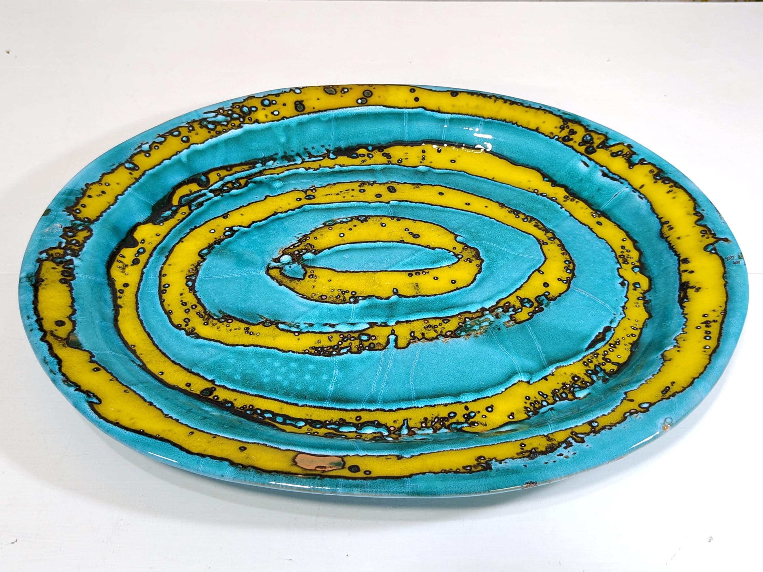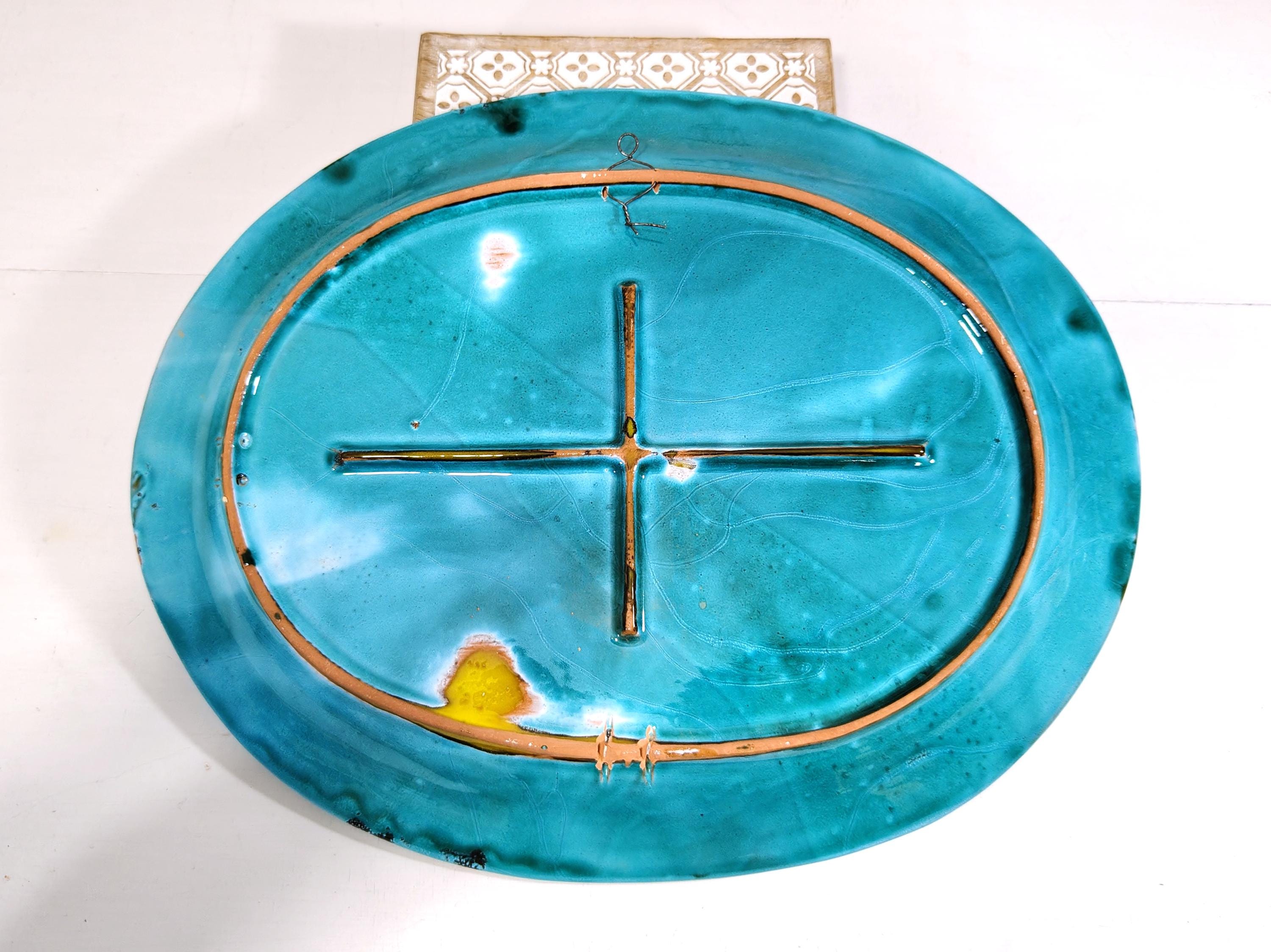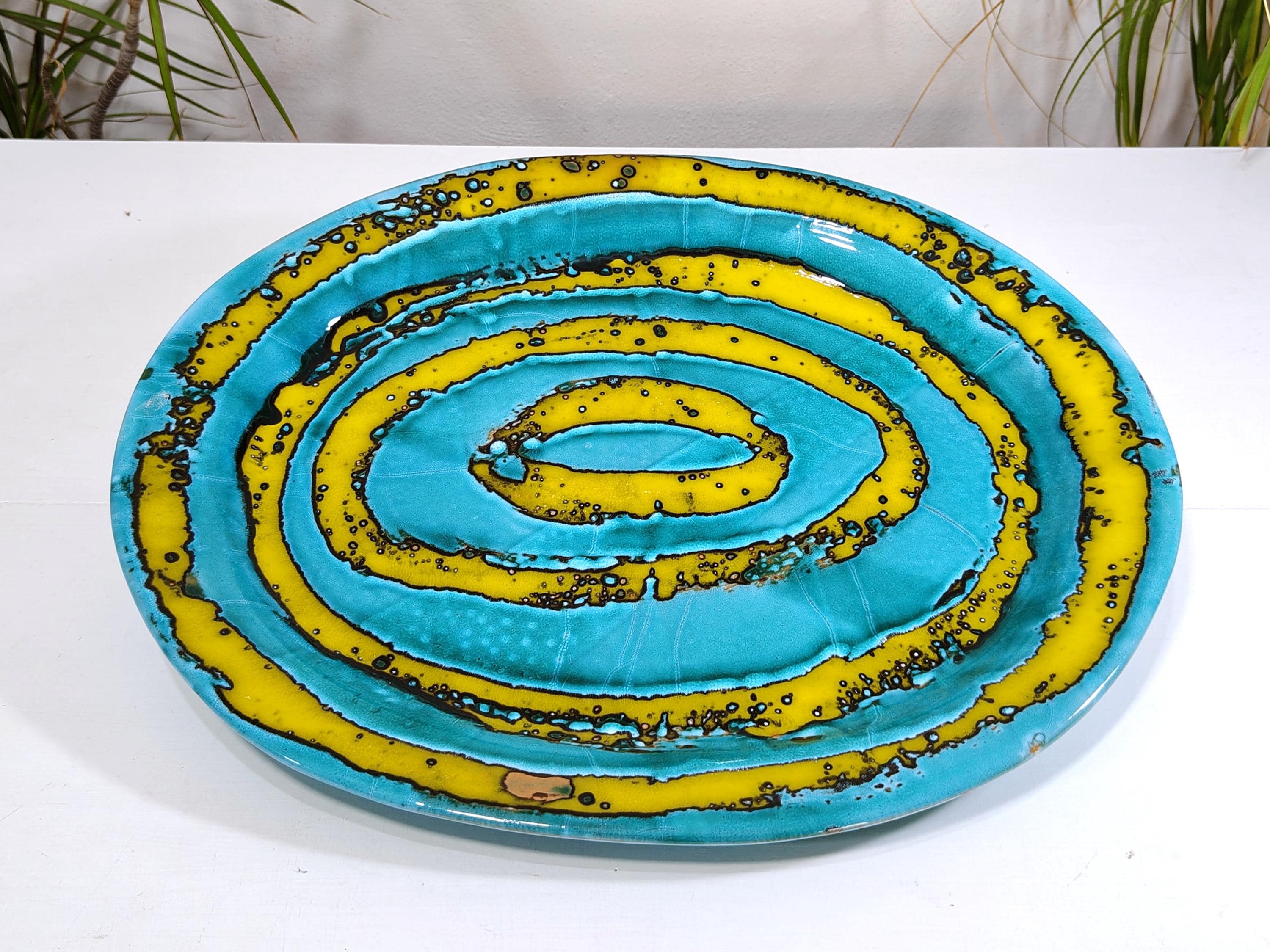 it is fired several times at high temperatures with overlapping colours and finished with abstract decorations,
