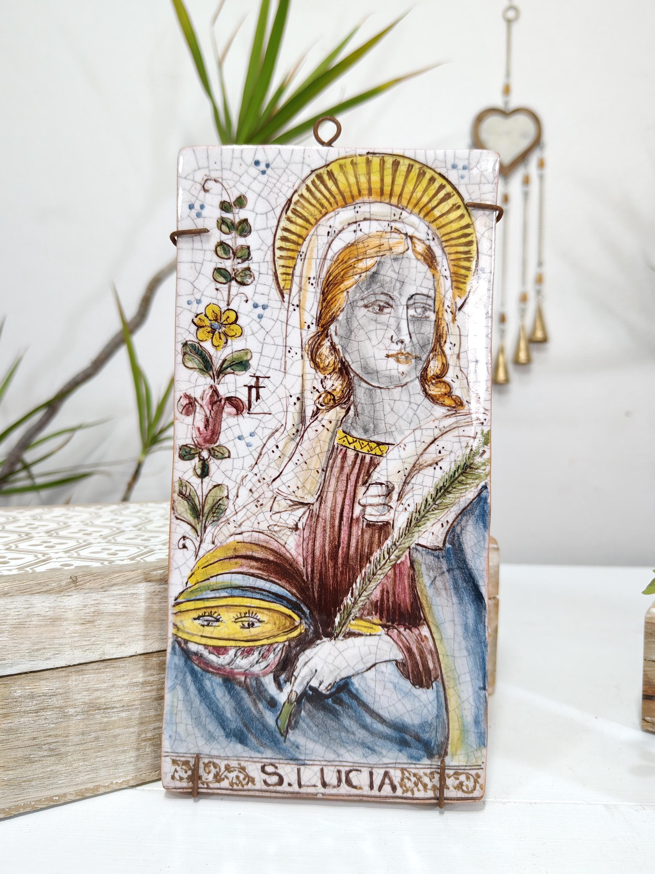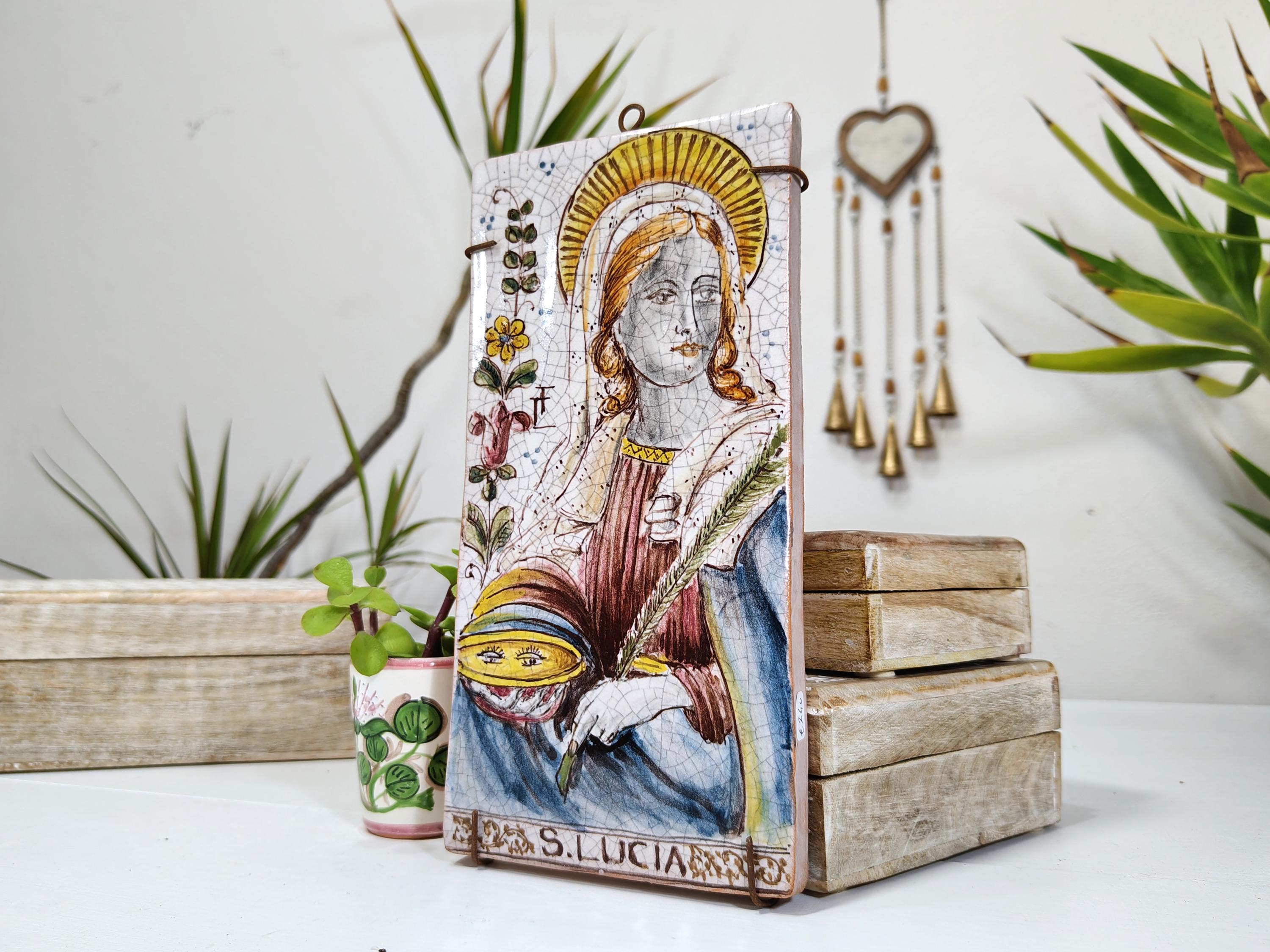 Ancient creation depicting Saint Lucia on a ceramic brick base dating back to around 1960 and 1970 by the master craftsman L.Gerbino originally from Sicily from S. Stefano di Camastra,