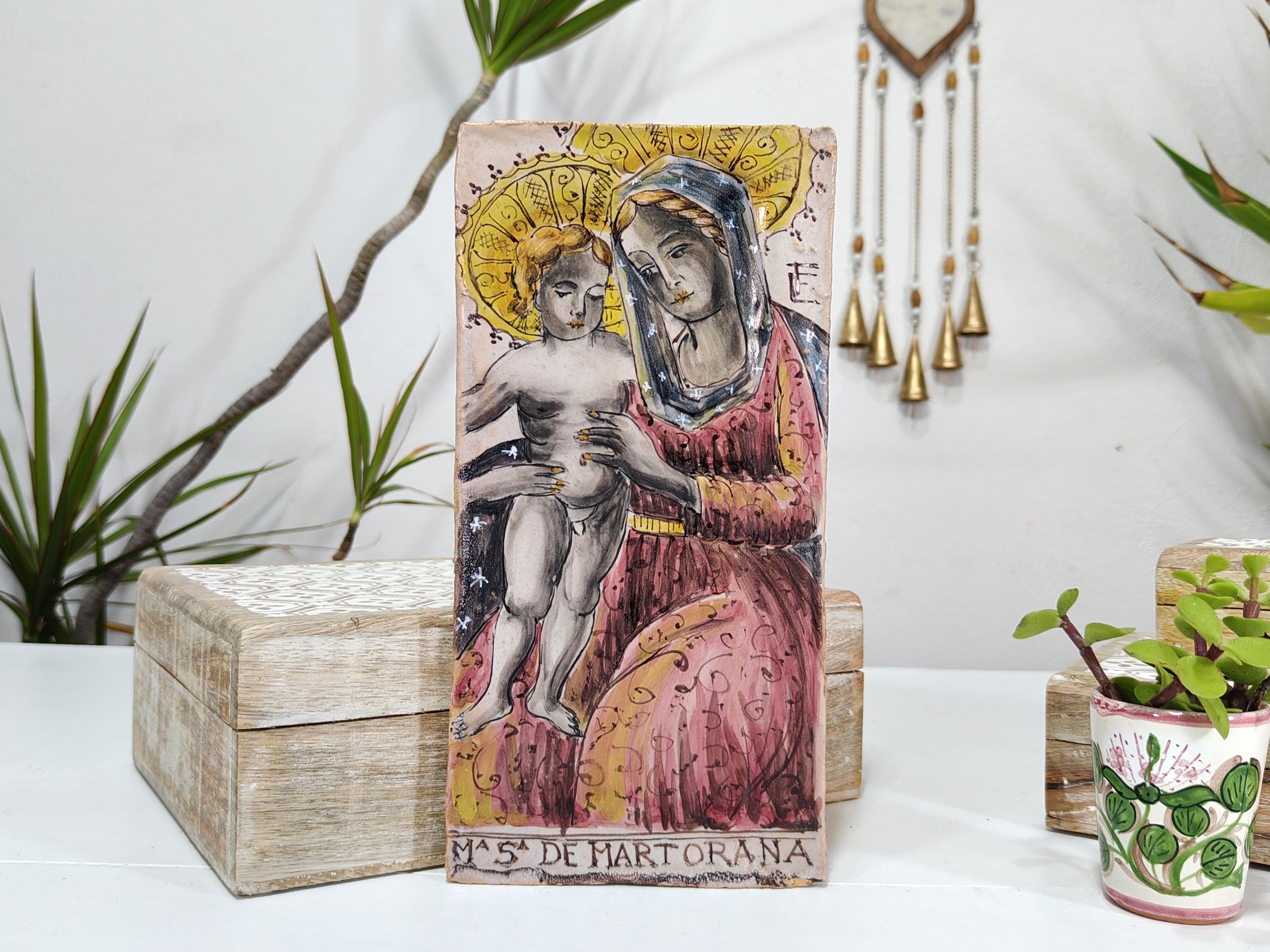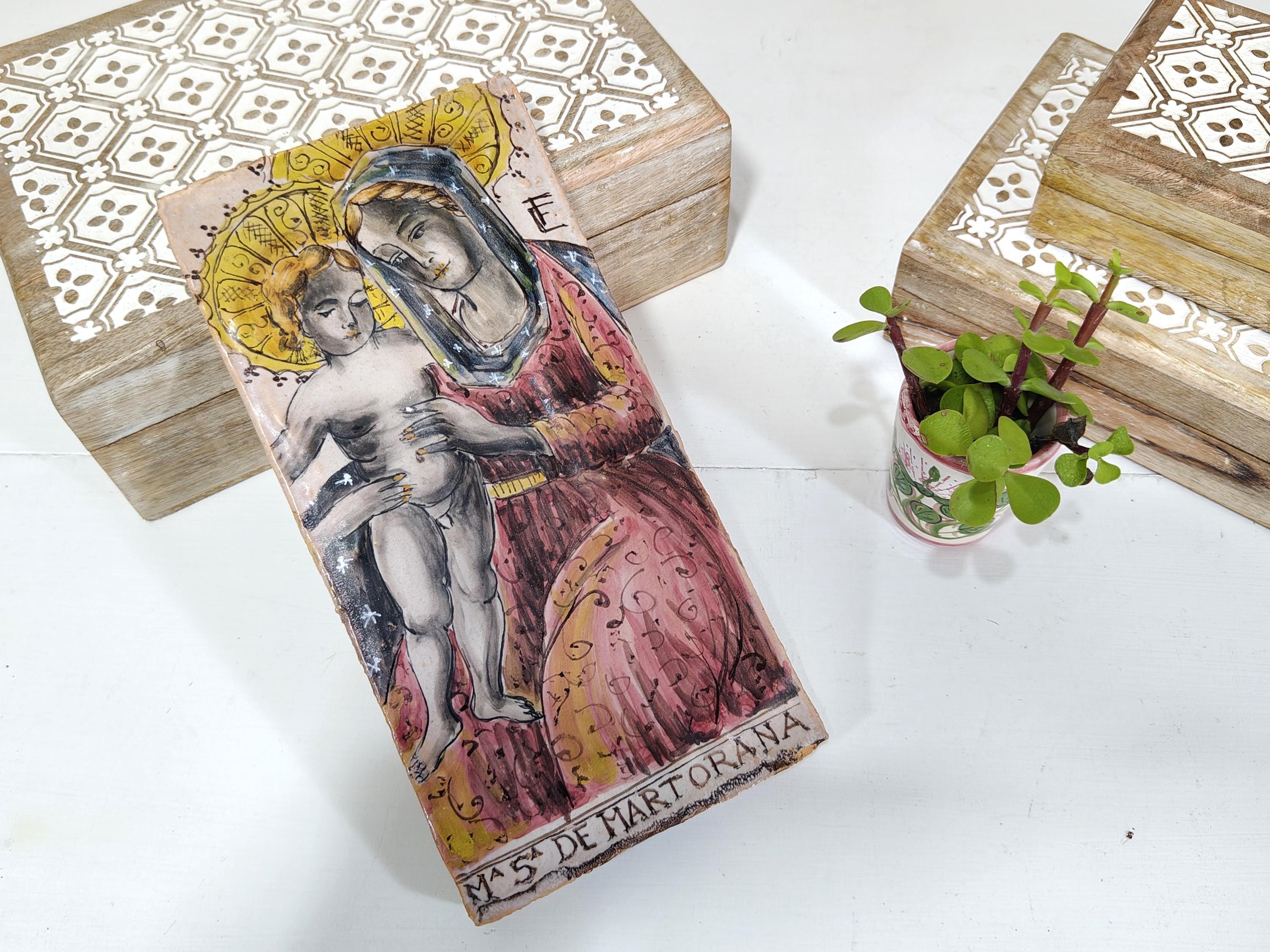 Ancient creation depicting the Madonna with Baby Jesus on a ceramic brick base dating back to around 1960 and 1970 by the master craftsman L.Gerbino originally from Sicily from S. Stefano di Camastra,