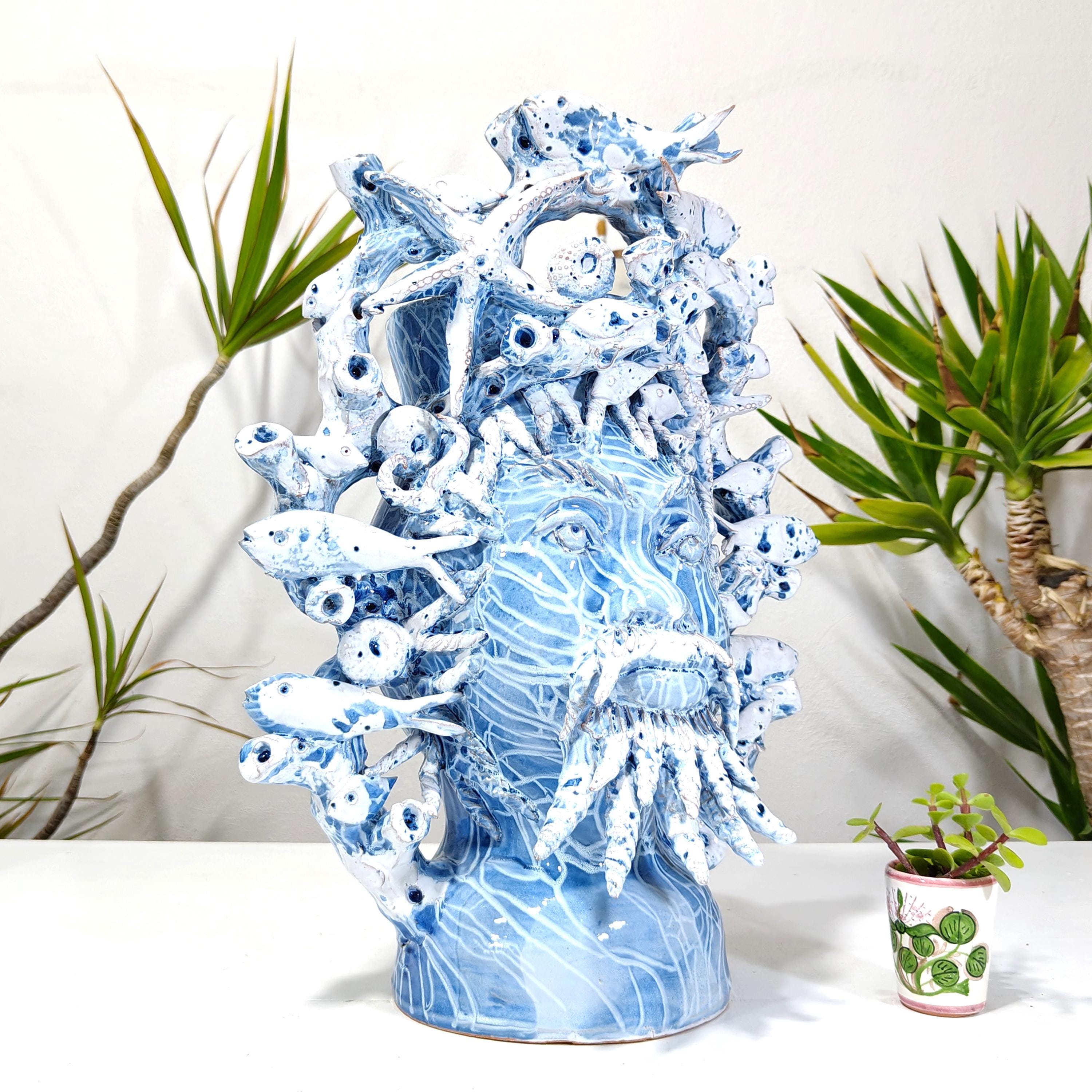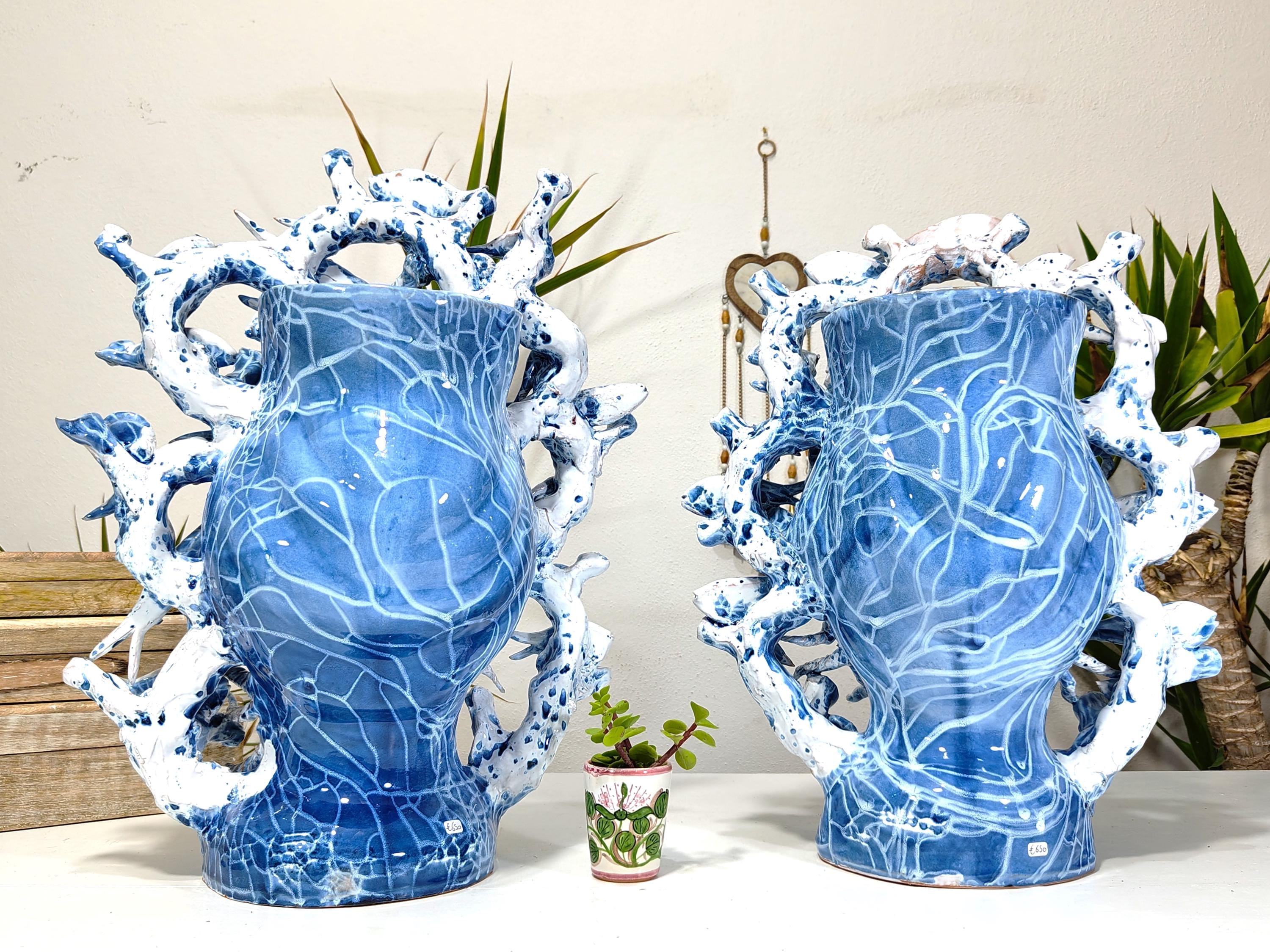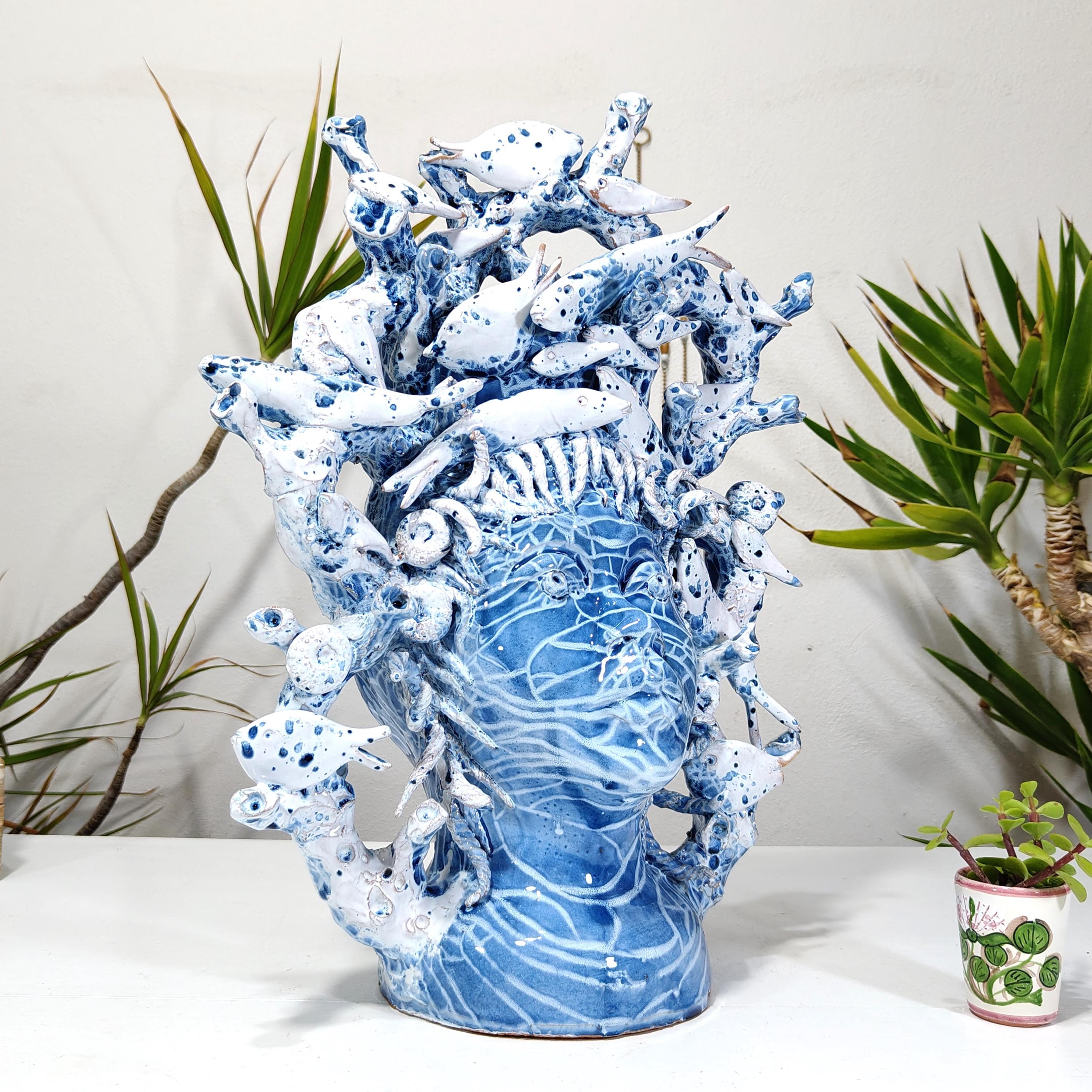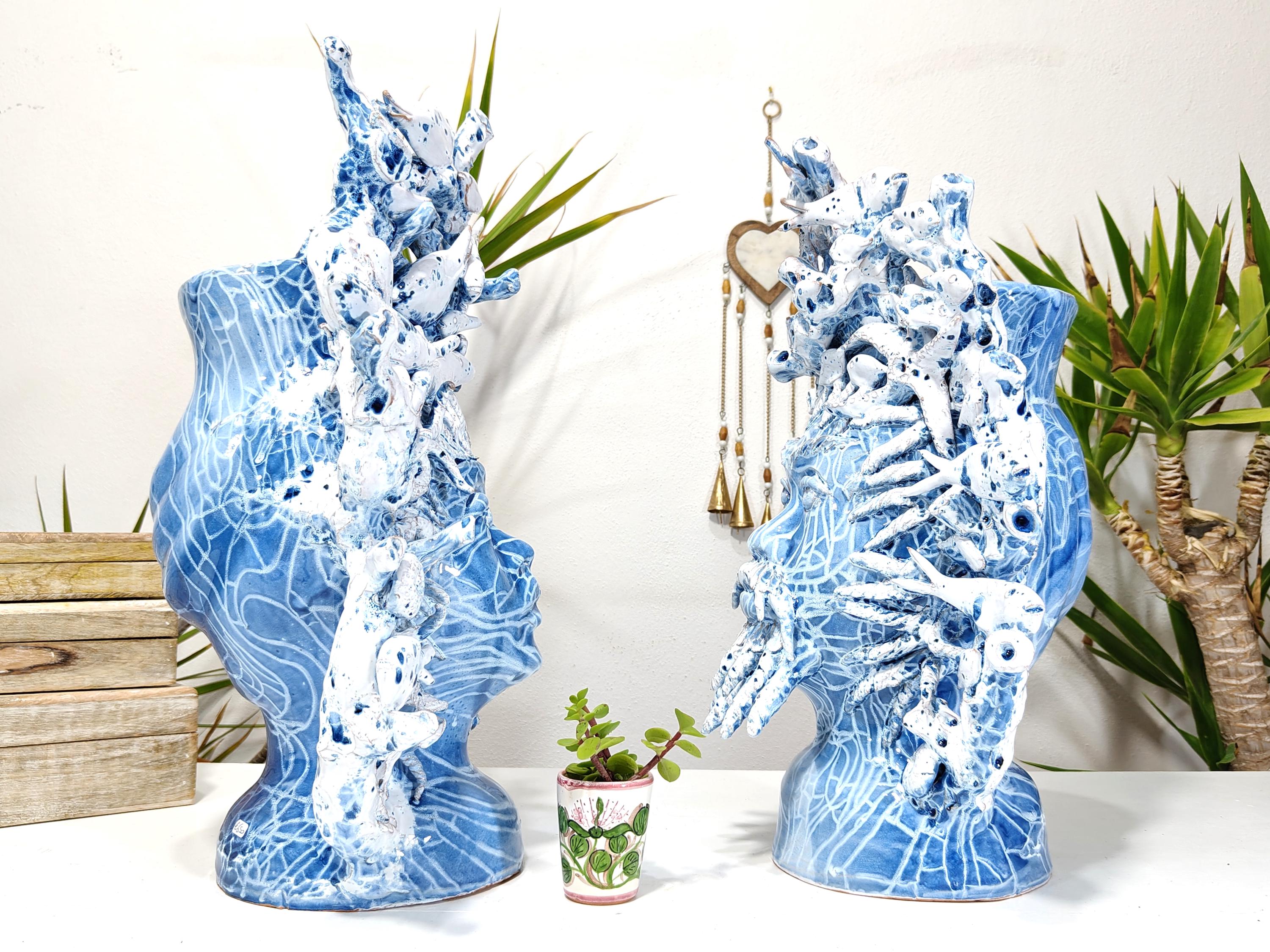Sicilian Moorish heads entirely hand-made, multicolored, light blue with white H46L38