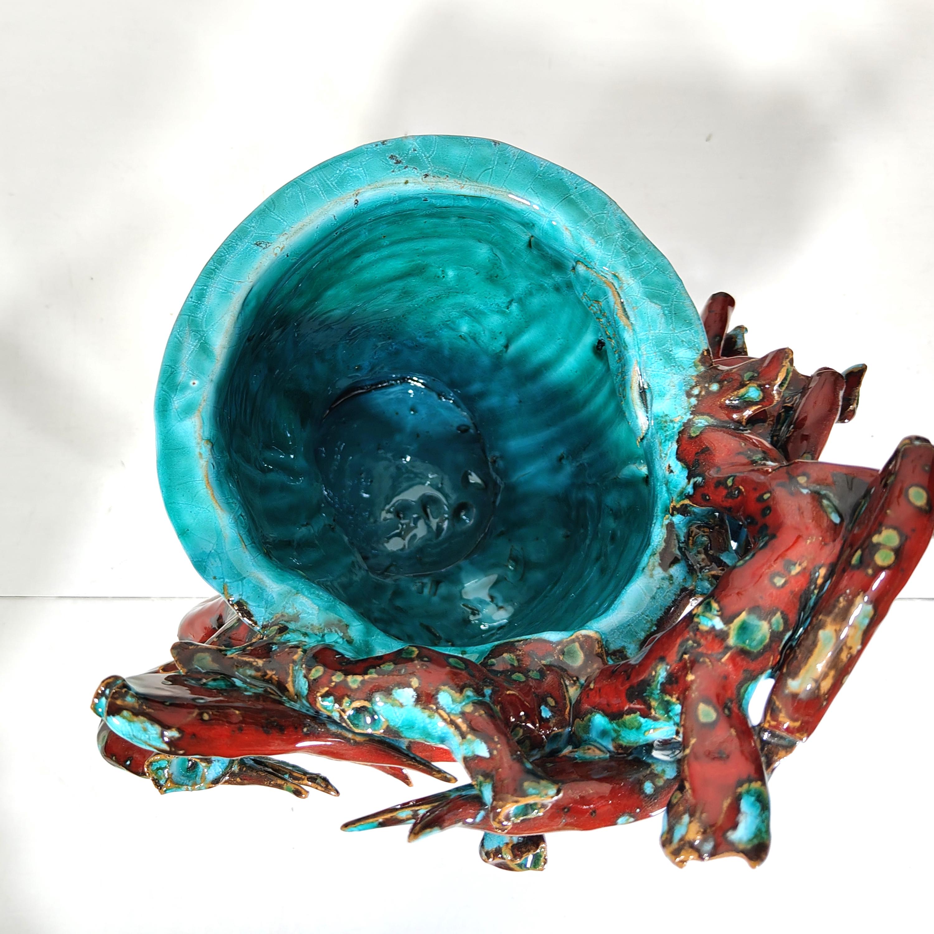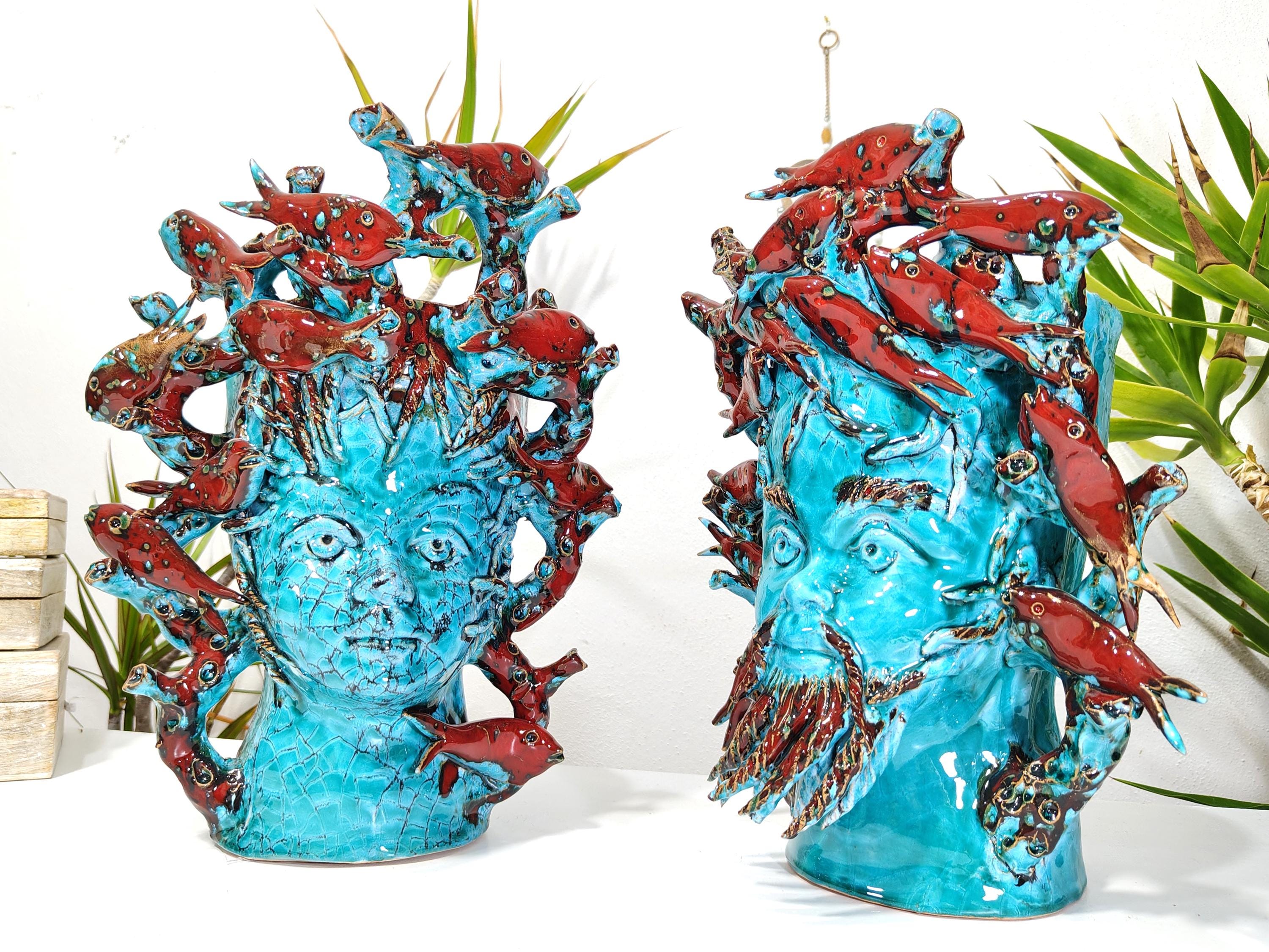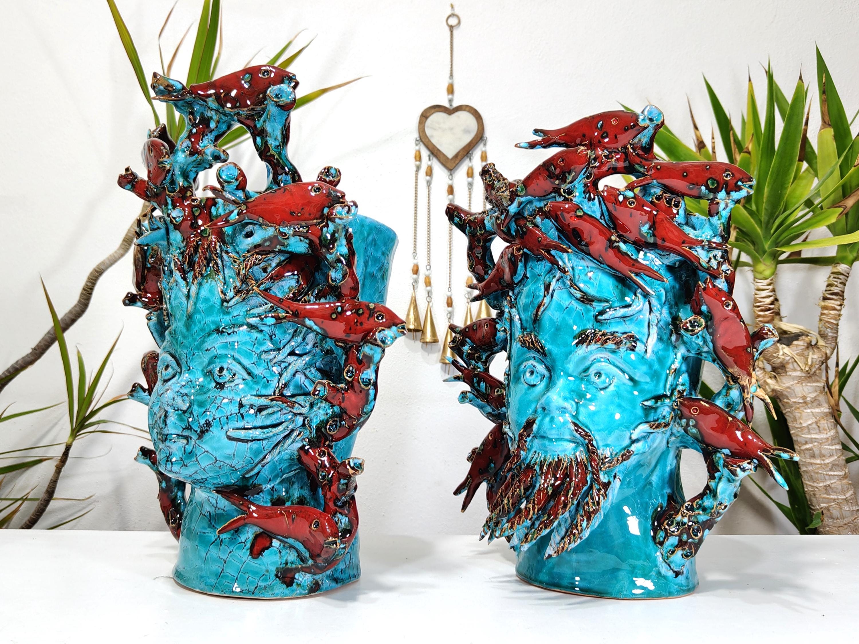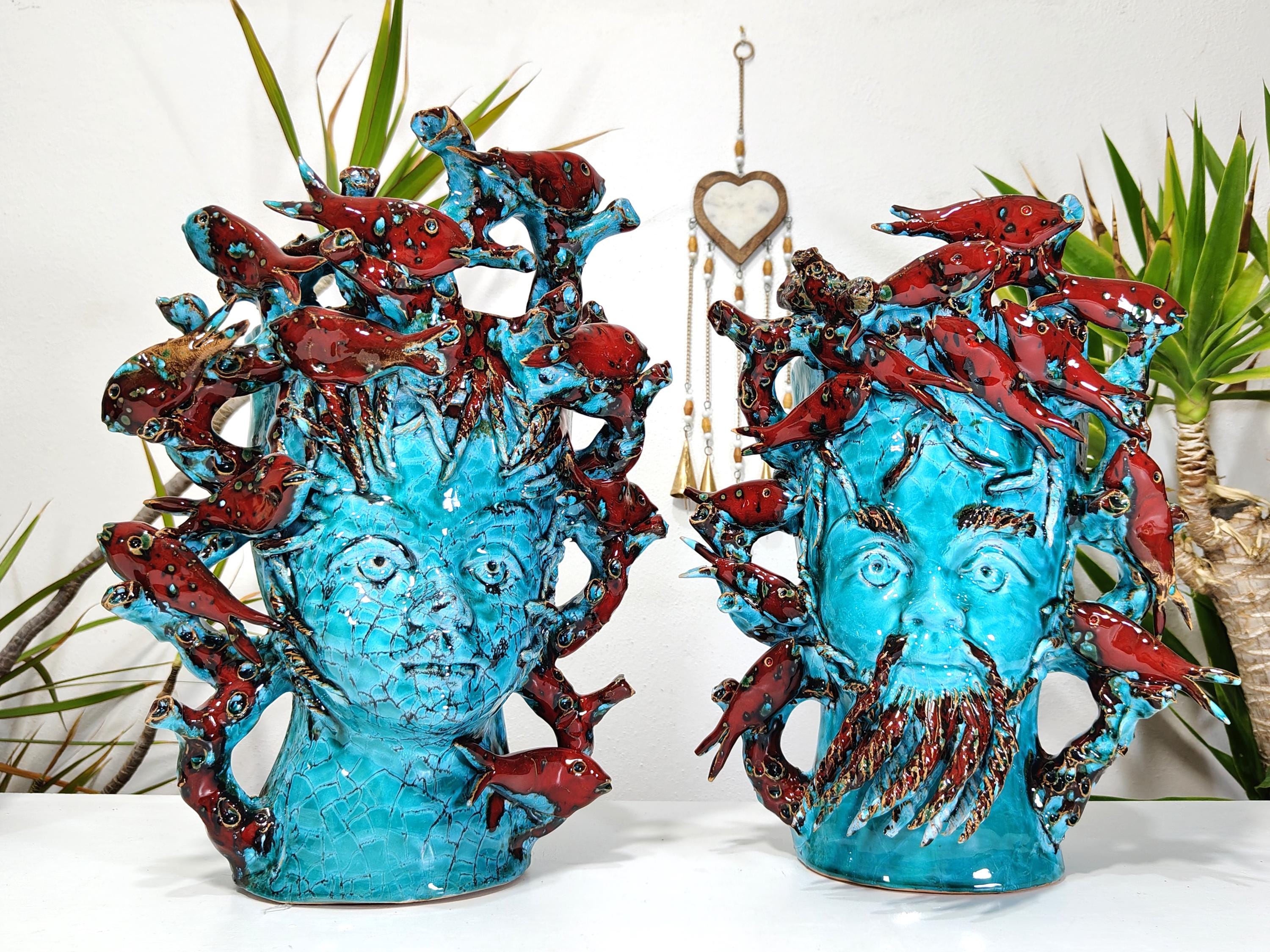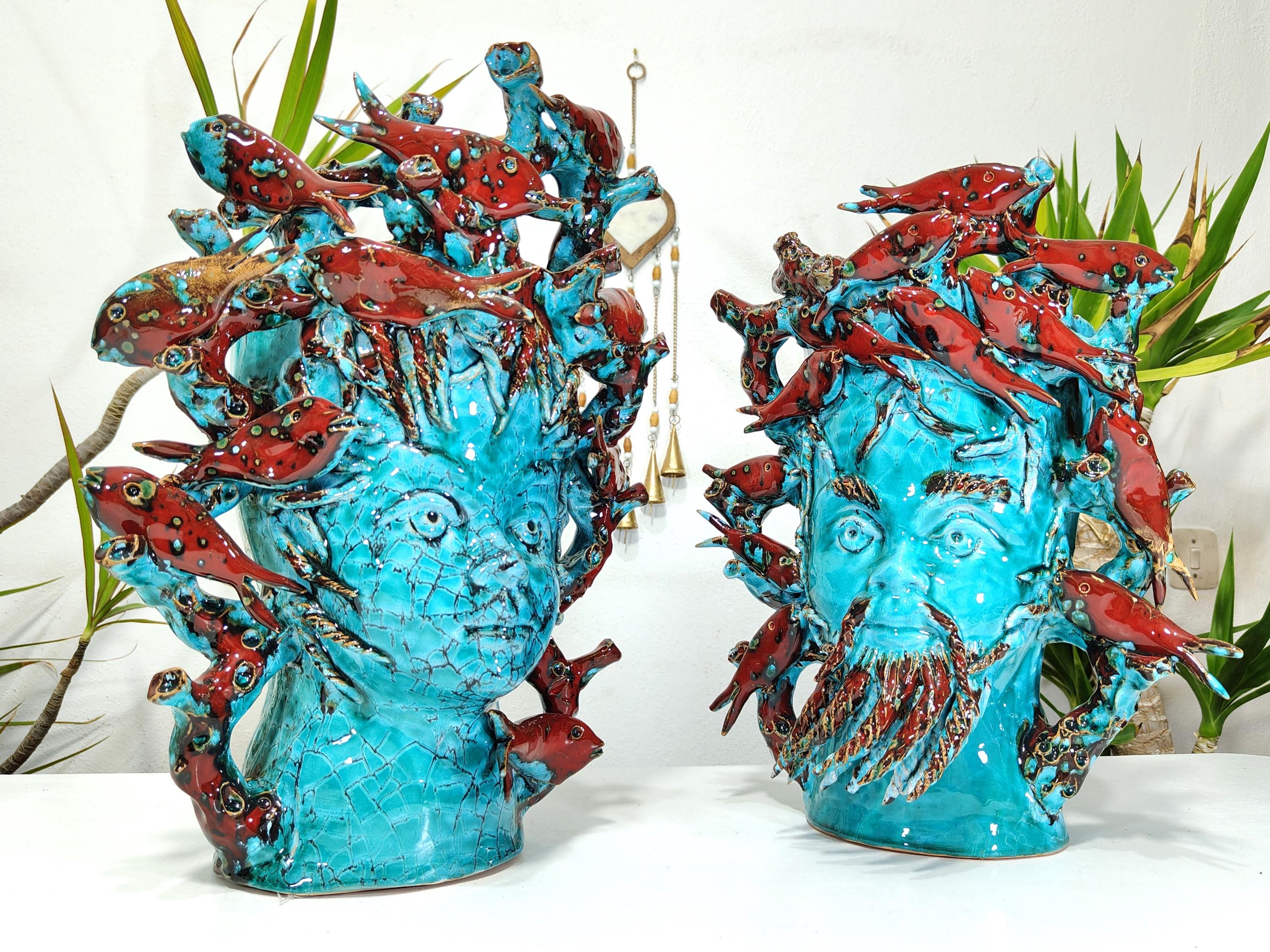 This particular pair of heads is decorated with a very complex technique: it is fired in the oven three times with overlapping colors instead of the typical two firings. This modern and complex technique called third firing gives it very particular shades.