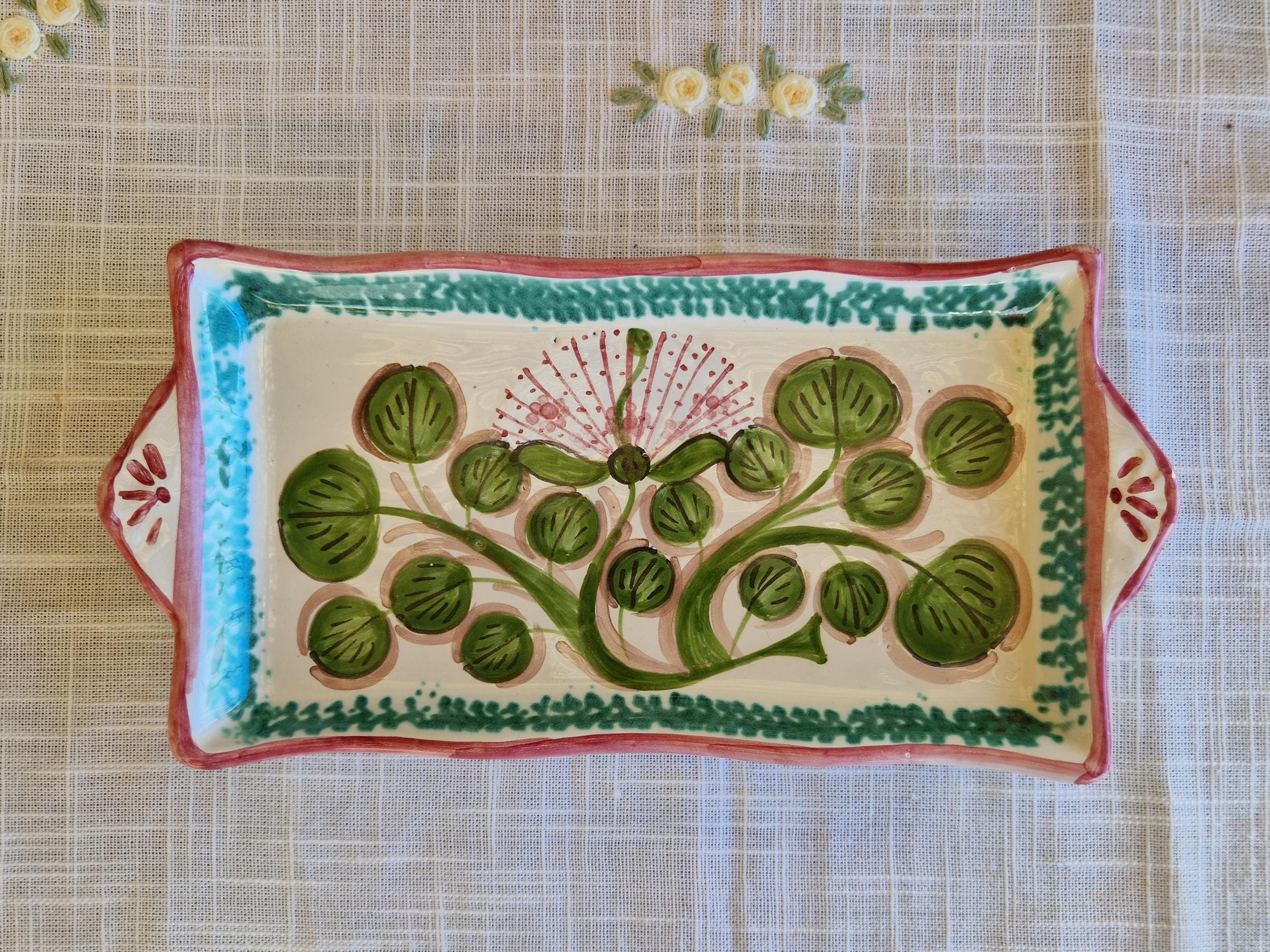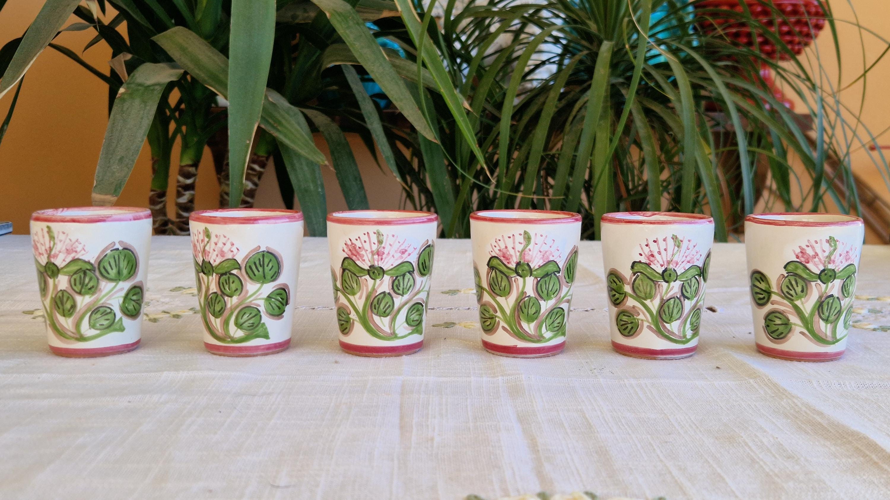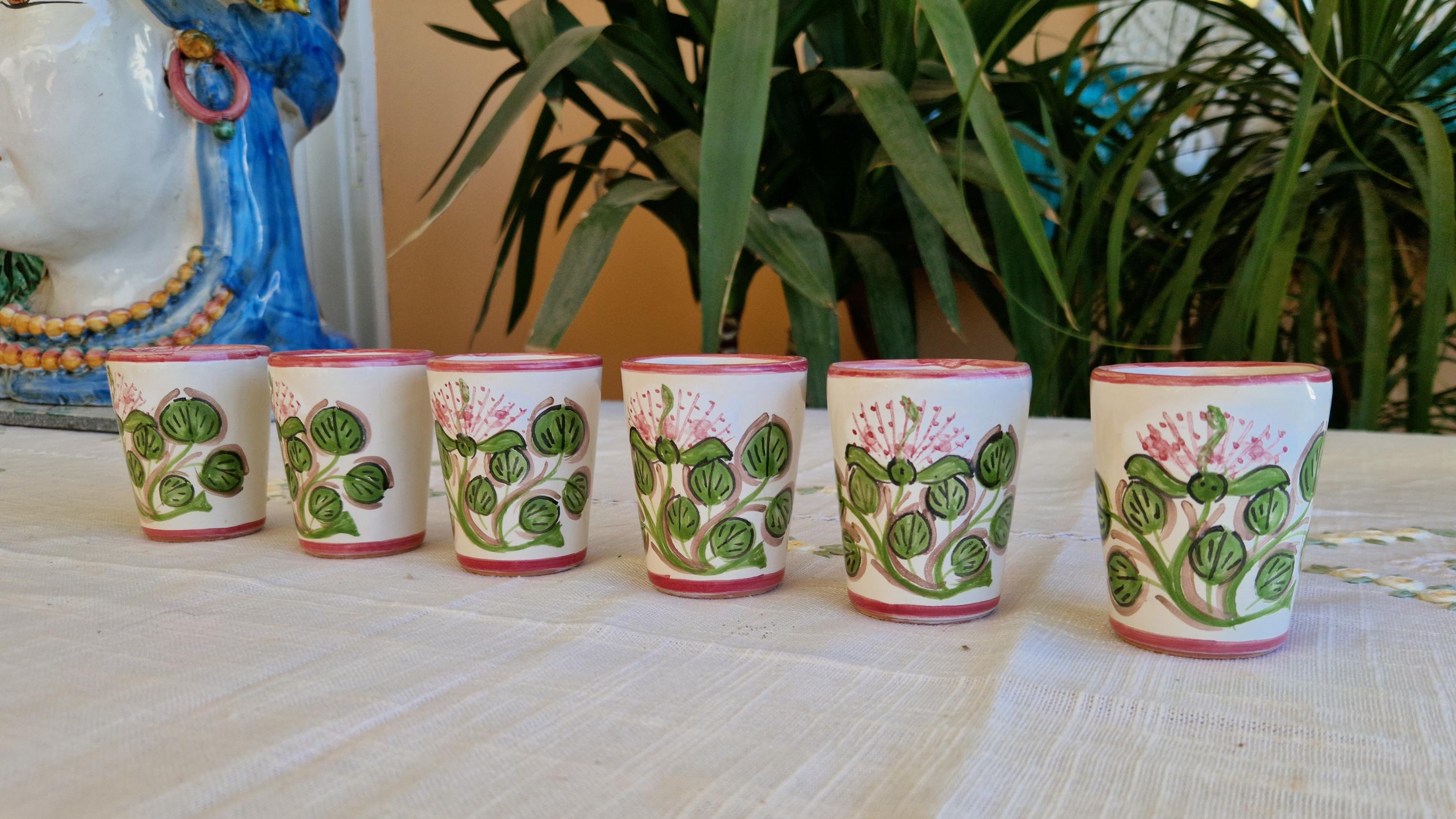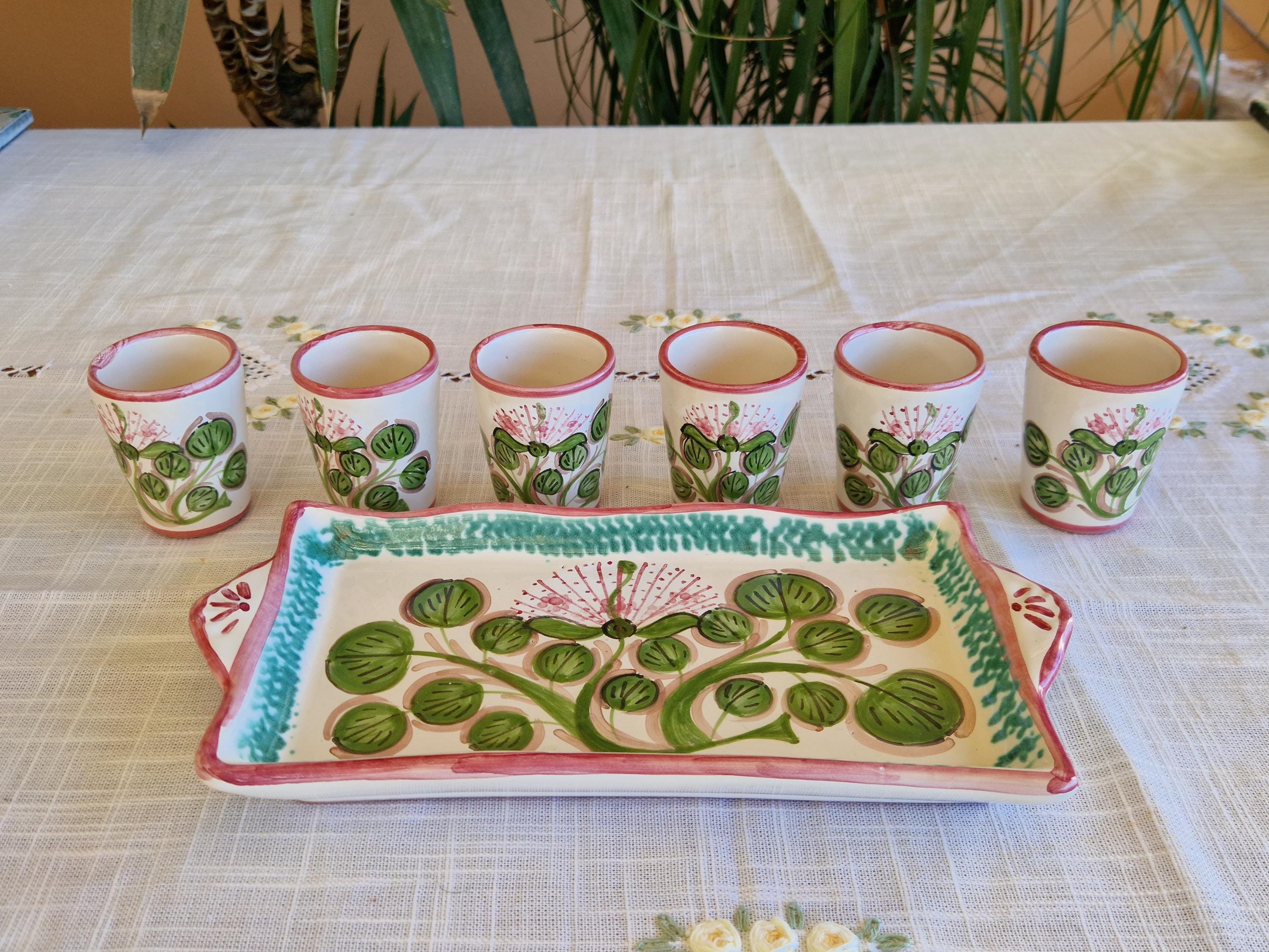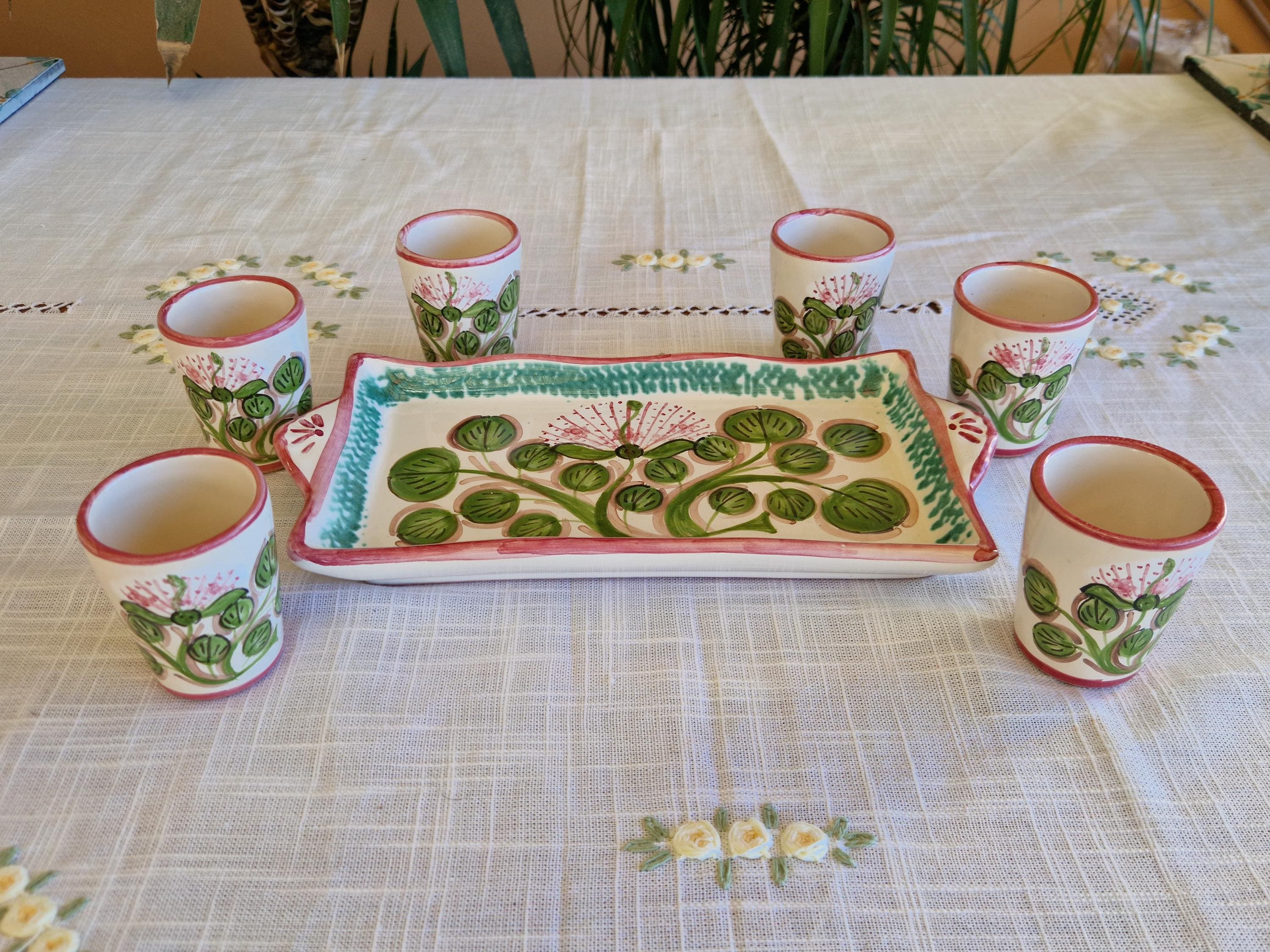 Service consisting of a rimmed tray with small glasses in Sicilian Aeolian handcrafted ceramic, decorated with Salina capers
